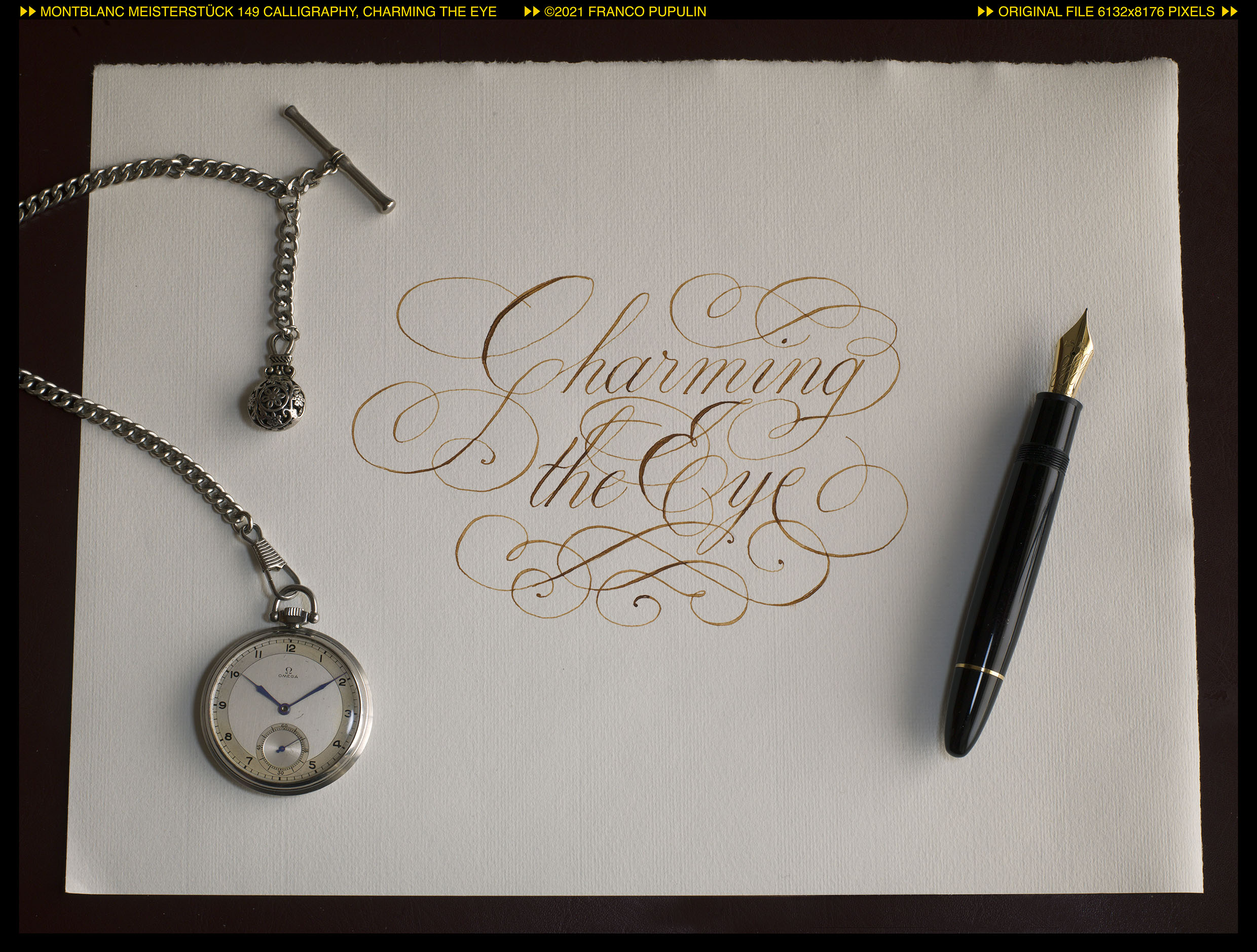 Ma l'incantesimo della Calligrafia é in realtá magia bianca, innocente, solare come le belle forme delle lettere e gli intrecci delle parole. Cosí ho deciso di fare una nuova versione del testo, su un foglio chiaro e luminoso. Per questo, e approfittando del fatto che l'inchiostro della mia Calligraphy era ormai sul punto di terminare, dopo averla lavata a fondo l'ho riempita, per la prima volta in un anno, con un inchiostro chiaro: il Diamine Golden Brown.