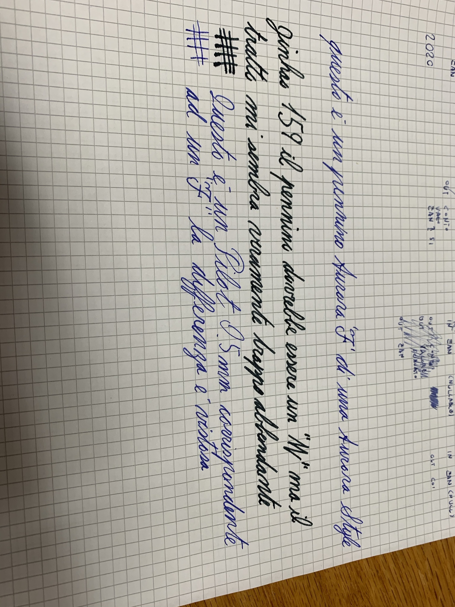 Allego foto della prova di scrittura a confronto con un roller punta 0,5 e la mia Aurora con pennino F per confronto. La jinhao è caricata con inchiostro nero R&K mentre l’Aurora con il solito Pelikan blu.