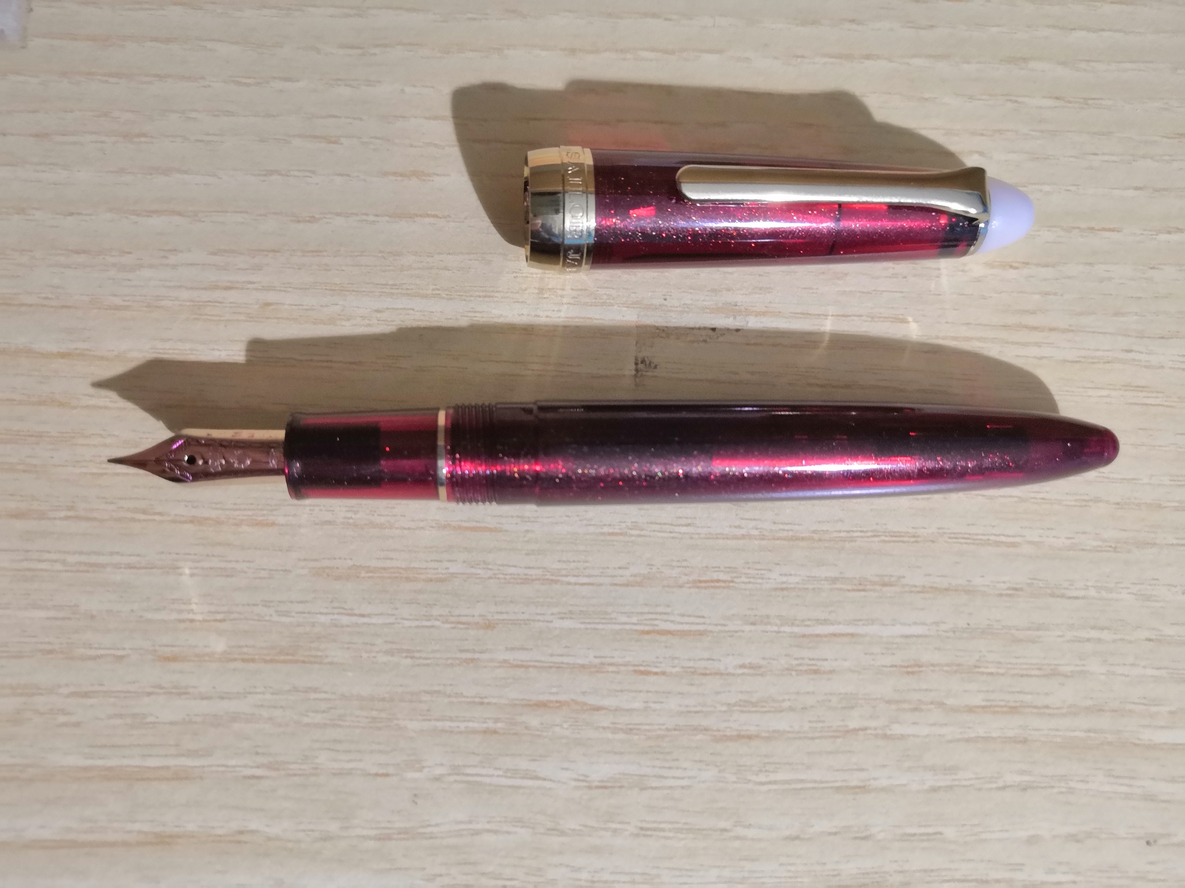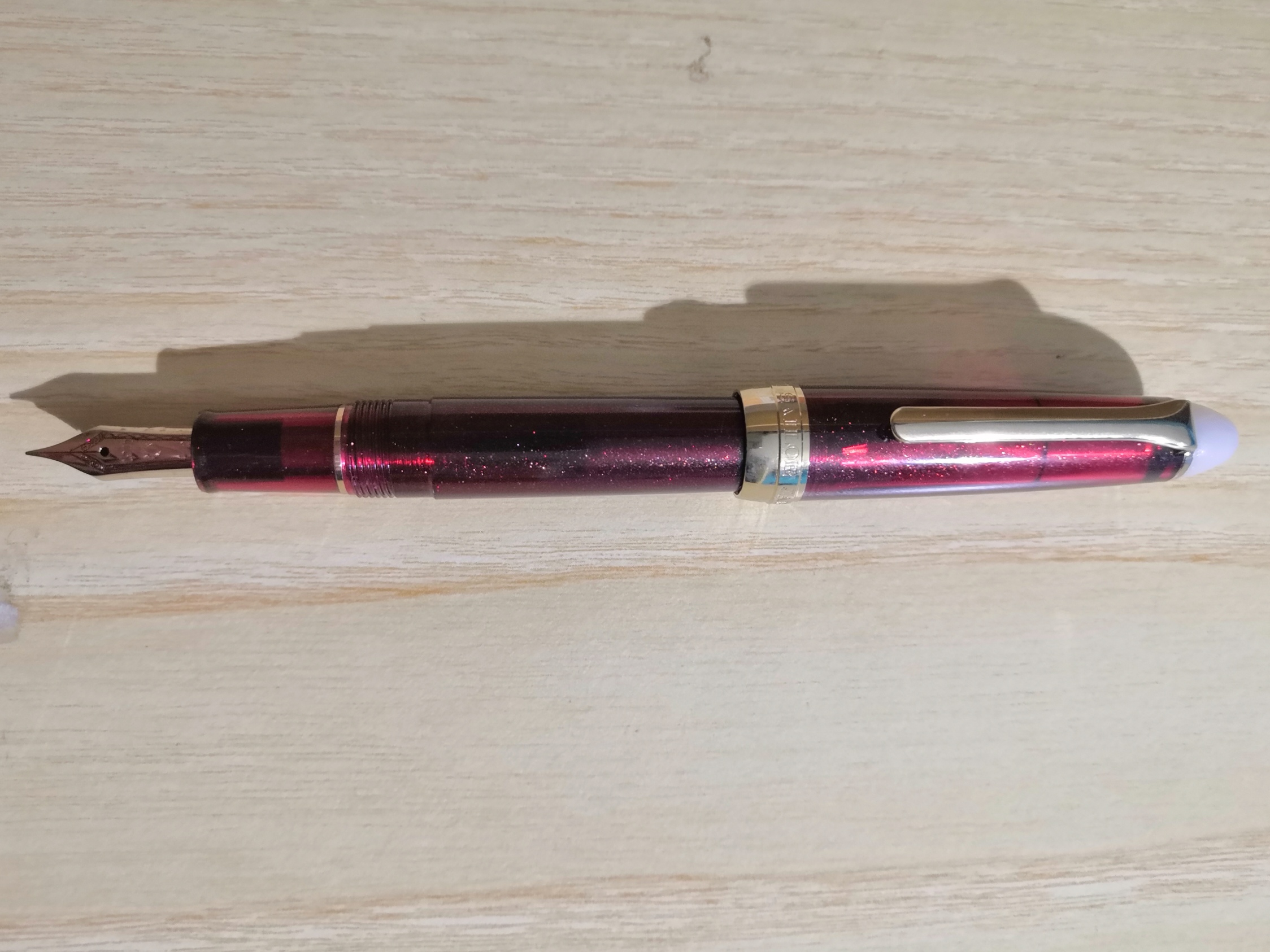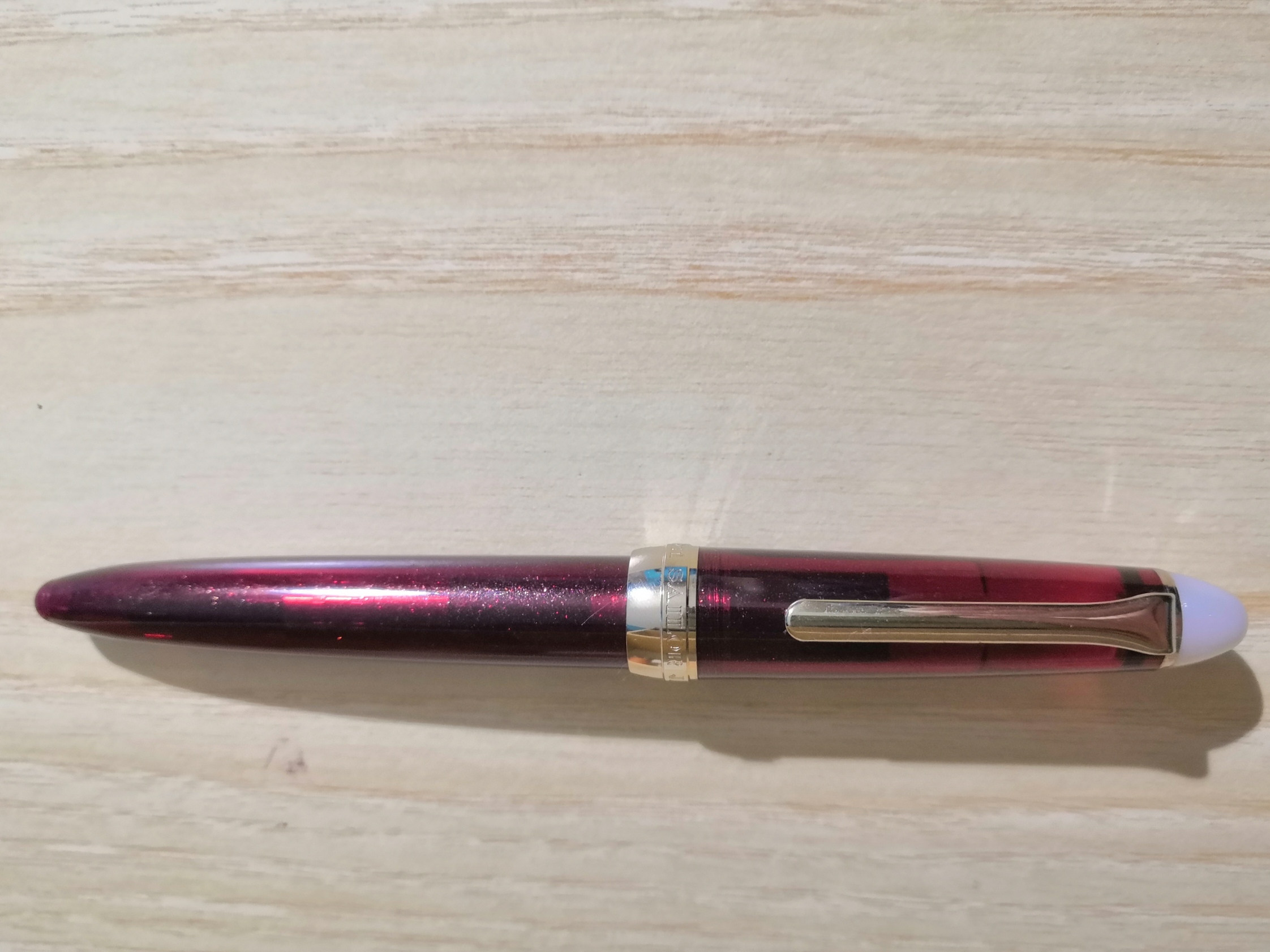 La penna, in plastica rosso bordeaux traslucido con qualche particella brillante, si presenta davvero bene. Si scrive molto delle plastiche Sailor, a mio avviso benché leggera, la penna sembra ben costruita e non ho l'impressione di un oggetto fragile.