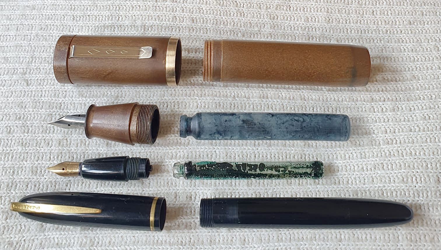 Le sorprese non finiscono mai!: questa Jumbo Pen anonima (pennino Nikeflex-Luma, ritengo non originale), assieme a tre sue "sorellastre" marcate, è l'unica stilografica da me vista in tanti anni con un tale caricamento a cartuccia di vetro e di tali dimensioni. Faccio notare un particolare: la testa del cappuccio non si svita come nelle originali ed il fermaglio è inserito ed ancorato a piegamento interno. Il segmento che lo segna a 360° è puramente decorativo. Qui con alcune Waterman's con lo stesso caricamento. In queste la cartuccia si inseriva dal cappuccetto di coda. Le altre due svitando il corpo penna come tutte quelle che seguiranno in plastica. Siamo negli anni ’30, poco prima dell’invasiva, stravincente entrata in scena di quest’ultima. Parlando di cartucce in vetro non posso non ricordare la Eagle-New York che tale sistema di caricamento brevettò nel lontanissimo 29 aprile 1890.