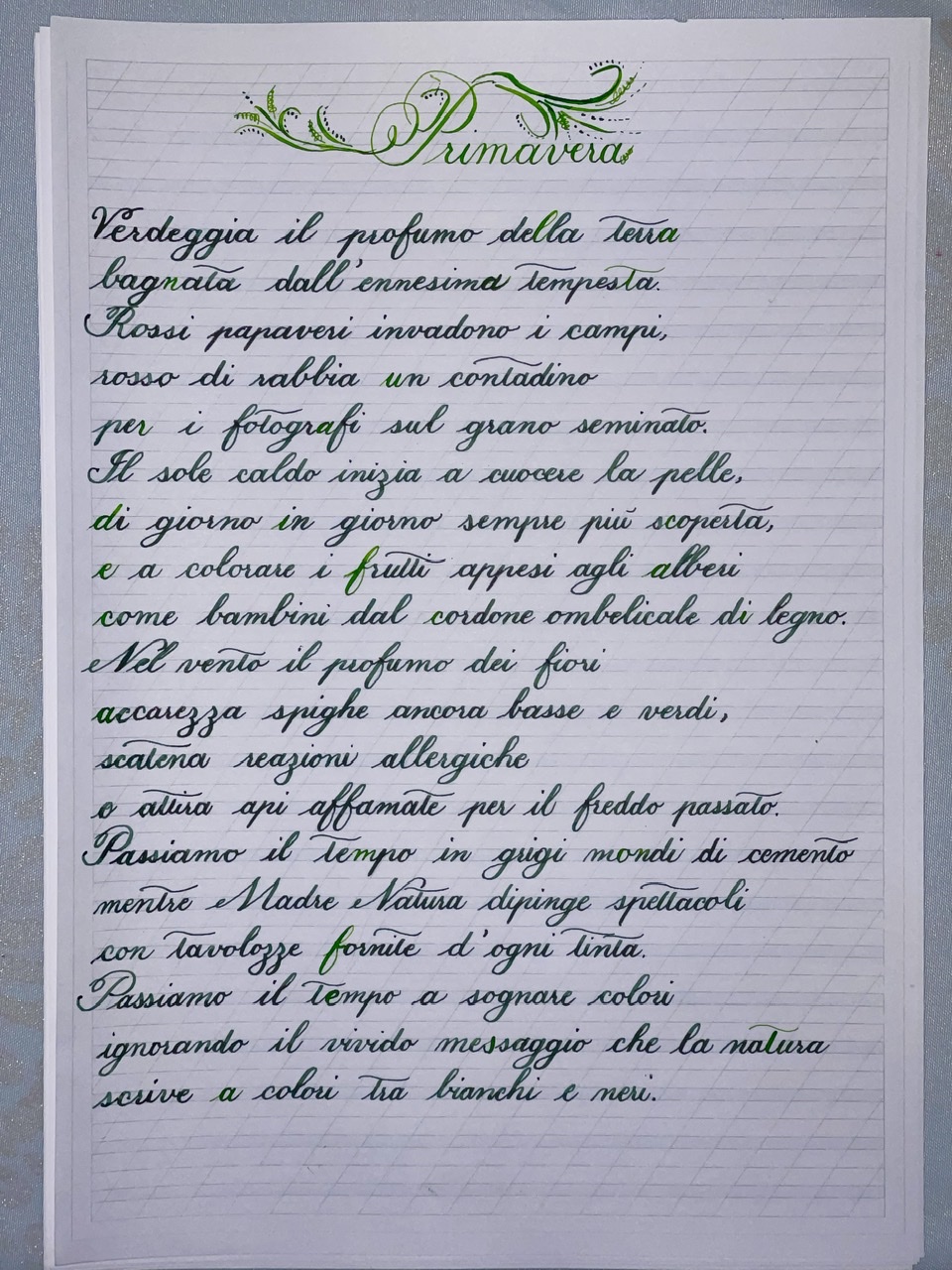 Un accenno al titolo e alla fioritura; la centratura del titolo non è perfetta (ma non disturba molto), naturalmente quando si operano delle fioritureè necessario tener conto del loro "peso" nella centratura. Hai giustamente usato un carattere più grande per il titolo con una misura sovradimensionata per la maiuscola: anche in questo caso disporre di un foglio più grande poteva permettere una maggiore libertà compositiva, sia come dimensioni del carattere sia come spazi. Sulla fioritura: premesso che è giusto provare e sperimentare, è altrettanto giusto fare a parte qualche prova per avere idea del risultato; in questo caso non mi pare ci siano delle prove a priori altrimenti avresti subito notato la disarmonia delle linee curve e quella causata dalla sovrapposizione di linee. Gli abbellimenti, come le maiuscole, devono essere provati e valutati a parte prima di passare al definitivo, in modo da avere movimenti fluidi e armoniosi della penna, senza incertezze e ripensamenti.