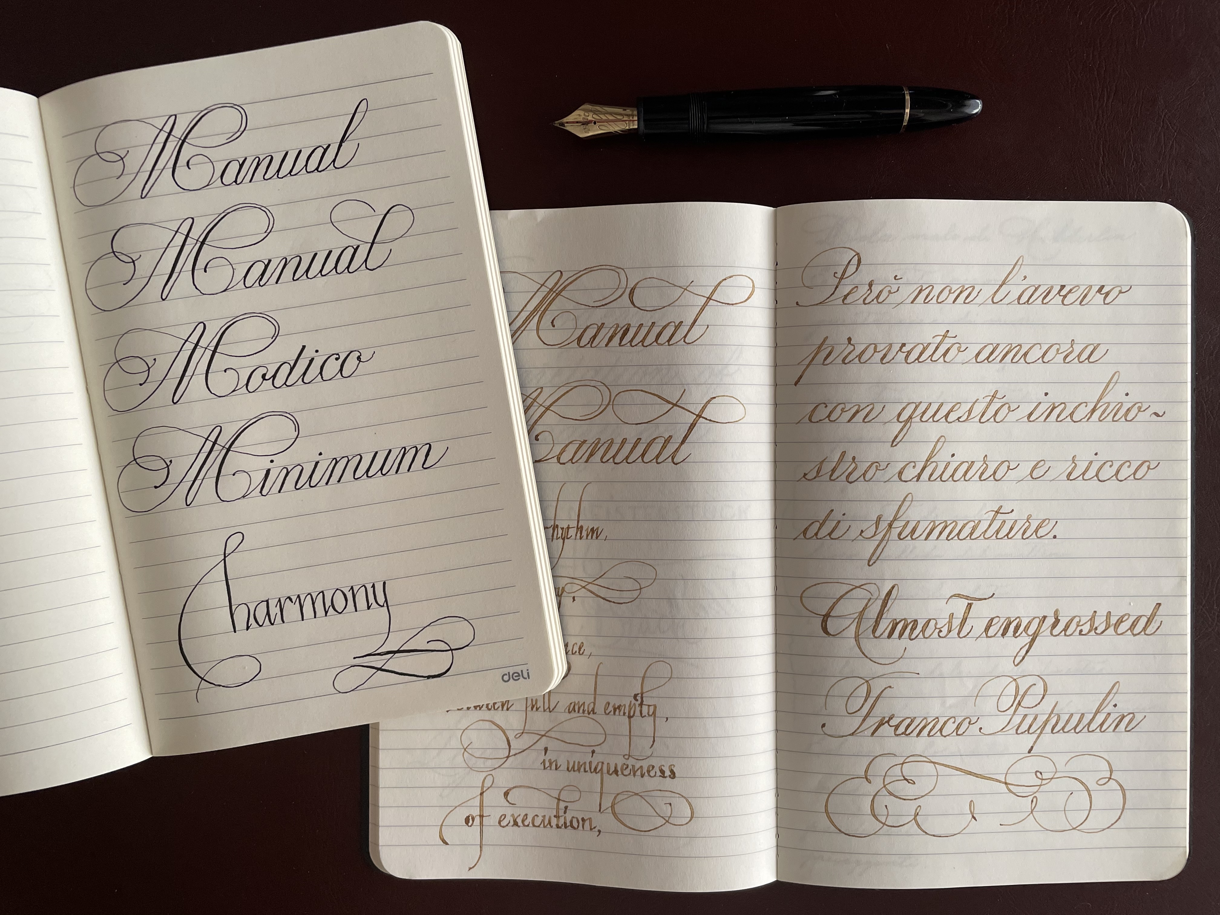 - non conosco la resa dei pennini delle stilo che hai usato, né la pesantezza/leggerezza della mano, vedo però che i fini non sono particolarmente fini quindi i pennini non permettono un tratto sufficientemente sottile, oppure la mano non è sufficientemente leggera, oppure la carta non è adatta, oppure una miscela di questi 3 aspetti. Per ovviare in prima approssimazione a questi inconvenienti è opportuno ingrandire la scrittura in modo che il contrasto fini/grossi sia più evidente;