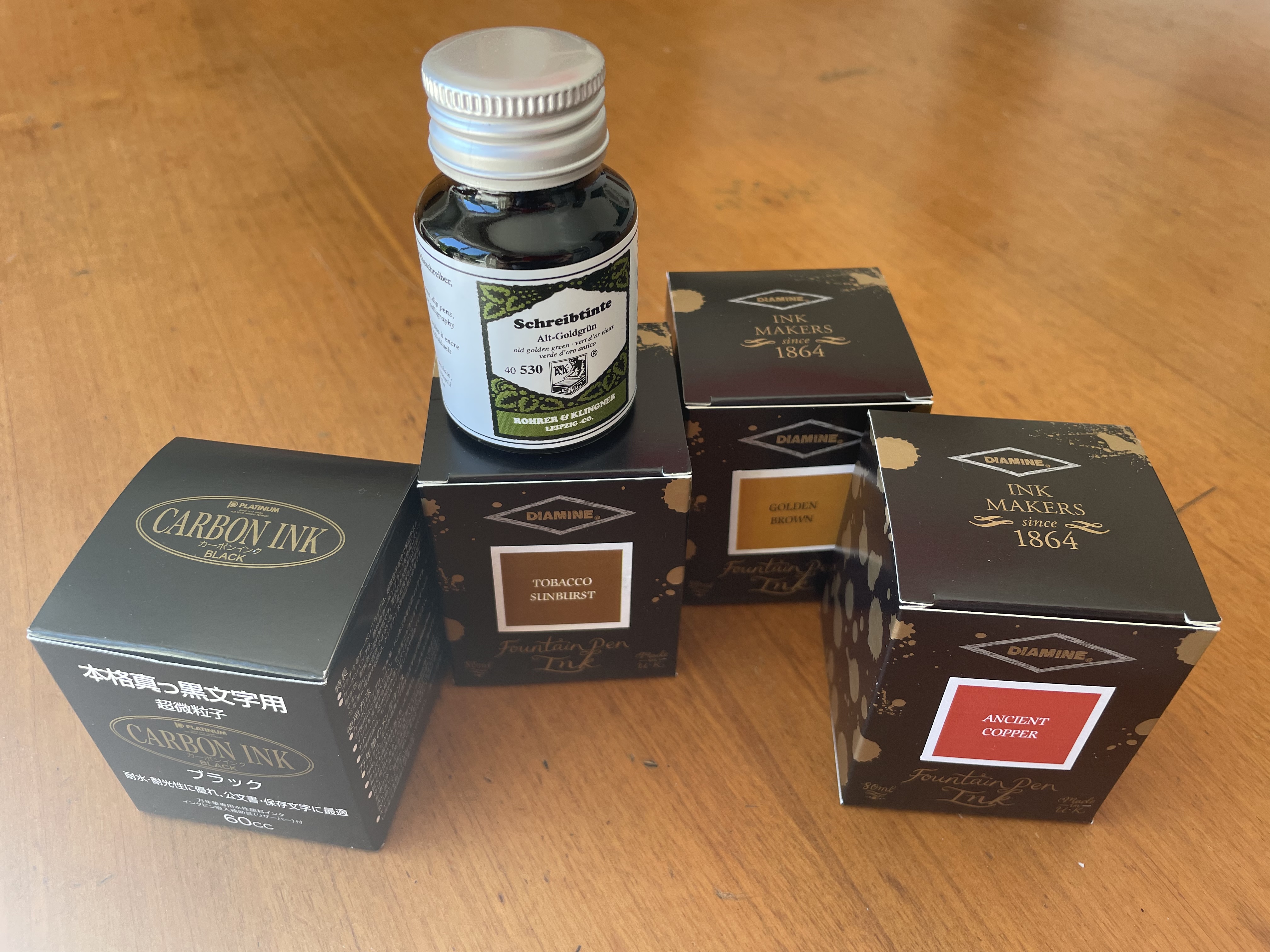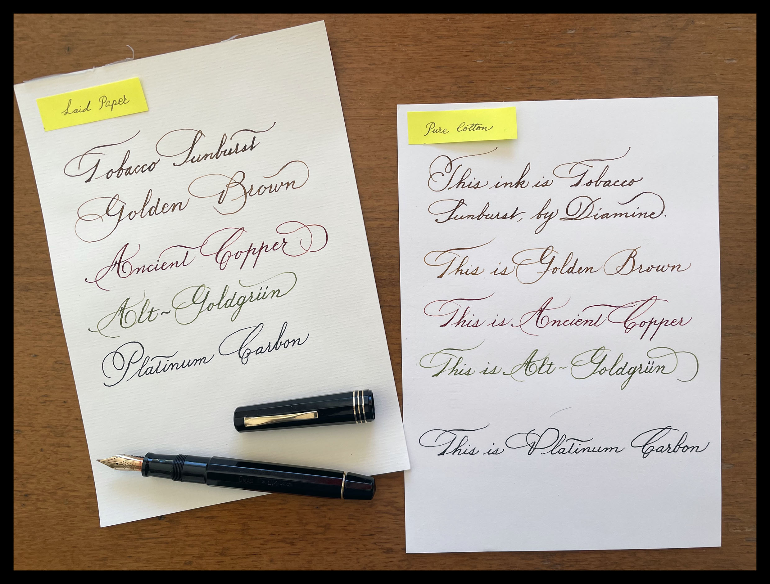 I tre Diamine hanno colori belli e si comportano come io preferisco: non allargano il tratto della penna, hanno sfumature intense e - direi - sono del tutto privi di "riflessi". Conoscevo giá il Golden Brown e avevo sentito parlare molto bene dell'Ancient Copper, che infatti mi é piaciuto molto, per colore e per comportamento sul foglio. Il "Tobacco Sunburst" é una novità in casa Diamine, ma trovo che abbia molte sfumature per un inchiostro marrone scuro: mi piace!