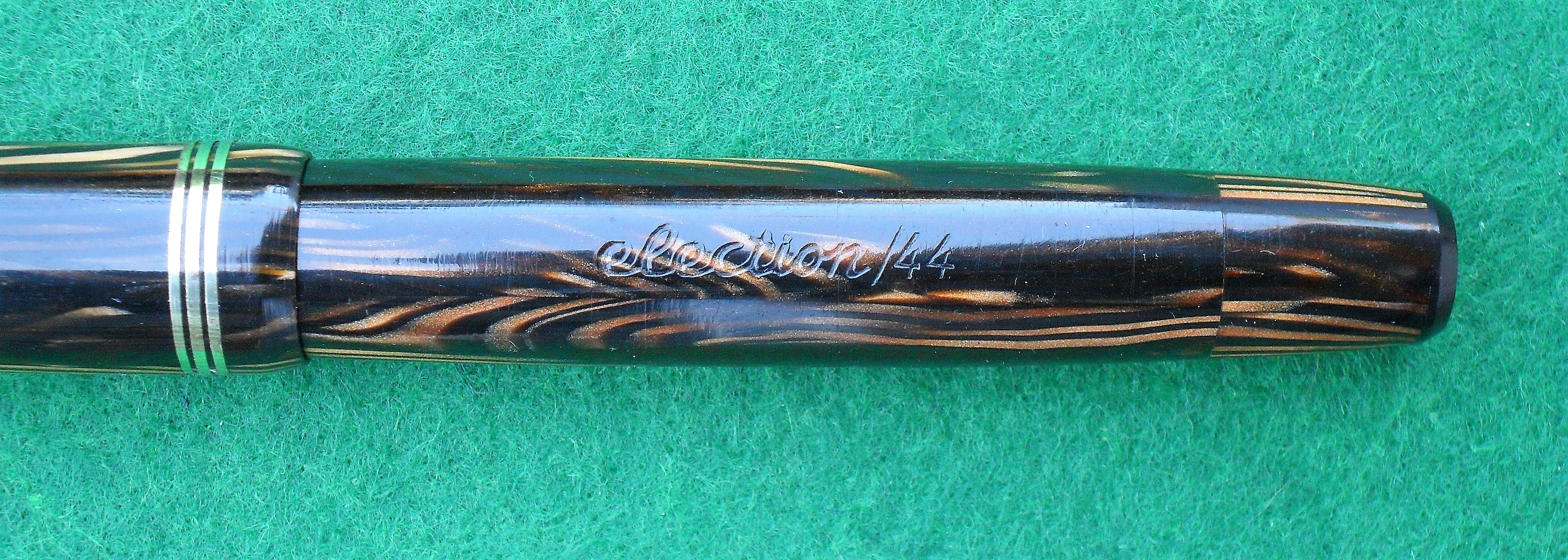 In Italia le famiglie attendono con ansia le lettere dei loro cari al fronte ed i razionamenti mettono un’ipoteca pesante sul futuro delle prossime generazioni. Nelle città, le maggiori delle quali purtroppo assaggeranno presto i bombardamenti aerei, si vive ancora l’atmosfera surreale d’una vita “normale” dominata dall’ansia, dalla propaganda e da illusioni che ben presto, solo l’anno successivo, svaniranno come neve al sole. E’ in questa realtà che nasce negli stabilimenti d’una ditta del torinese la stilografica che vi presento oggi, testimone muta del coraggio silenzioso di chi, pur in frangenti tanto drammatici, affrontava, nel miglior modo possibile, le sue esperienze di vita. Pur non trattandosi d’una penna di pregio particolare, la Election/44 mi ha incuriosito, complice la mia passione per le stilografiche degli anni Trenta e Quaranta, specialmente se belle come questa.
