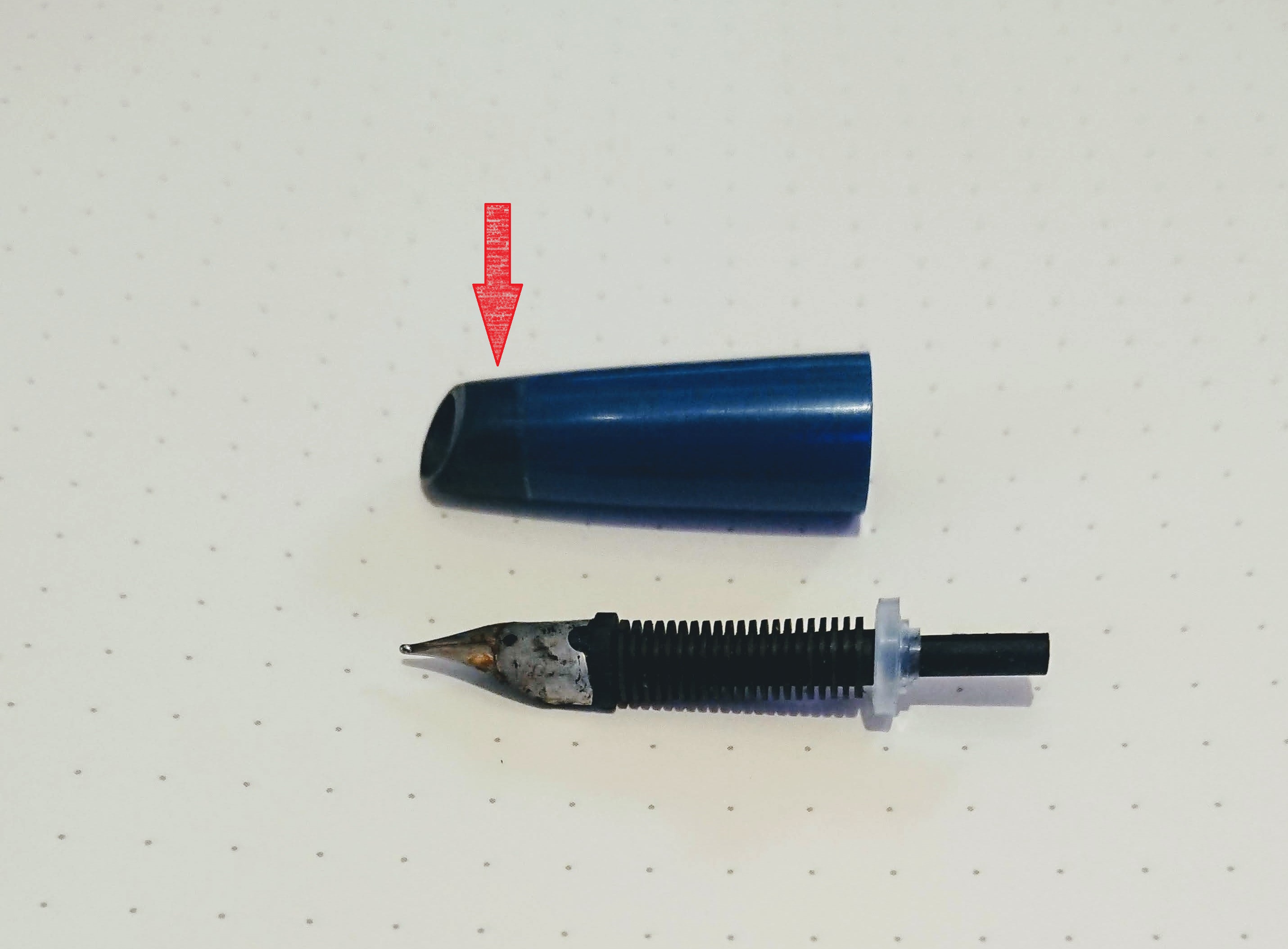 Ho da poco intrapreso una piccola raccolta di queste penne e trovo che quasi sempre quelle che vengono vendute nei vari mercatini presentano una macchiatura circolare sulla sezione, in corrispondenza della parte vicina al pennino (vedi foto). Ho letto nel forum che questo è dovuto al fatto che a suo tempo questa penna veniva commercializzata con la cartuccia già installata ed un piccolo cappuccio di plastica di protezione del pennino (da buttare via una volta aperta la confezione). Nelle penne che sono rimaste invendute l'inchiostro della cartuccia è lentamente evaporato e i vapori sono rimasti chiusi dentro il cappuccio di protezione, macchiando la plastica della sezione.