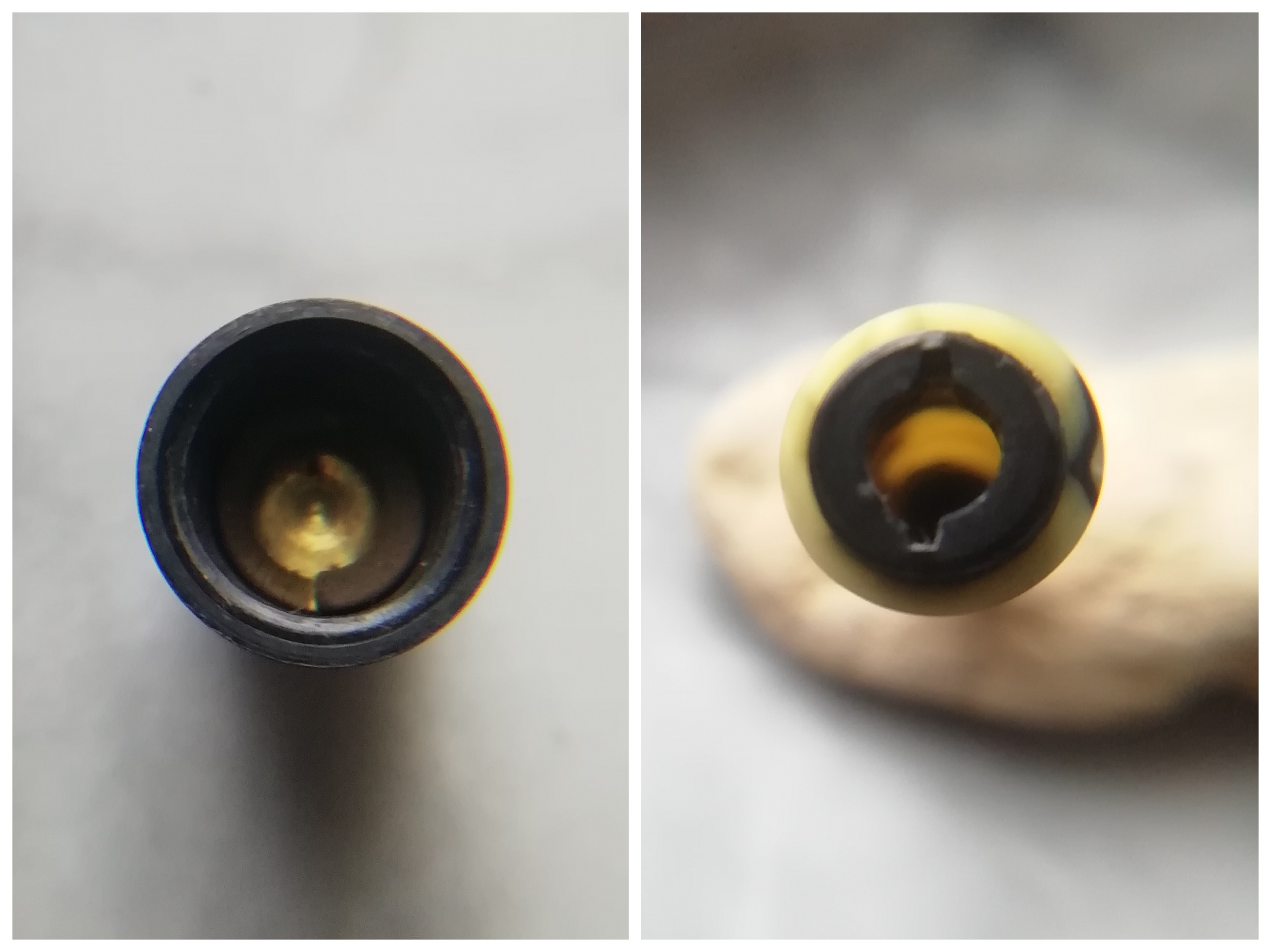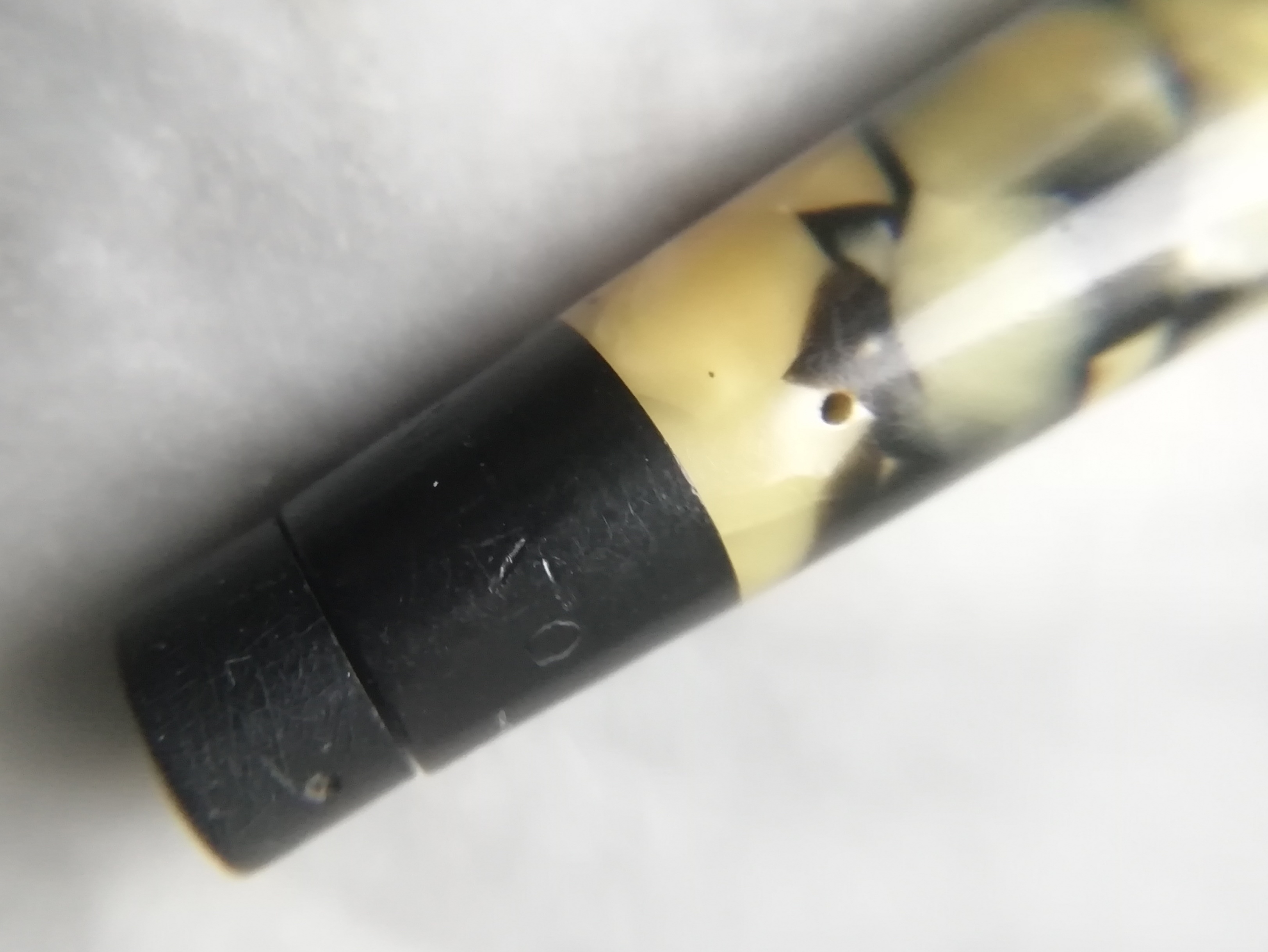 Questo particolare, unito alla presenza del foro di sfiato e all'utilizzo di celluloide colorata su tutto il fusto, mi fa sorgere l'idea che forse i due sistemi inizialmente erano mutuati dall'esigenza di ridurre i costi utilizzando parti uguali pur con caricamenti differenti.