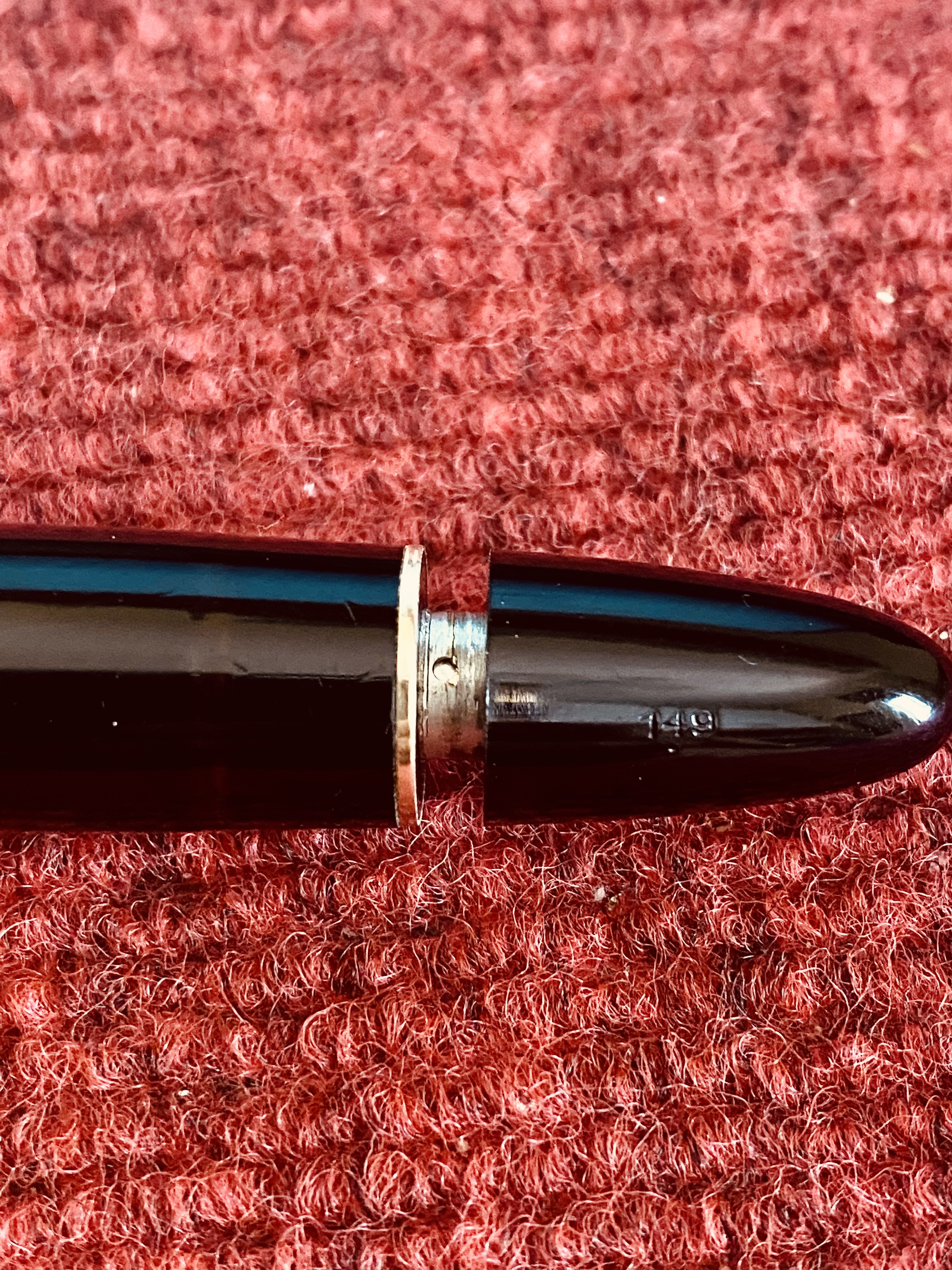Ma trovare una 149 realizzata agli albori della produzione di questo modello è un'altra faccenda, a parte il fascino che porta con se un oggetto che ha attraversato tanti anni, parliamo di una penna che con l'attuale modello condivide solo quel che per molti è il più classico ed elegante dei design che una stilografica possa avere. La 149 fu prodotta a partire dal '52, e i primi modelli noti anche come Silver Rings, erano realizzati in celluloide. La celluloide fu impiegata fino al '62, quando fu introdotto l'uso della resina plastica nella sua produzione. Il nome Silver Rings proviene dal fatto che i due sottili anelli sul cappuccio erano appunto realizzati in argento. Inoltre i modelli per l'esportazione non recavano l'incisione Meisterstück sulla vera del cappuccio bensì, come questo esemplare, la scritta Masterpiece. La stella sul cappuccio, a differenza delle moderne Montblanc, erano di un colore bianco avorio, alcuni credono che siano ingiallite con il tempo ma questo era il loro colore originario.