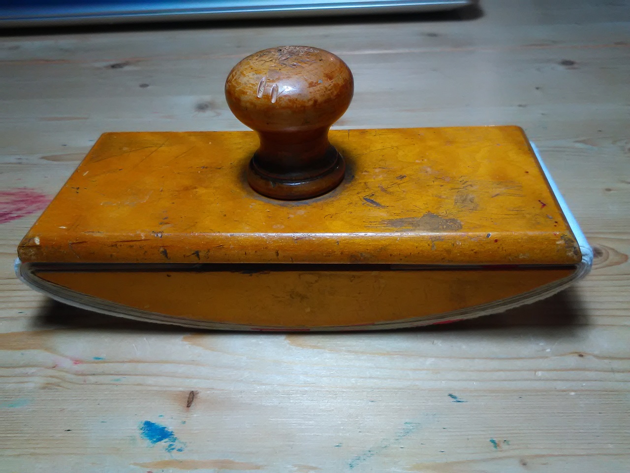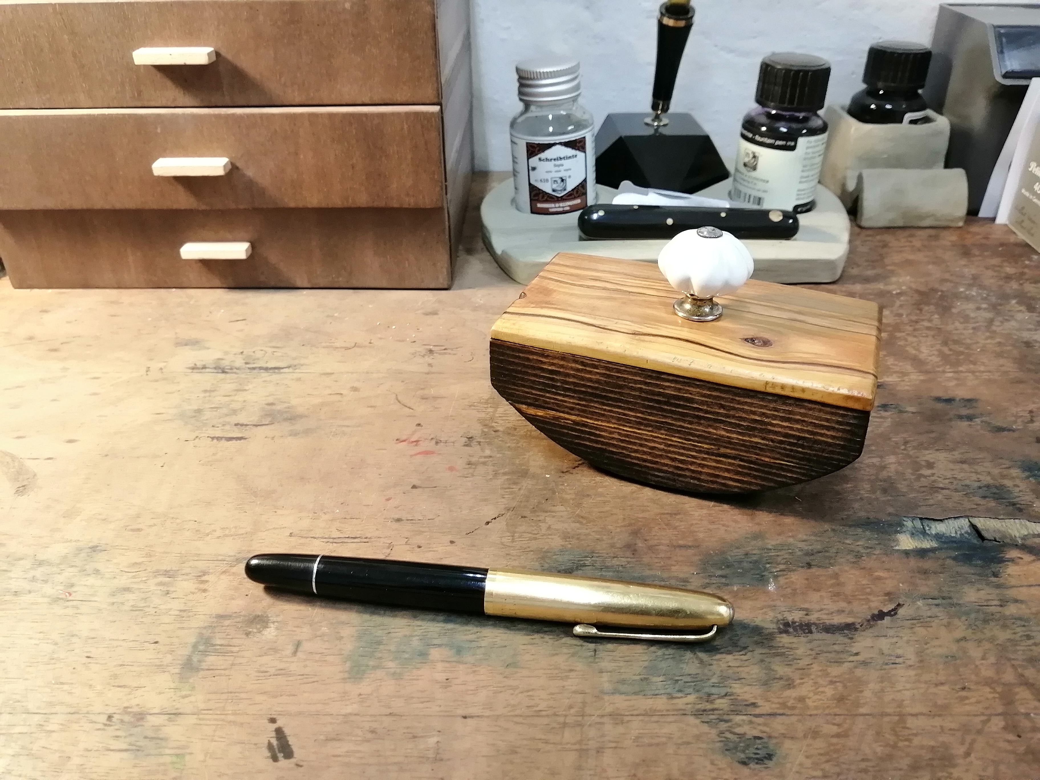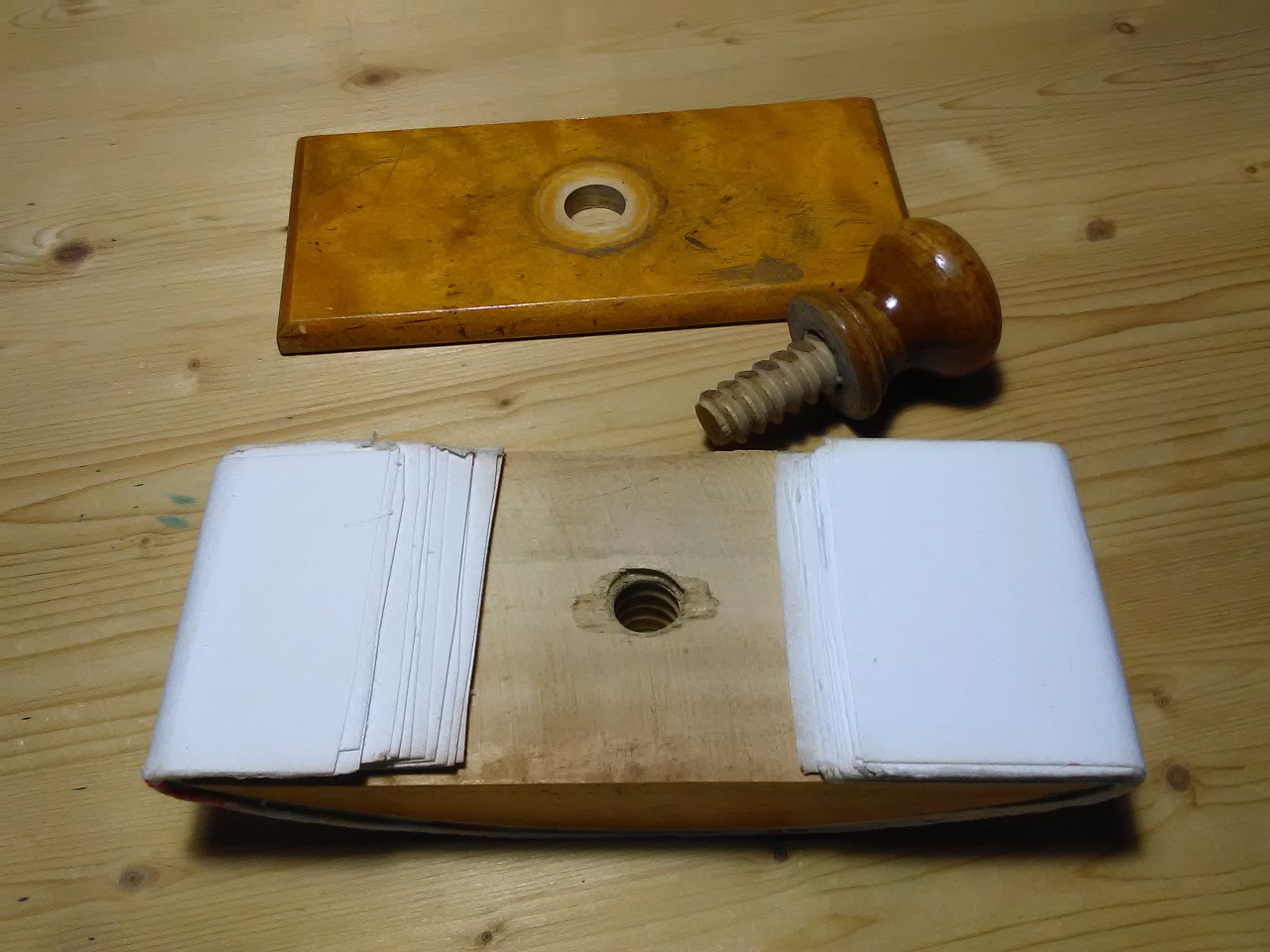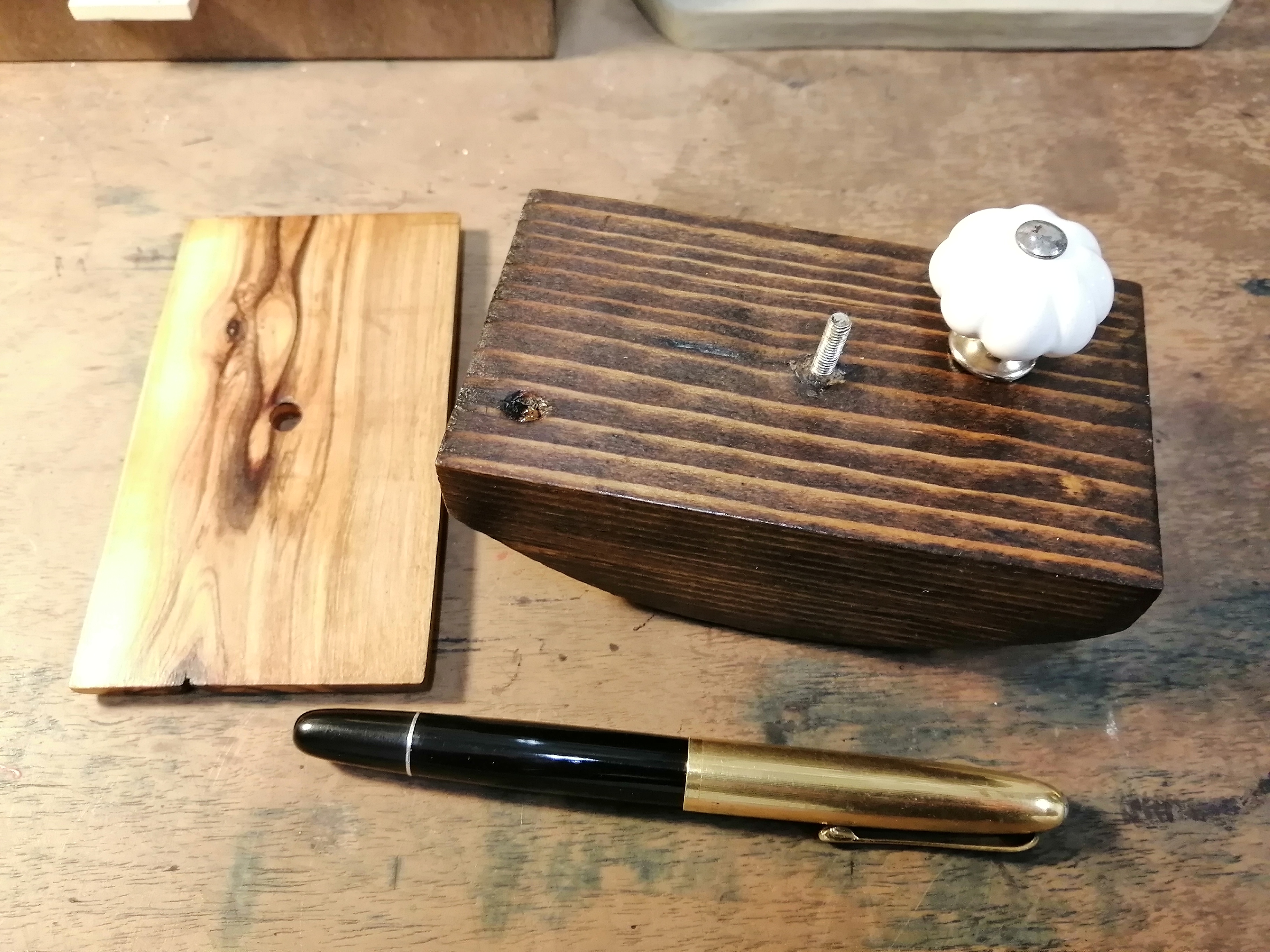 Mi sono costruito un tampone per inchiostro con dei pezzetti di scarto di ulivo e abete ed un pomello di un vecchio cassetto (allego foto).