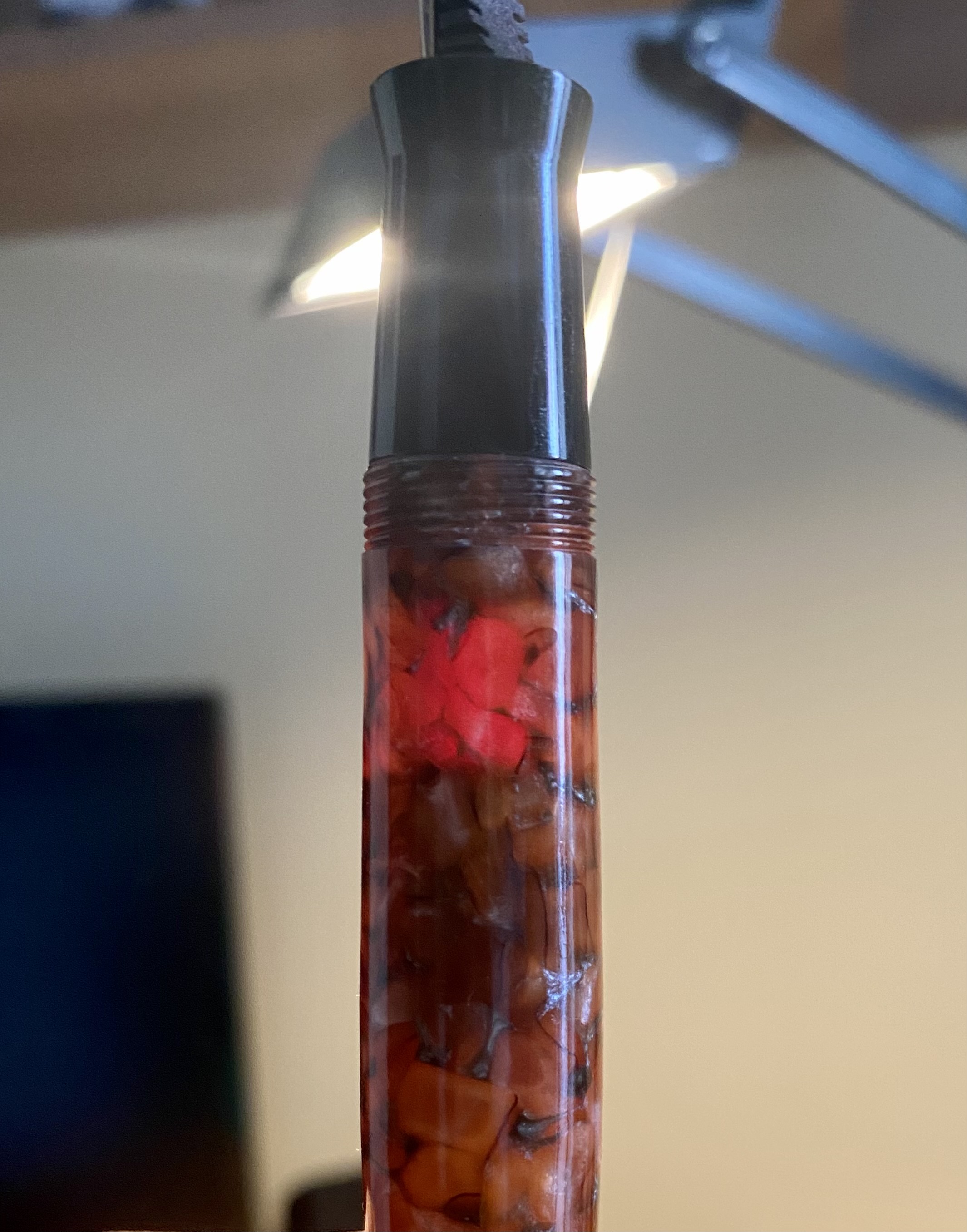 Mi sono lasciato attrarre dalle sue calde tonalità e la semitrasparenza del materiale grazie alla quale il fusto si riempie di luce acquistando ancora più calore e profondità. Eccone un particolare in cui cerco di mettere in risalto la bellezza di questo materiale pervaso di luce: