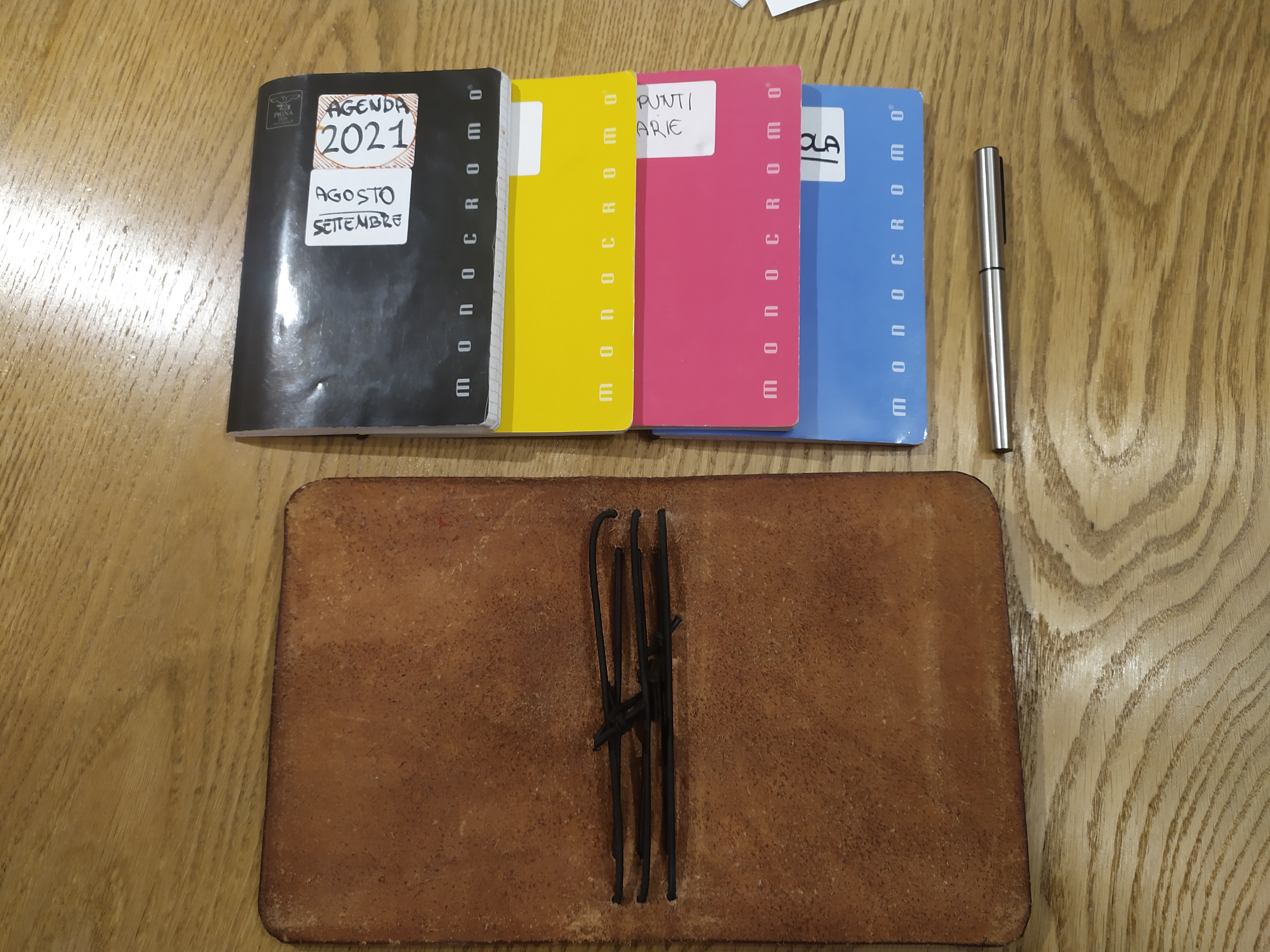 Cerca fauxdori, si trovano un sacco di tutorial su come fare le copertine. Alla fin fine è un rettangolo di qualche materiale con un paio di elastici in posizione strategica; io ne ho fatti con un cartoncino effetto pelle che è semplicissimo da lavorare ( https://forum.fountainpen.it/viewtopic. ... 16#p247016 ), forse meno duraturo della pelle, ma comunque dovrebbe garantire durata di svariati anni, e il costo totale per copertina era sotto i 2 euro.