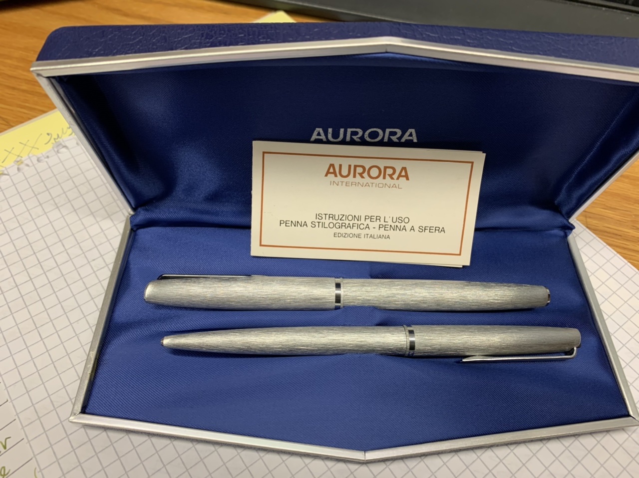 Ciao a tutti, ieri ho visitato uno di quei luoghi di lussuria e tentazione che sono i mercatini dell’usato, stavo cercando una lampada a stelo da mettere in cantina e ne sono uscito con una parure Aurora 98 stilo e sfera credo mai usata, con tanto di scatola a un prezzo abbastanza ridicolo.
