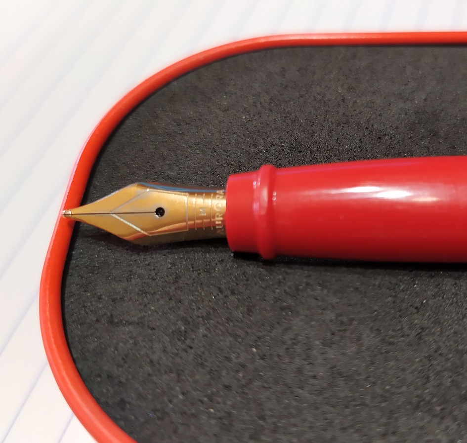Completamente in plastica (resina ?), clip in metallo e pennino M, ora carica con cartuccia Aurora black.