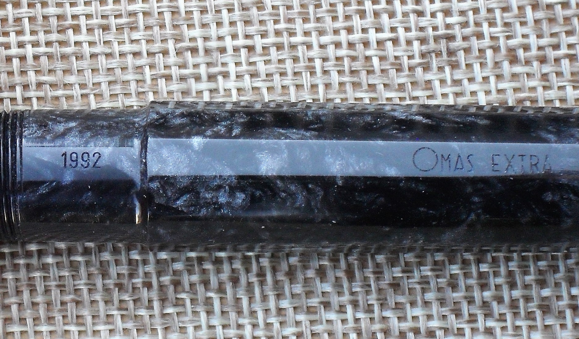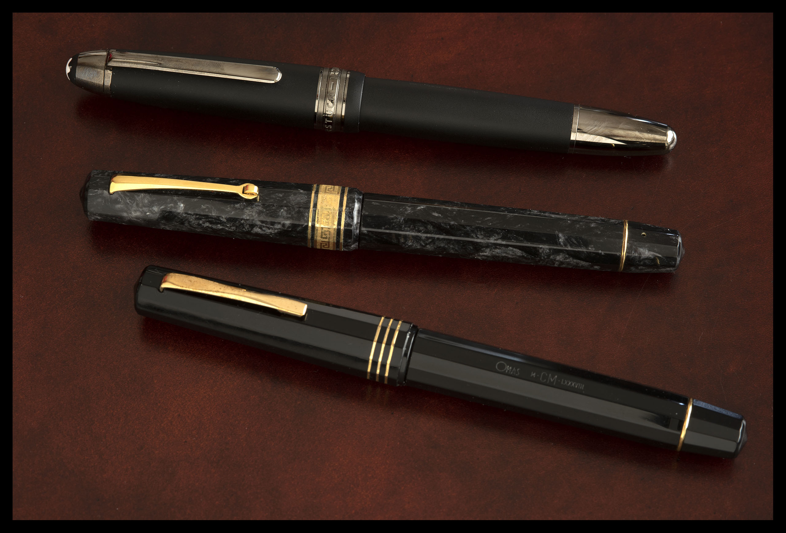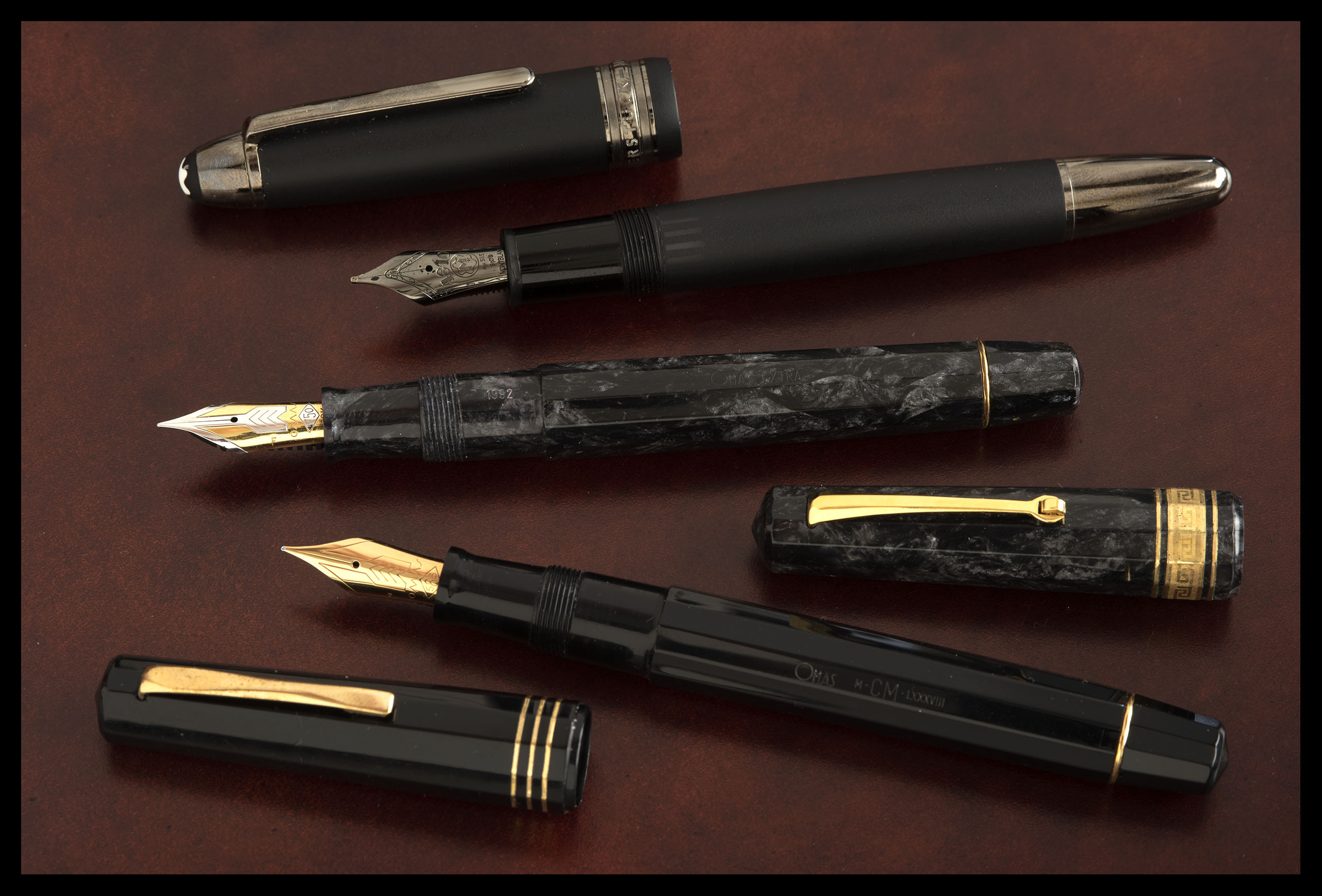La Omas Extra in celluloide nera marmorizzata (in secondo piano) é forse più elegante per il suo colore nero-non-nero. In questo colore di celluloide la Extra fu prodotta solo per uno o due anni, nel 1992-1993, per essere poi sostituito dalla celluloide nera screziata, ugualmente bella ma un po' meno elegante. Io ci ho messo vent'anni per riuscire a trovare una nera marmorizzata nuova.