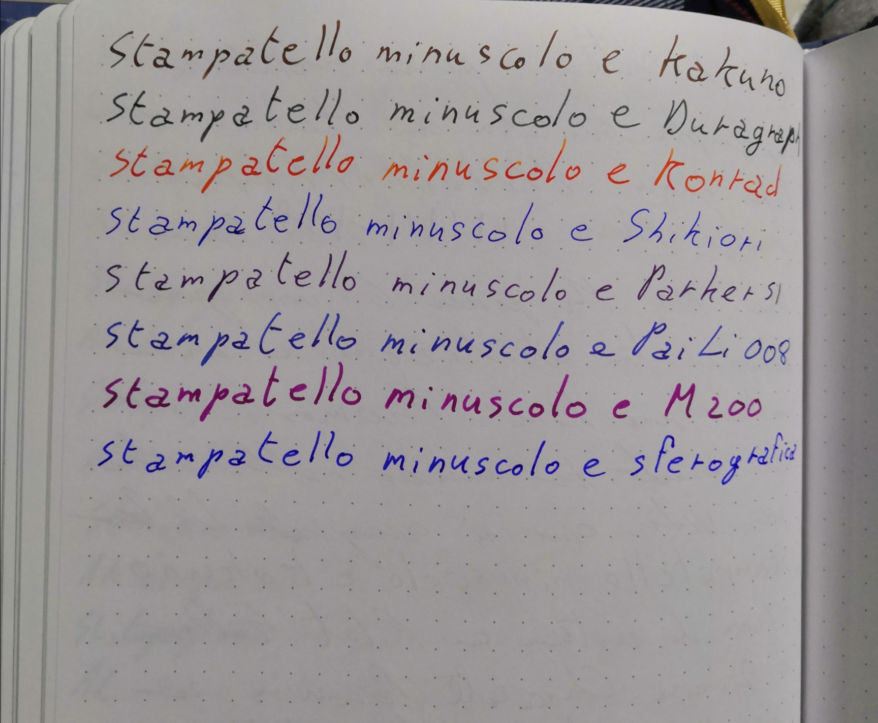 Se può servirti per farti una idea del tratto, questa è una piccola prova fatta oggi su carta Clairefontaine. La Shikiori è un F, è praticamente la stessa penna della Sailor Proolor, ma con un vestito diverso. La Pelikan M200 è con pennino medio, che è un medio che si affaccia al broad. Di solito, la carta Clairefontaine tende a far ottenere un tratto più sottile, di poco. Non spande