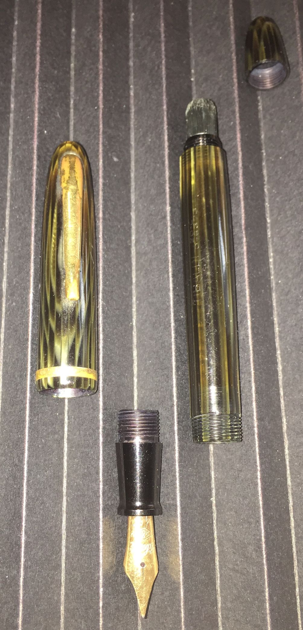Ciao. Ne ho una uguale ma nera. È in celluloide, bel pennino flex. La mia ha alimentatore in ebanite se non ricordo male .Anni 50/60? La mia scrive molto bene ma essendo piccolina non carica troppo inchiostro.