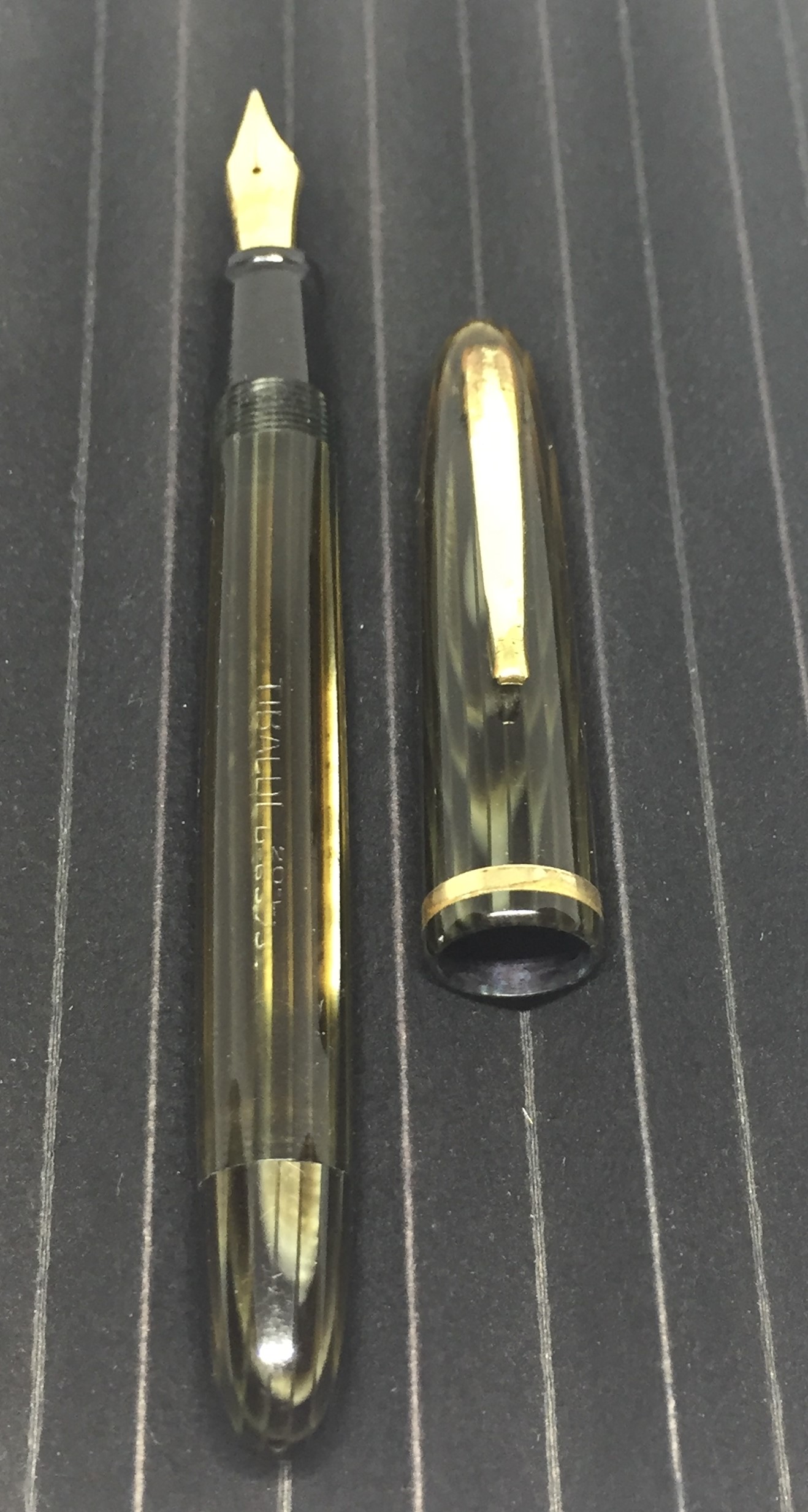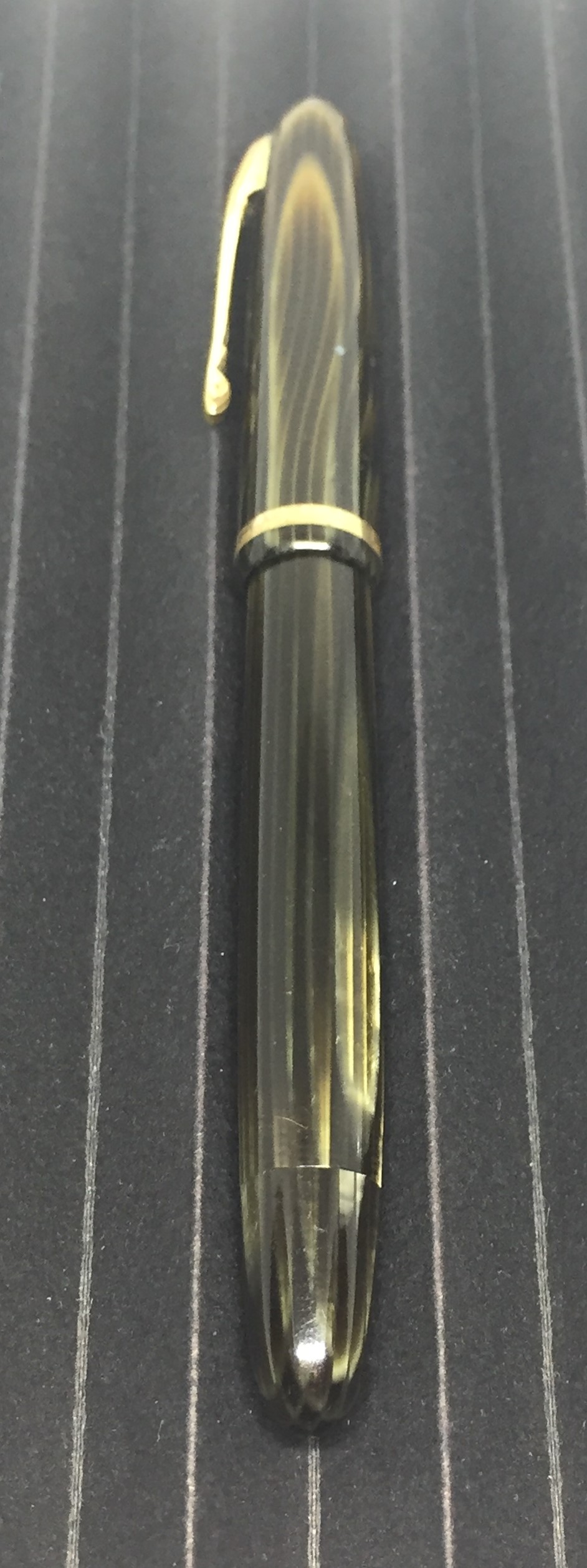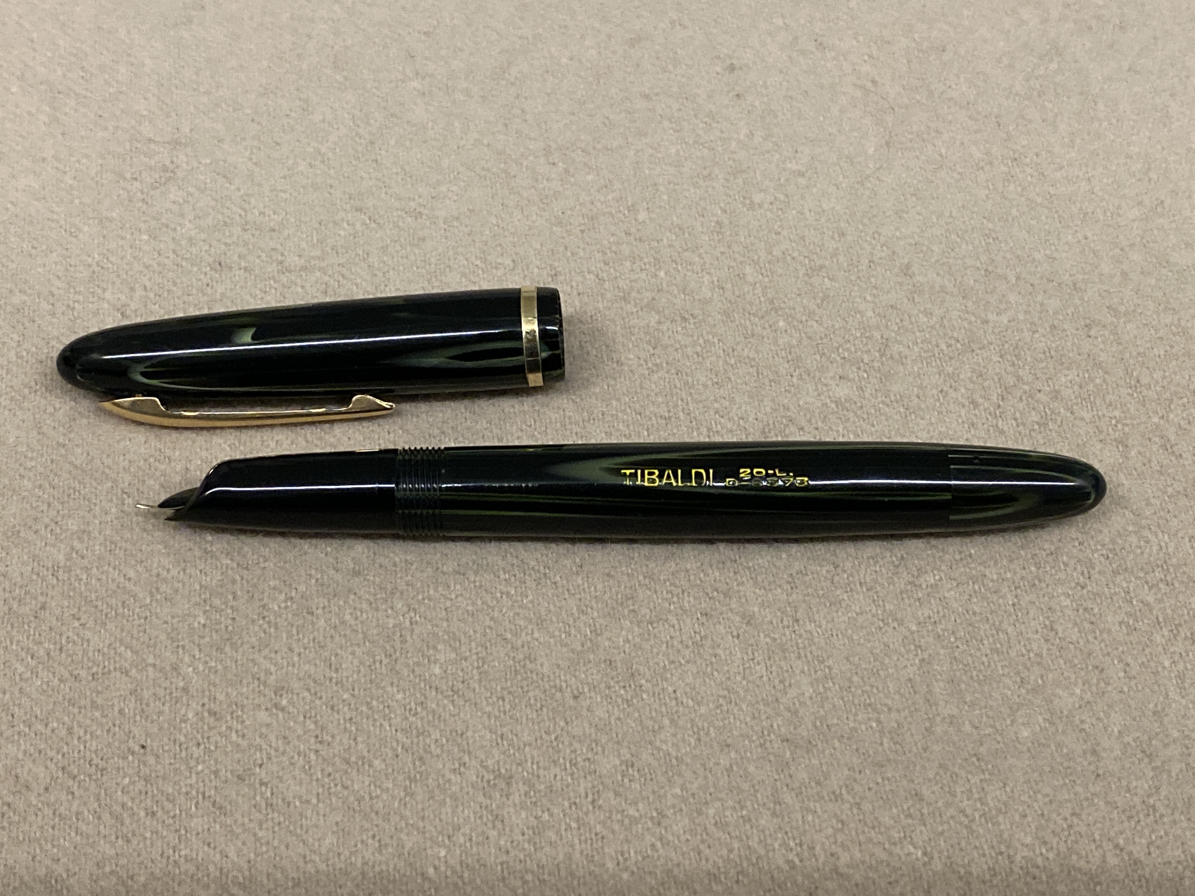 Realizzata in celluloide Arco Verde direi, come una 20-L che è passata tra le mie mani. Solo che la mia aveva un pennino carenato, cosa con cui non vado molto d’accordo.