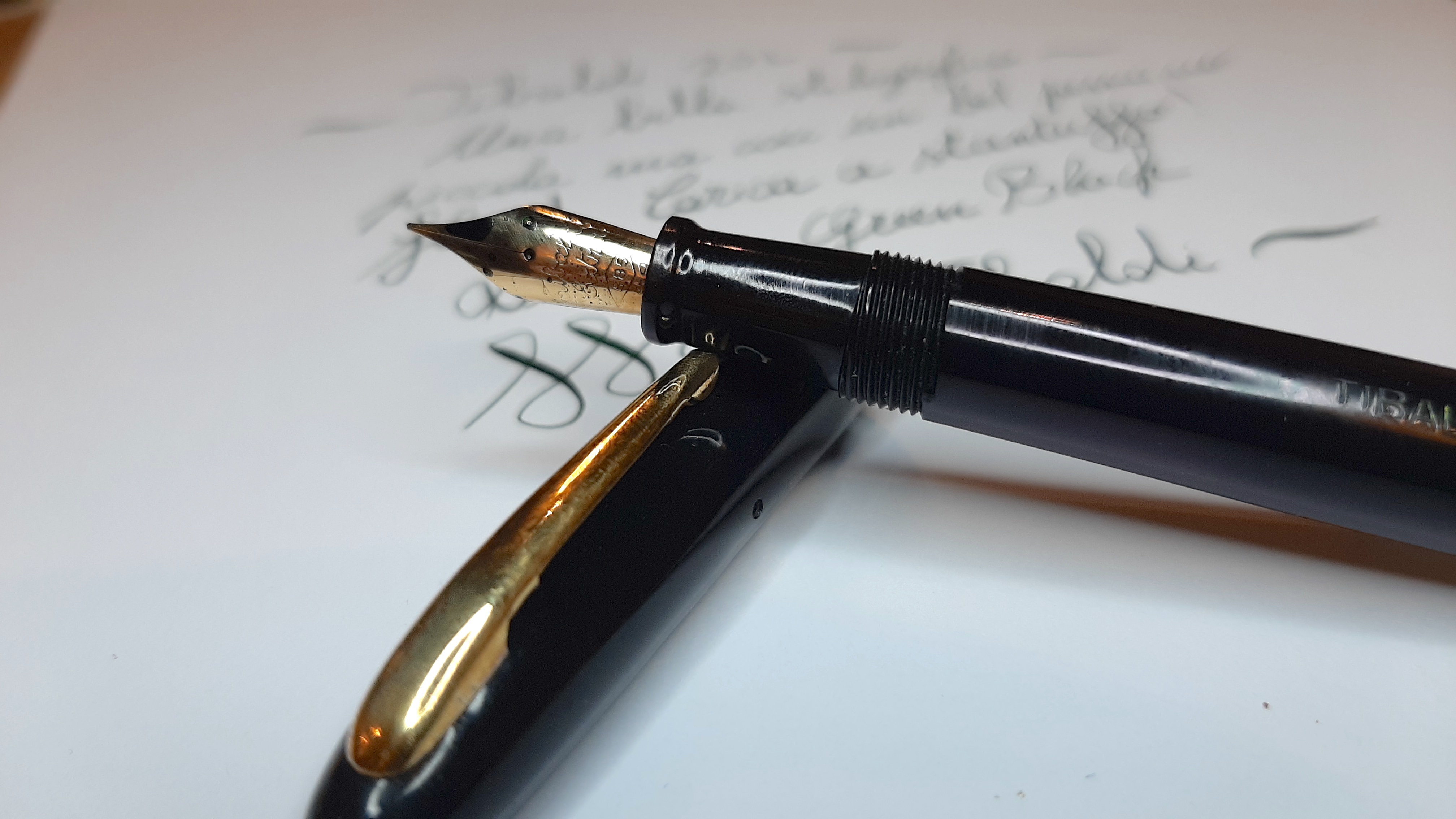 La penna e' tornata all'ovile. Io ho messo a posto lo stantuffo ed un riparatore scozzese a reinserito pennino ed alimentatore nella sezione. La penna scrive bene e morbida ed ha un po' di, quello che alcuni chiamano, 'flex' ma che a me sinceramente non ha mai interessato e non ne faccio una malattia :-)