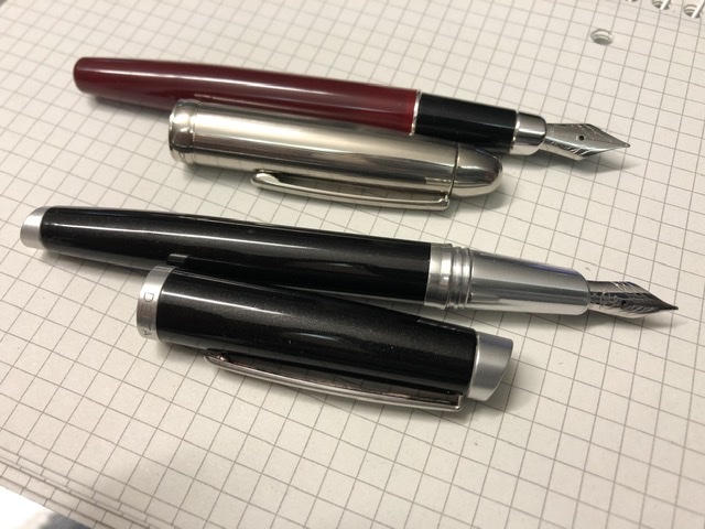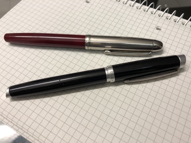 Buongiorno, volevo presentarvi due penne Delta trovate al mercatino domenica, non ne conosco i modelli, credo di aver capito che non facciano parte del periodo migliore dell’azienda. Per una cifra modesta penso di aver preso comunque due penne che scrivono bene, sono entrambe a cartucci/converter. Quella bordeaux è un tratto medio pennino in acciaio, il materiale del fusto mi piace, dopo una bella lavata ha preso a scrivere, anche se il medio europeo non è proprio nelle mie corde mi mancava. Quella nera ha un pennino 18k che scrive come piace a me, tratto fine come la mia Custom 74 SF, molto scorrevole, mi sarebbe piaciuto un po’ più morbido ma comunque è un piacere scriverci, caricata con l’inchiostro nero Delta in cartucce che mi ha lasciato il venditore. Mentre della rossa ho visto qualche notizia in giro, della nera non ho trovato notizie in rete, qualcuno saprebbe darmi qualche info in più?