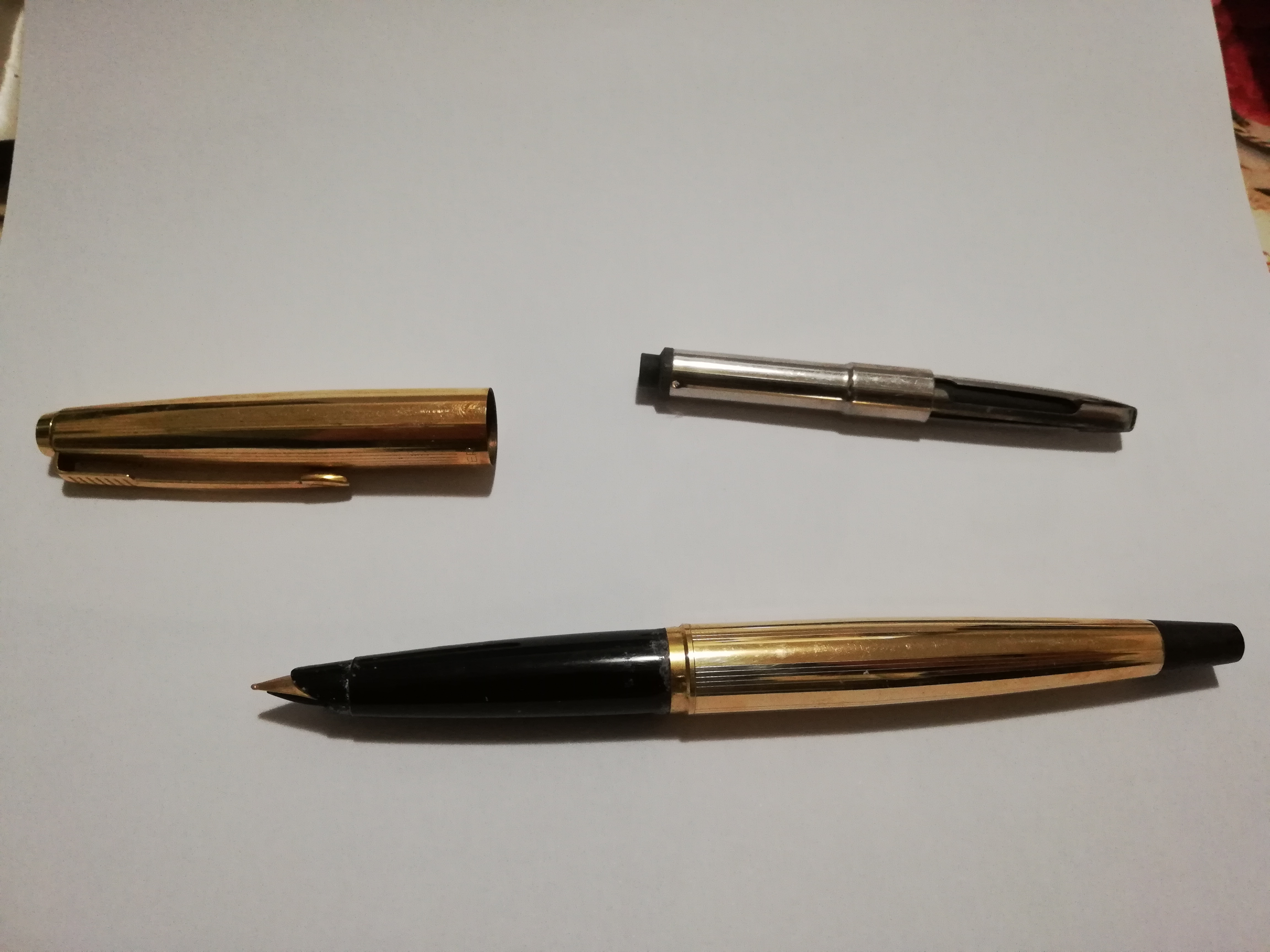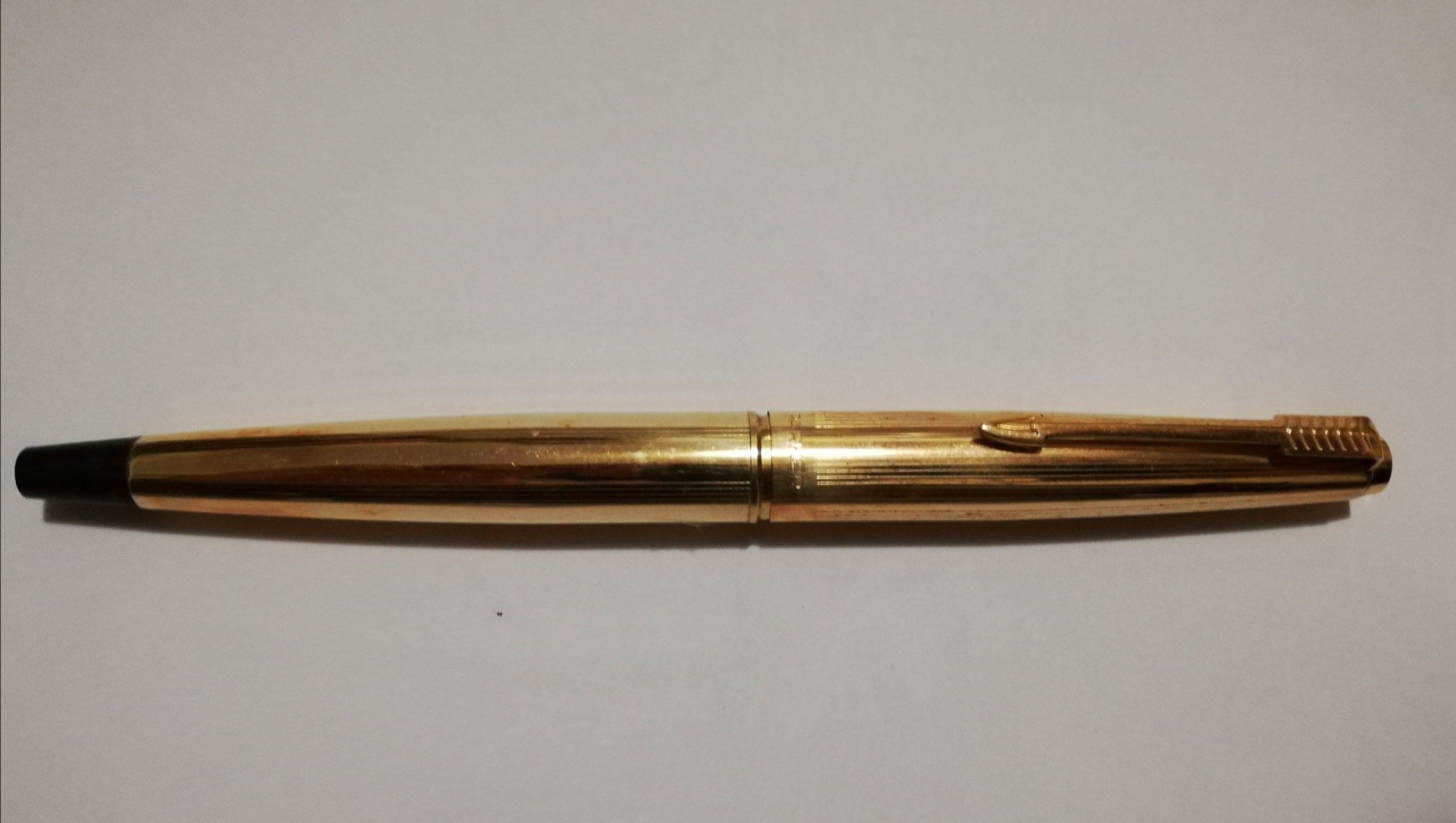 Direi Parker 45 DeLuxe "insigna" CT (ma dovrebbe essere "GT".....), comunque "Rolled Gold": laminata oro (12K, di solito, ma il titolo della laminatura non veniva indicato sulla penna), prodotta tra il 65 ed il 69 ("Black Tassie")