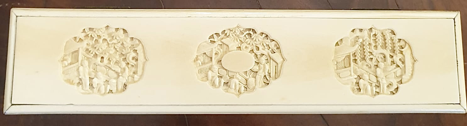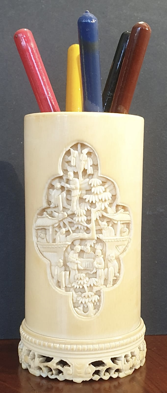 Due bei contenitori (con notevoli bassorilievi) in avorio, da scrivania con 2 pennelli incisi e dipinti. Firmati.