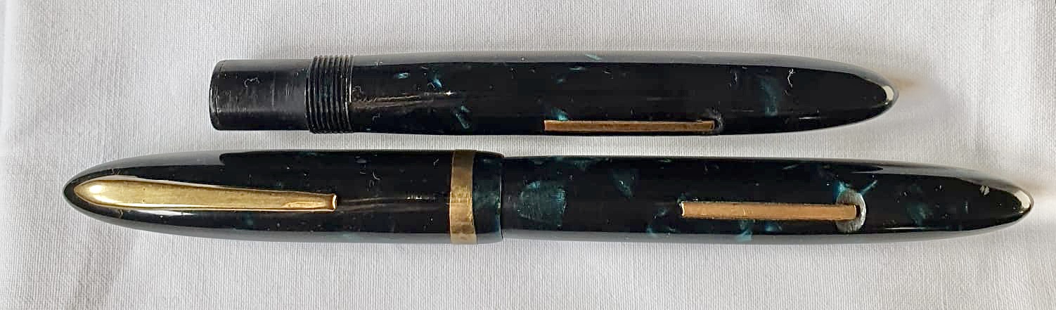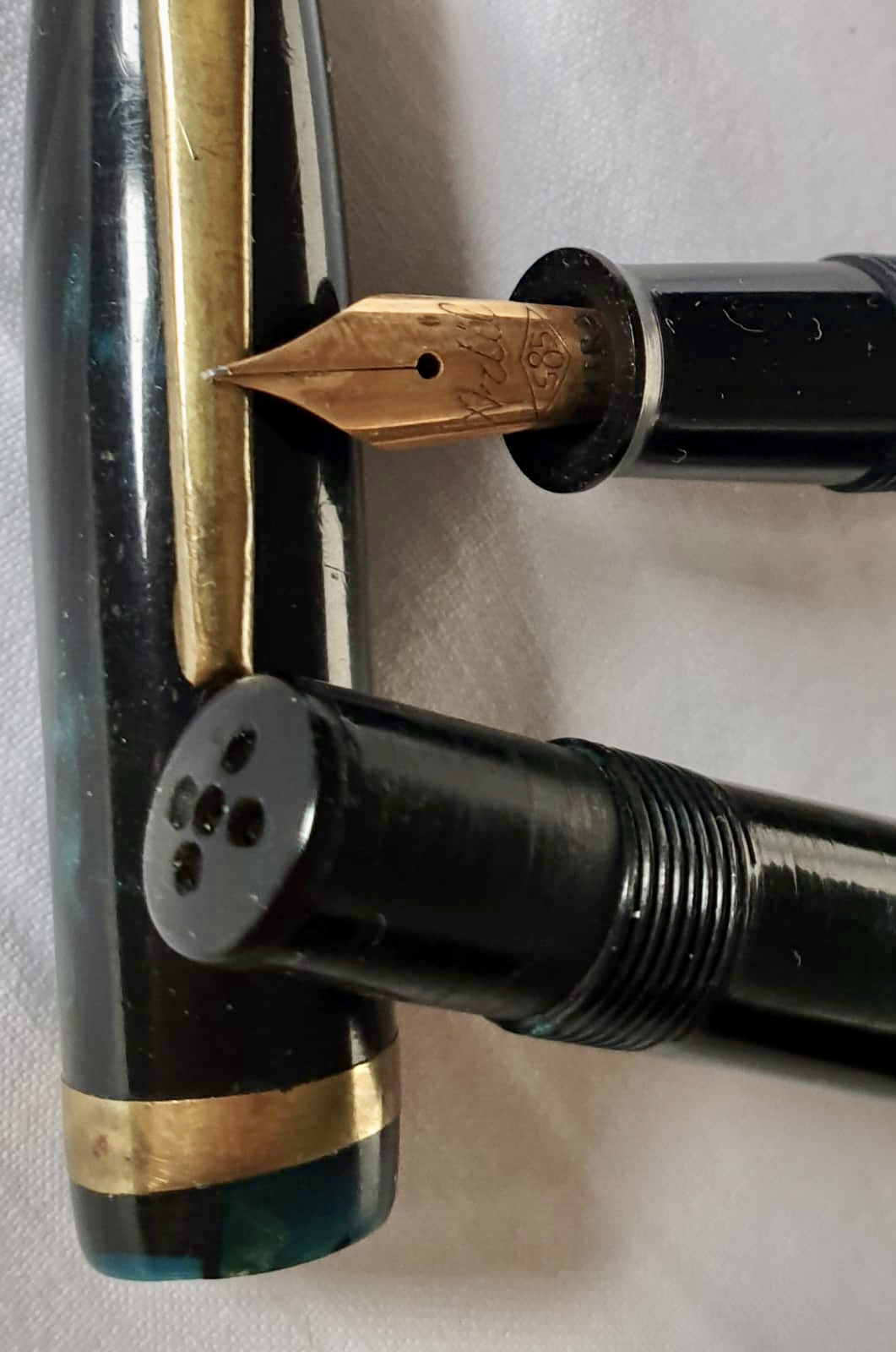 Raro set ARTIL (cartoleria ARturo e TILde Ferrari, Milano) stilografica ed aspersorio anni ‘30 in celluloide.