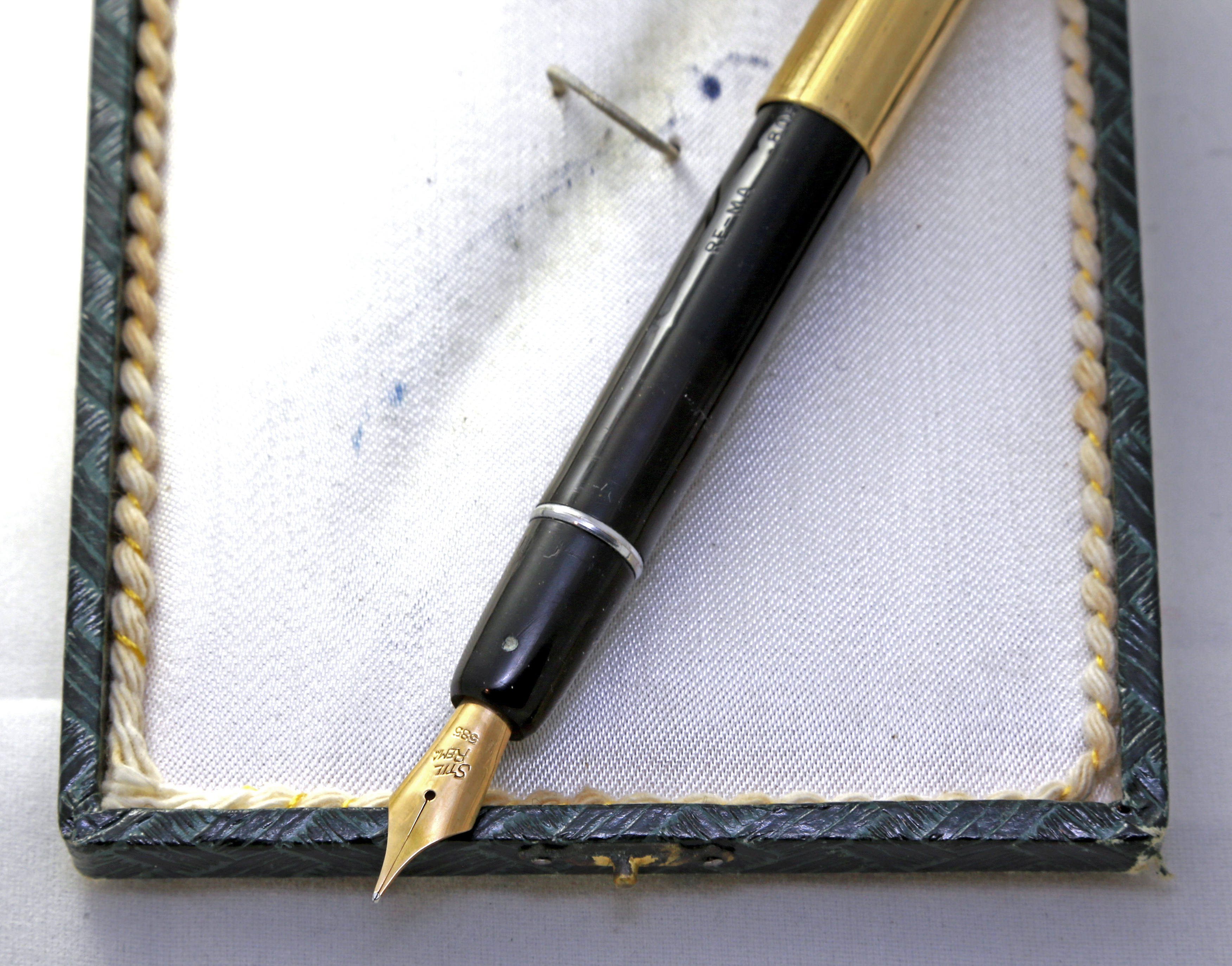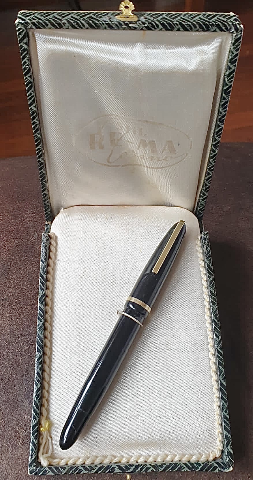 Buon esempio di stilografica in astuccio, da "Stil RE-MA", Torino; un po' Skyline un po' 51... Caricamento a bottone di fondo.