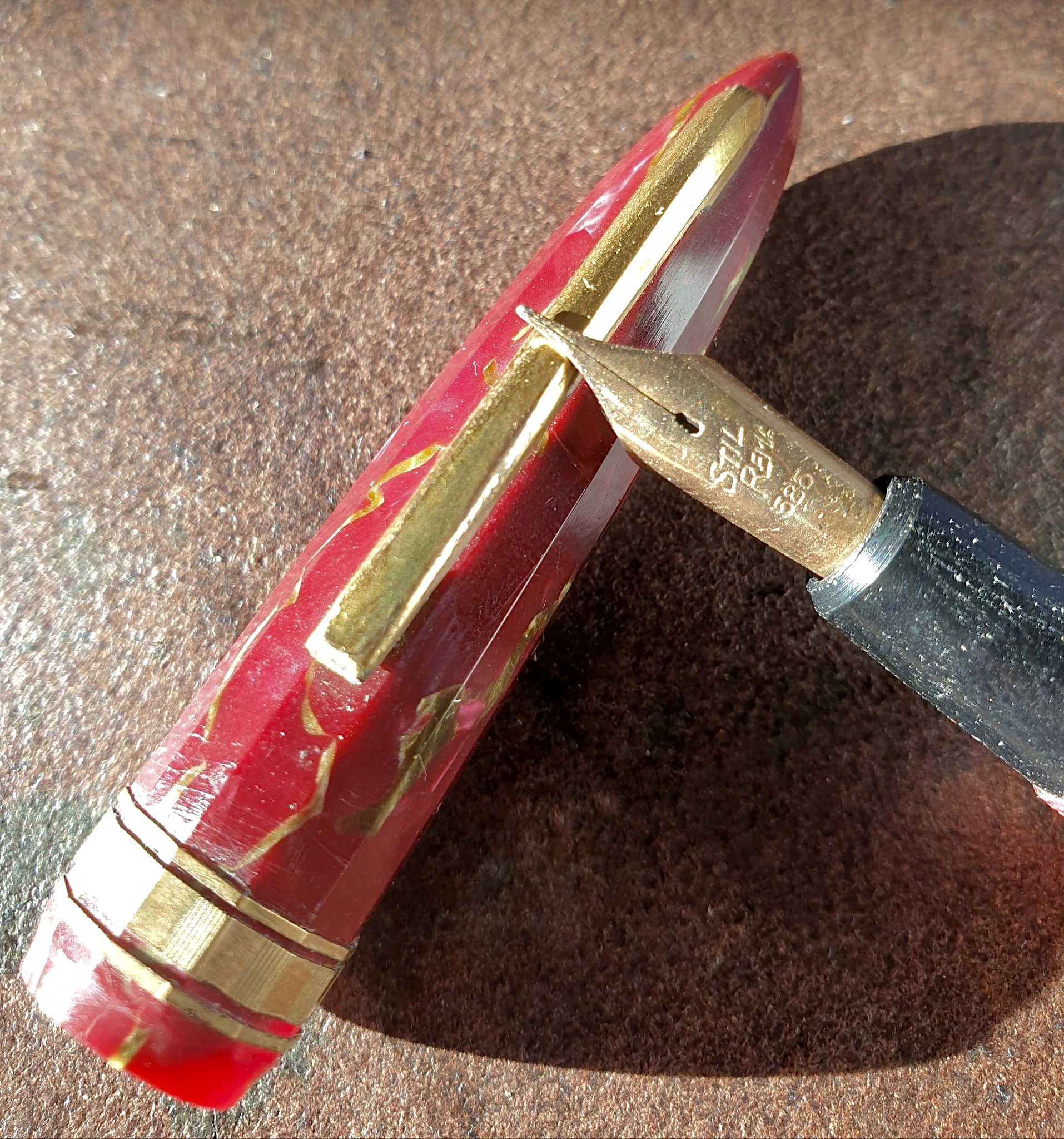 Ecco una “gemella”, con celluloide altrettanto stupenda, sfaccettata e dall’inconsueta forma rastremata acuta.