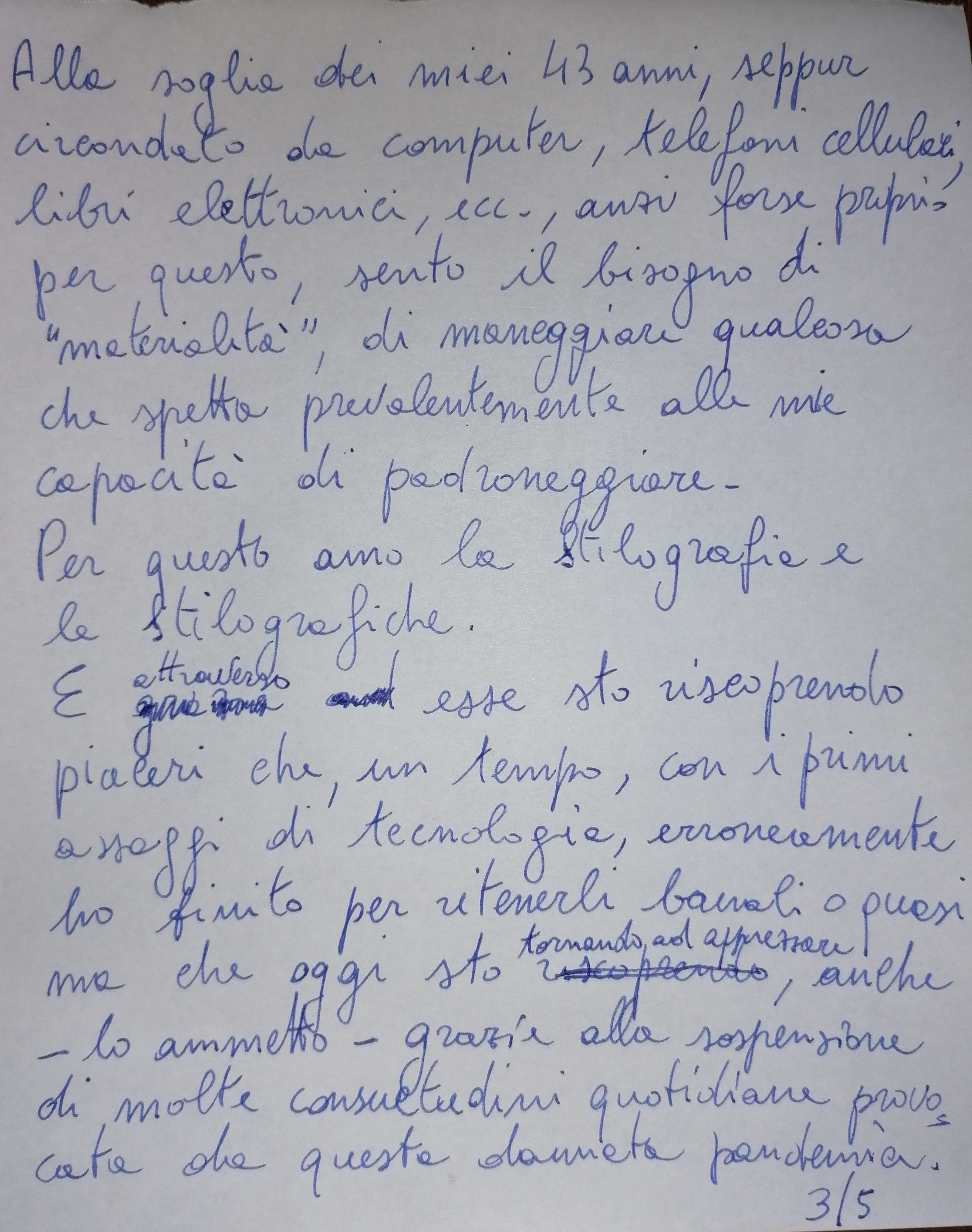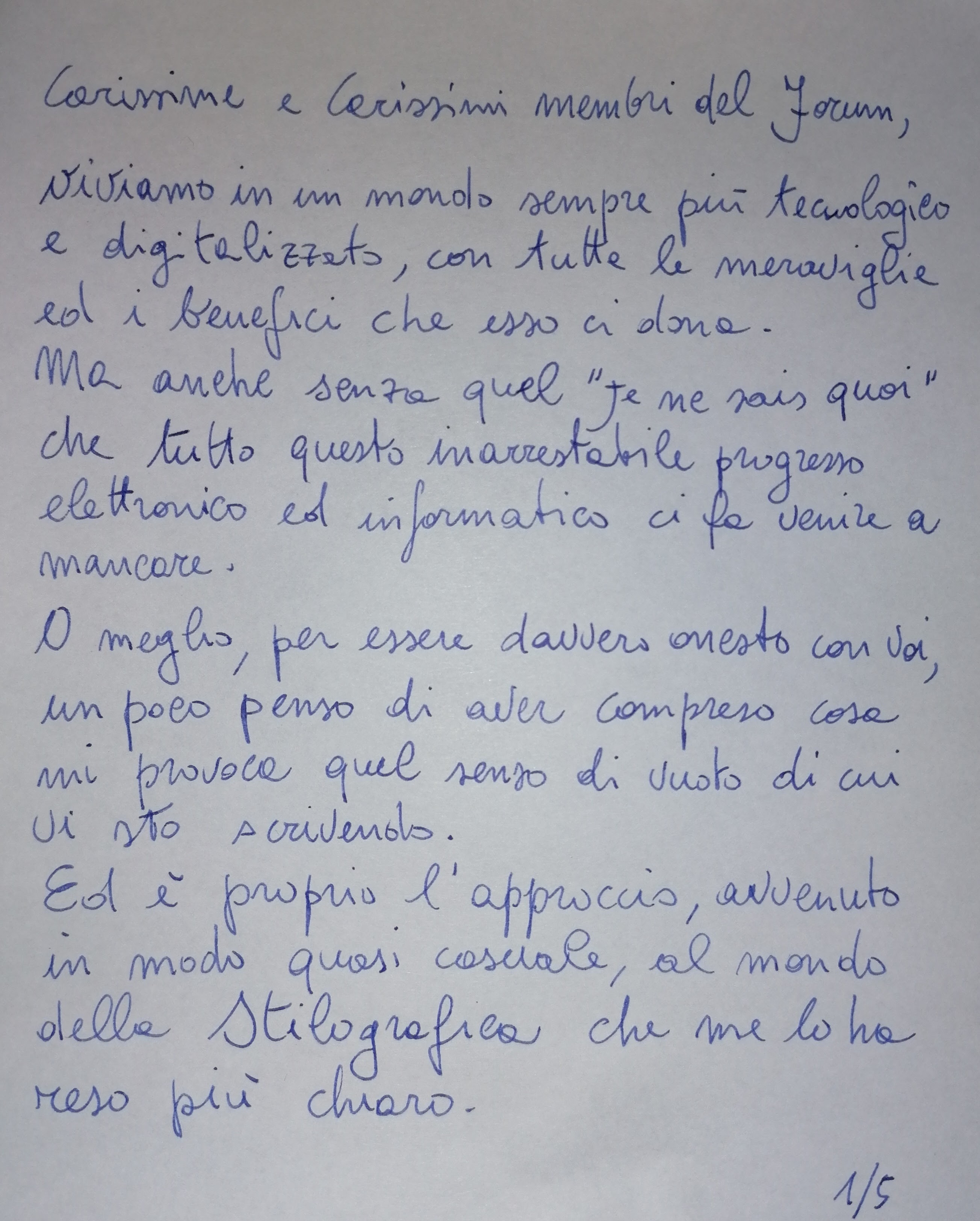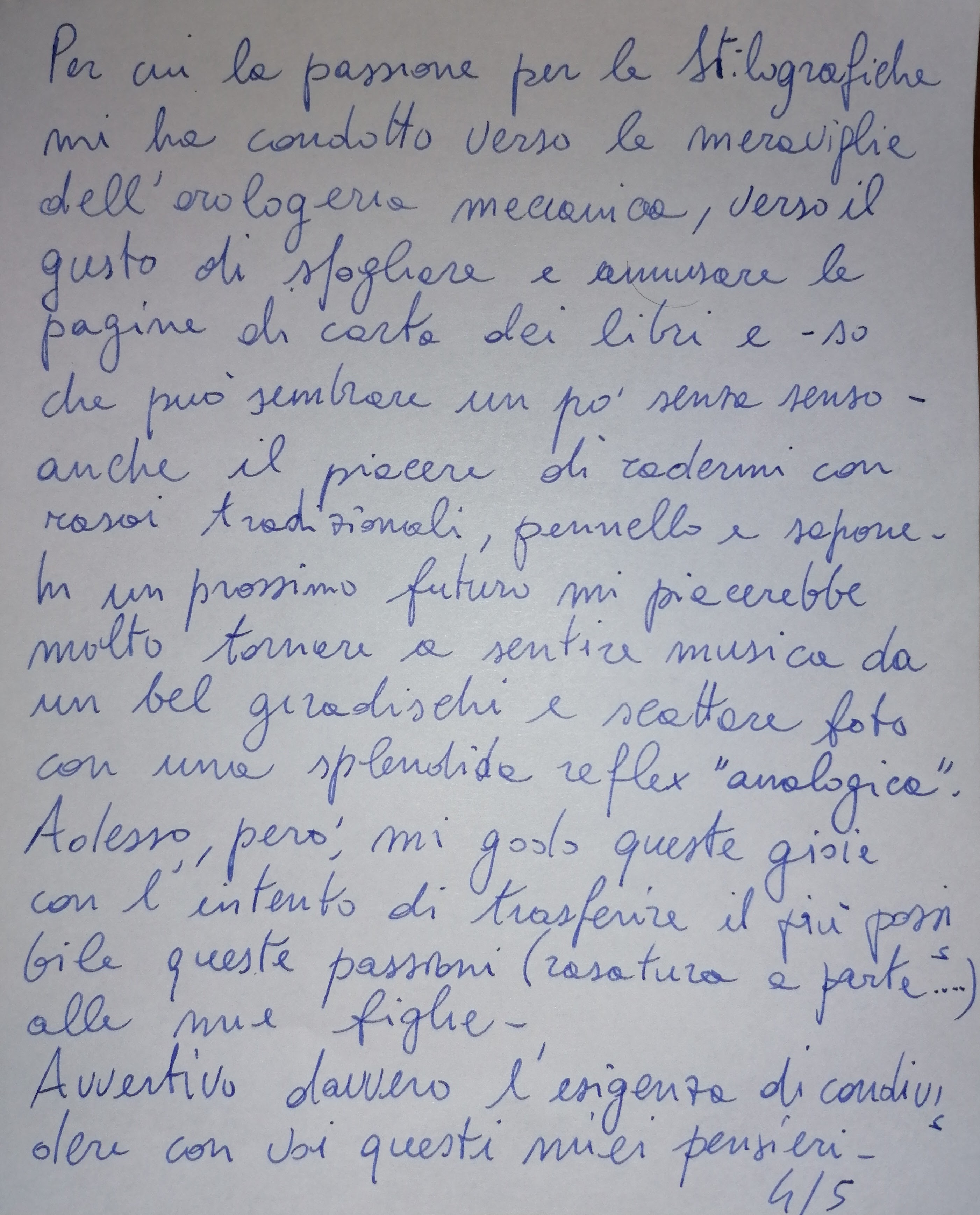 Il piacere dell'analogico in un mondo ormai digitale. La tecnologia è utile, ma a volte è spersonalizzante. Scrivendo con una stilografica, oltre al piacere del gesto, c'è anche la riconoscibilità dello scrivente a prima vista, se si conosce la grafia di quest'ultimo. Con un computer, si scrive tutti allo stesso modo. Detto questo, anche a me piace ritagliarmi un momento da dedicare alla lettura (anche se leggo prevalentemente col kindle :D), alla scrittura stilografica, e a preparami un buon tè a foglie sfuse. Anche se la tecnologia non va demonizzata, ma compresa e usata, senza farci usare da questa.