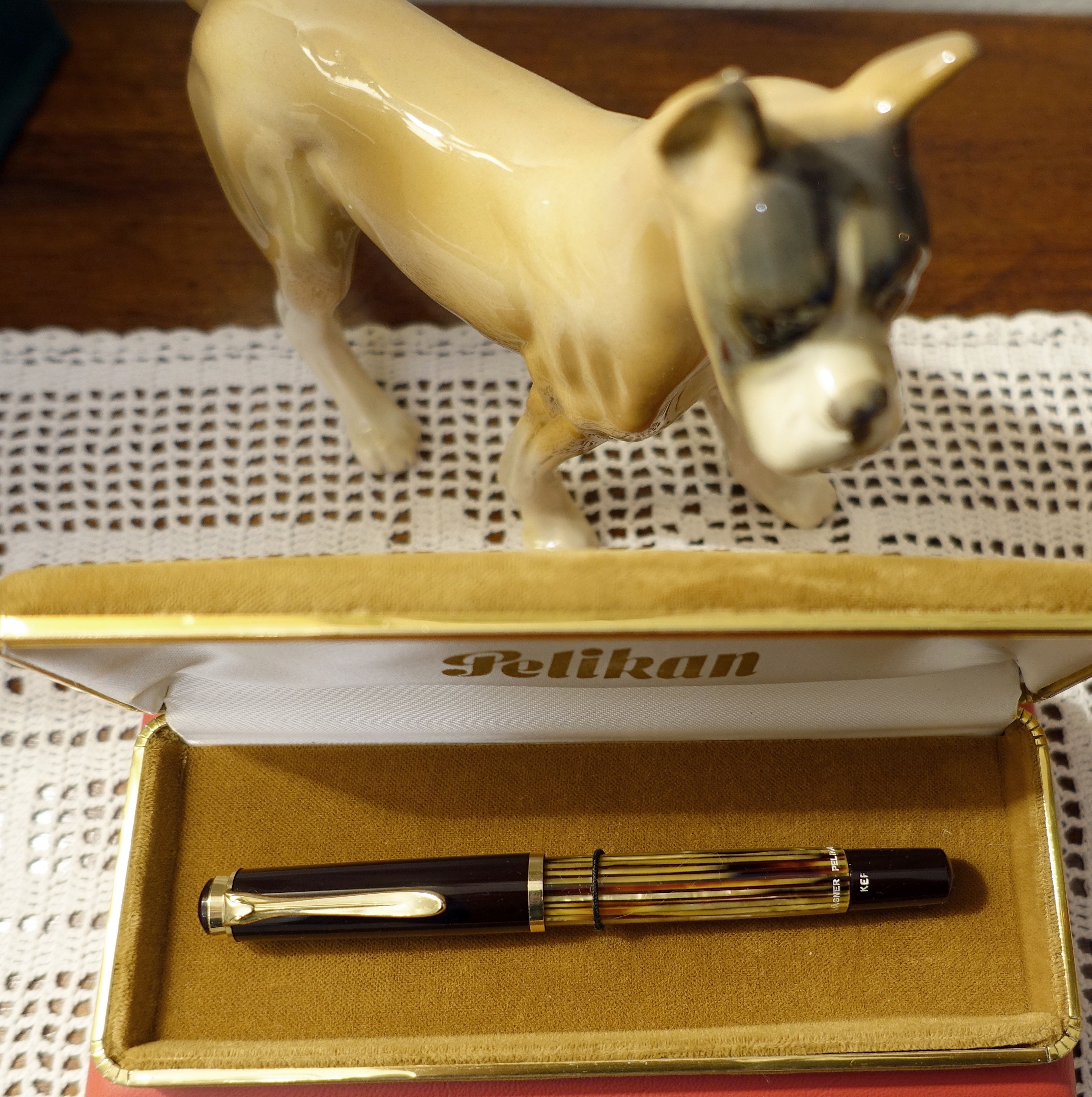 Oggi ho ricevuto in regalo da mio padre una Pelikan 400N mai inchiostrata e senza un segno, neppure minimo, nella confezione regalo a cofanetto che richiama quella del 1897, completa di calamaio sul modello dell'epoca.