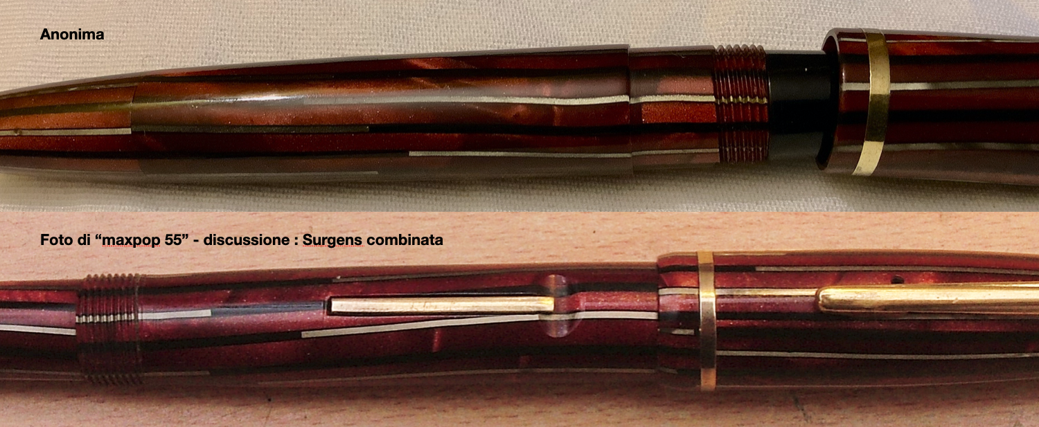 Leggendo una discussione di maxpopp 55 viewtopic.php?p=220612#p220612 , ho notato una certa somiglianza riguardante la celluloide utilizzata per le due stilo, questa anonima e la Surgens indicata nella discussione di cui sopra.