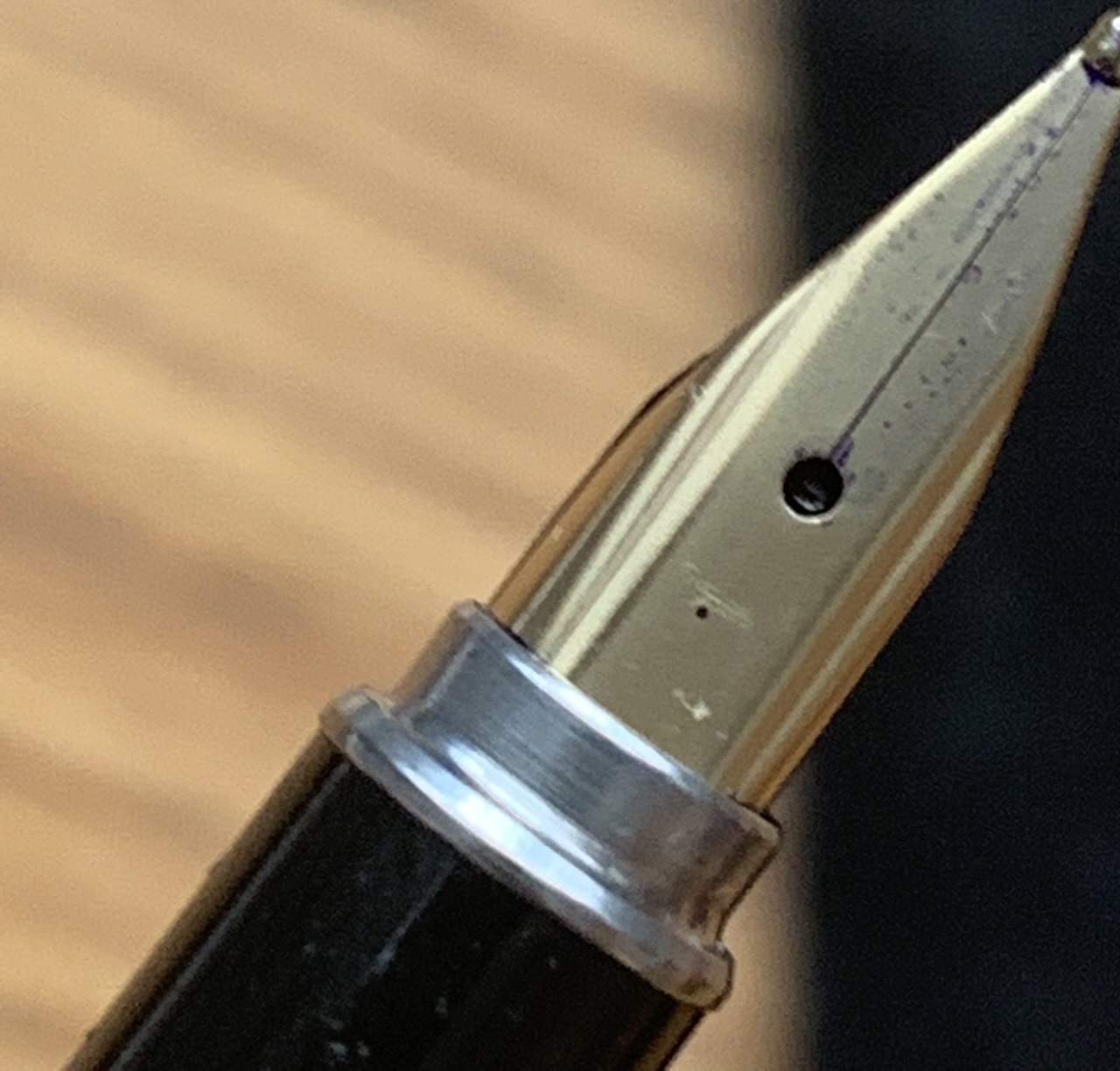 Il pennino è in acciaio dorato (placcato oro?), di forma triangolare allungata, senza alcuna decorazione o indicazione della gradazione del tratto (sembra un medio tendente al fine), con foro di sfiato circolare, alimentatore di semplice plastica nera.