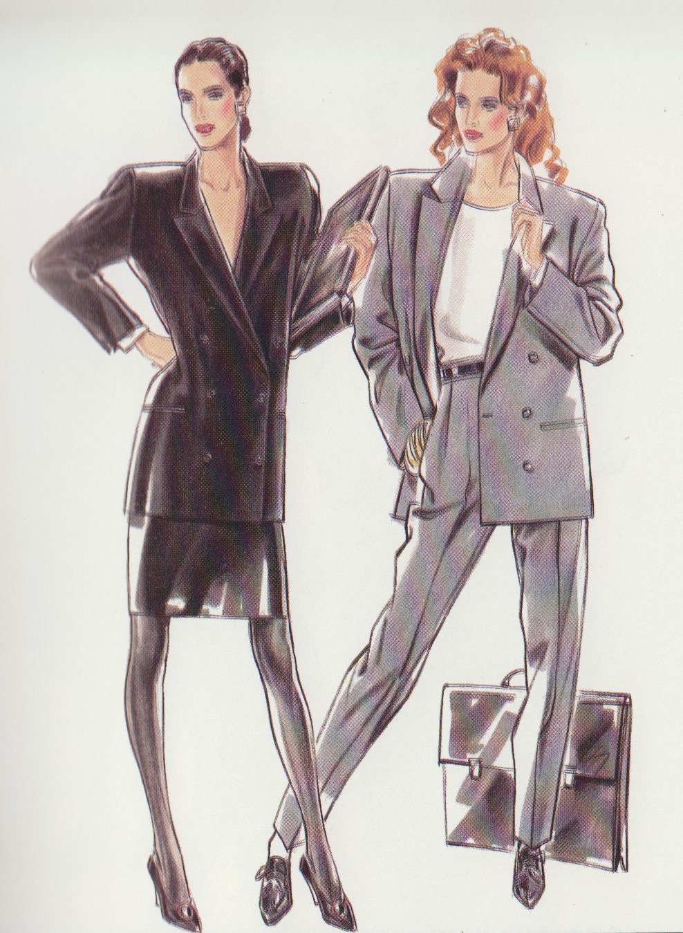 una giacca a spalla larga con minigonna e scarpa tacco dodici, insomma una cosa in questo stile: