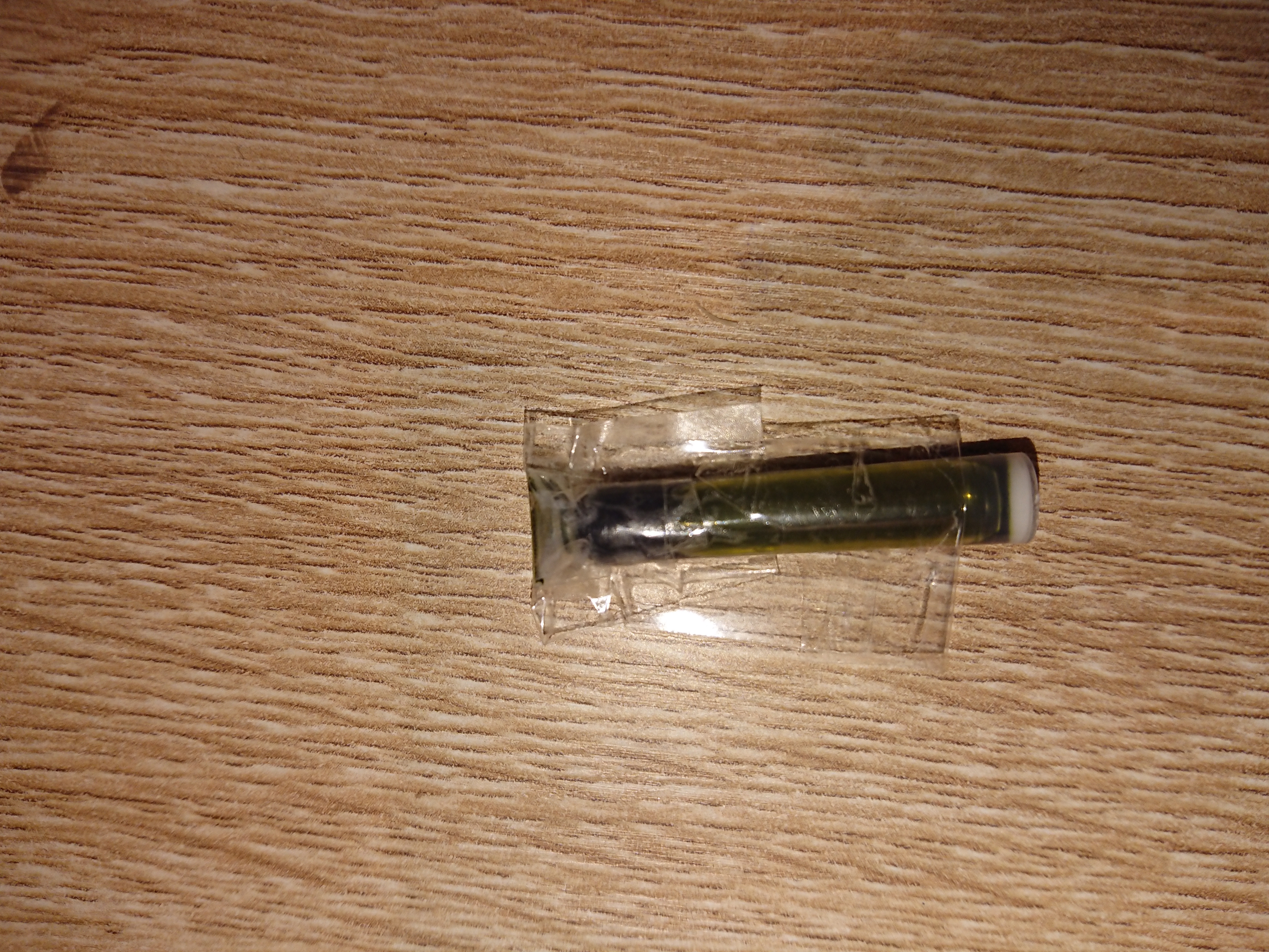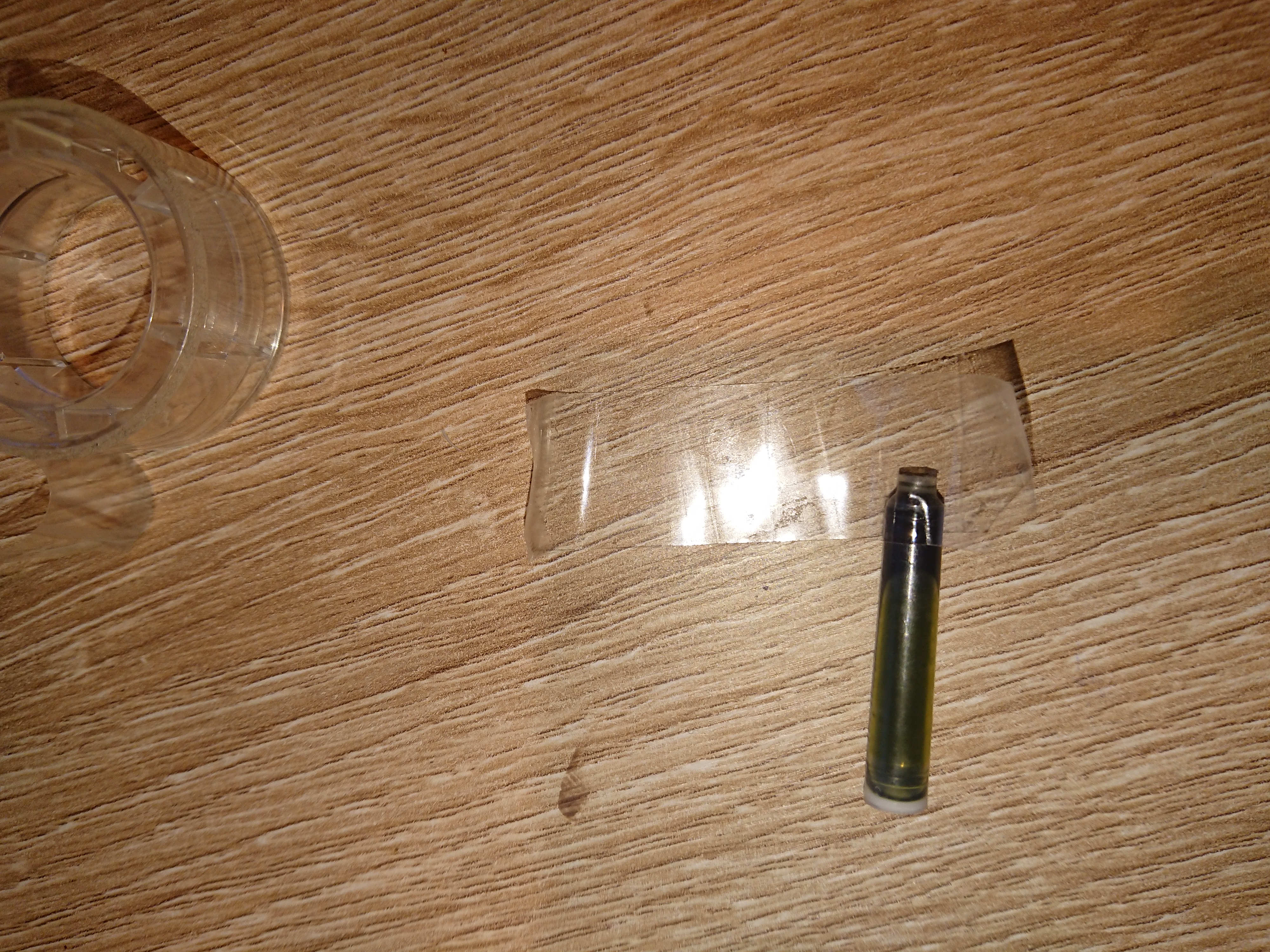 Ora l'ultimo passaggio: prendere un altro pezzo di scotch, anche stavolta sui 4cm, e posizionarlo, stavolta nel senso della lunghezza della cartuccia, andando da un lato all'altro, poi snche stavolta vanno saldati i lati schiacciando bene. In questo modo la cartuccia dovrebbe essere sufficientemente saldata da poter essere conservata, magari evitando di strapazzarla troppo.