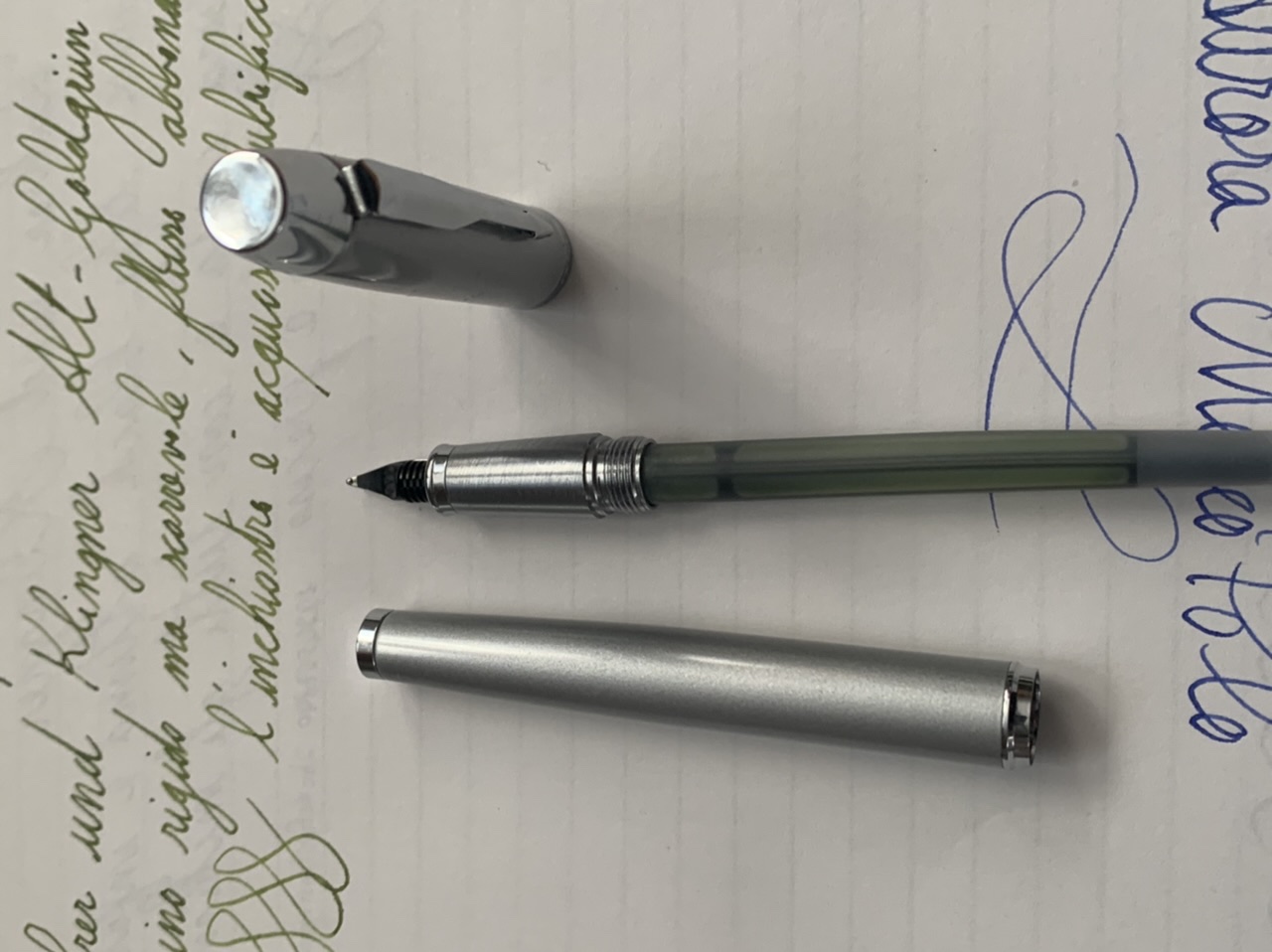 Senza cappuccio sembra leggermente corta e tozza, senza tuttavia risultare sgraziata, il pennino è piccolo e di forma tubolare, in acciaio lucido e dello stesso colore cromato dele verette