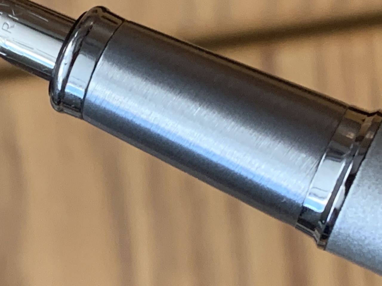 Come già detto la penna è tutta in metallo con finitura laccata grigia effetto metallizzato, mentre la sezione è in metallo grigio naturale spazzolato (acciaio?), l'effetto finale è