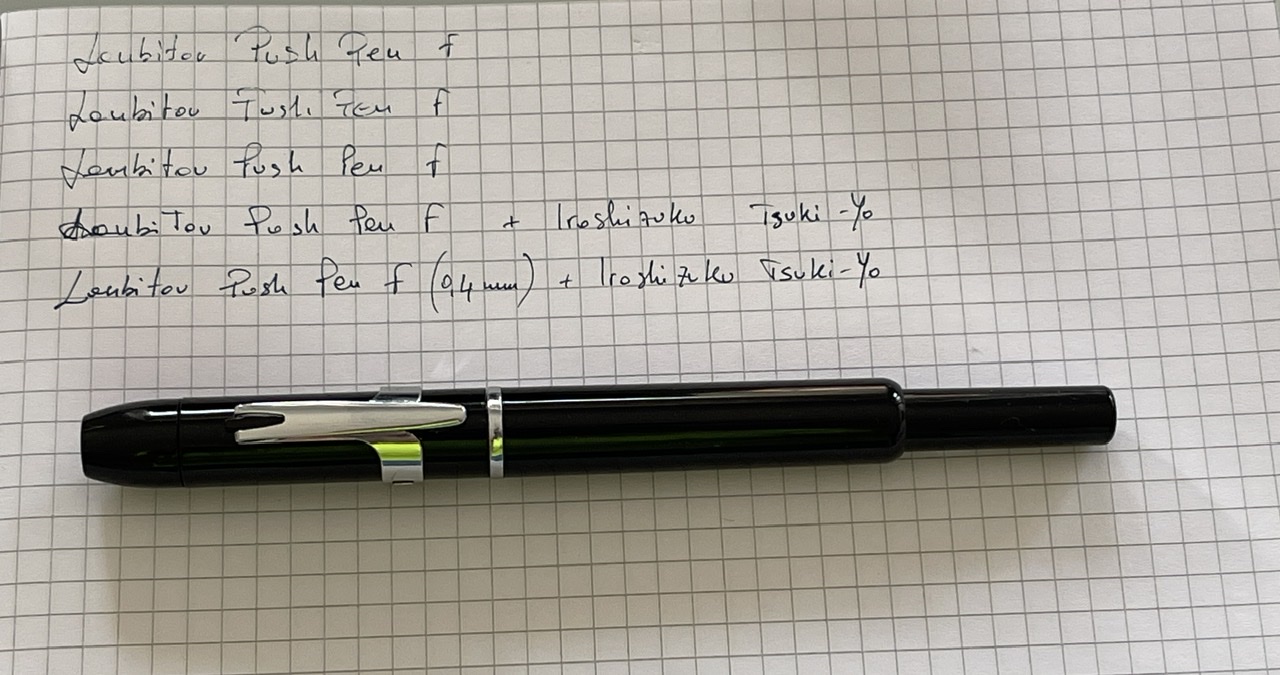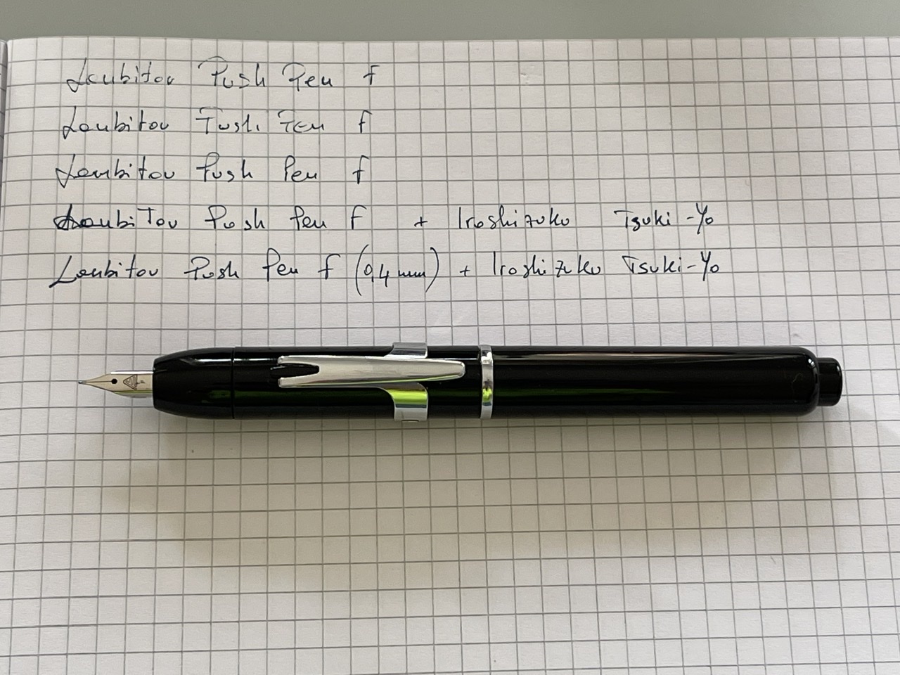 Ho provato a caricarla sia con Pelikan 4001 Brillian Black, sia con Iroshizuku Tsuki-Yo per vedere se un inchiostro più fluido potesse aiutare e direi di si, anche se leggermente. Per migliorare ulteriormente potrei allargare lo spazio tra i rebbi con un pezzo di acetato, ma andrei probabilmente ad aumentare la dimensione del tratto e mi dispiacerebbe.