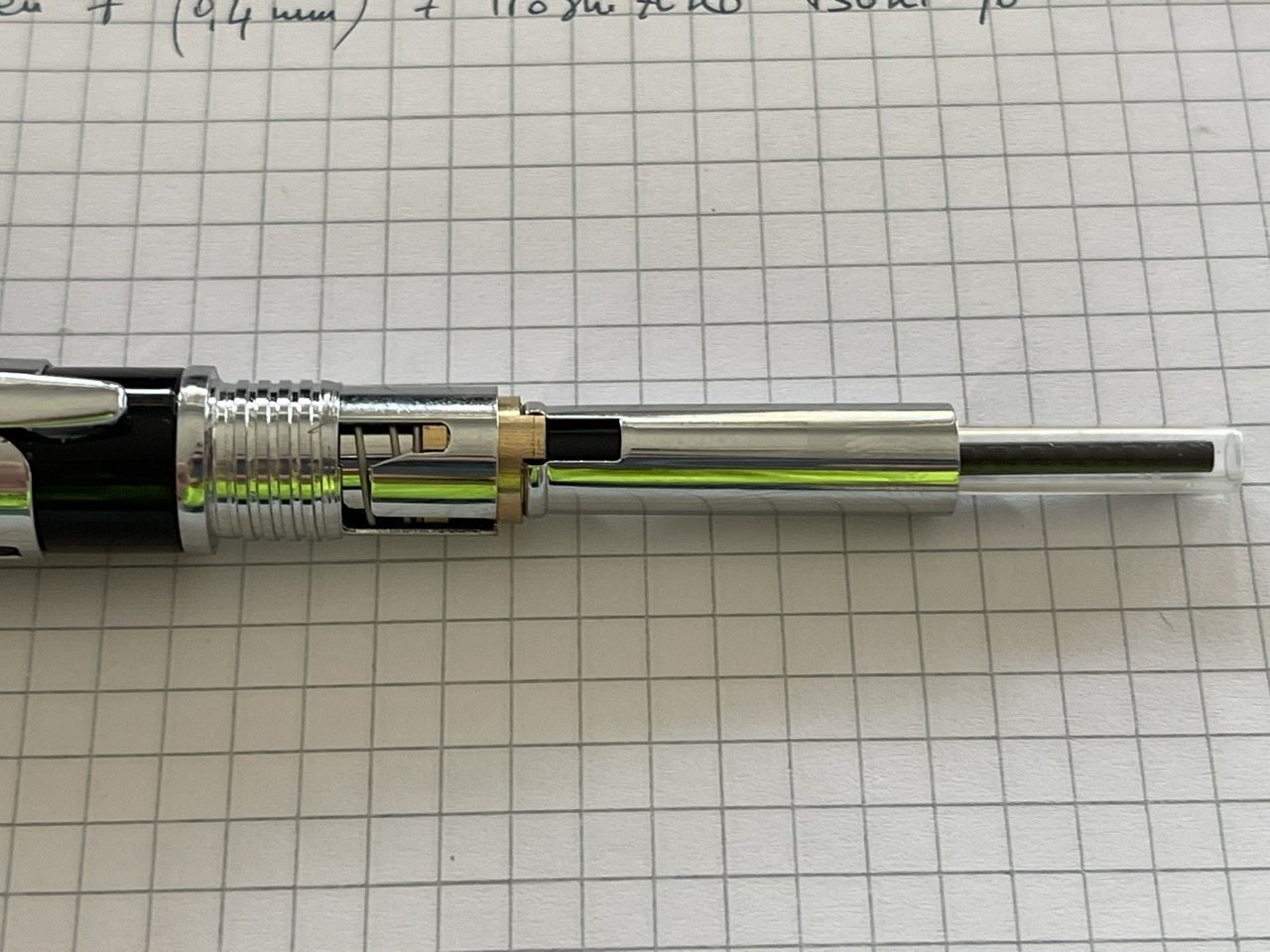 Il meccanismo rassomiglia a quello di una qualsiasi biro a scatto, fatto salvo per lo sportellino che si richiude davanti al pennino e l’alloggiamento per il converter standard, che risale per buona parte del converter, ma lasciando una finestrella per valutare la quantità di inchiostro residua (ovviamente è necessario aprire il fusto per vedere la finestrella, non essendo la plastica trasparente).