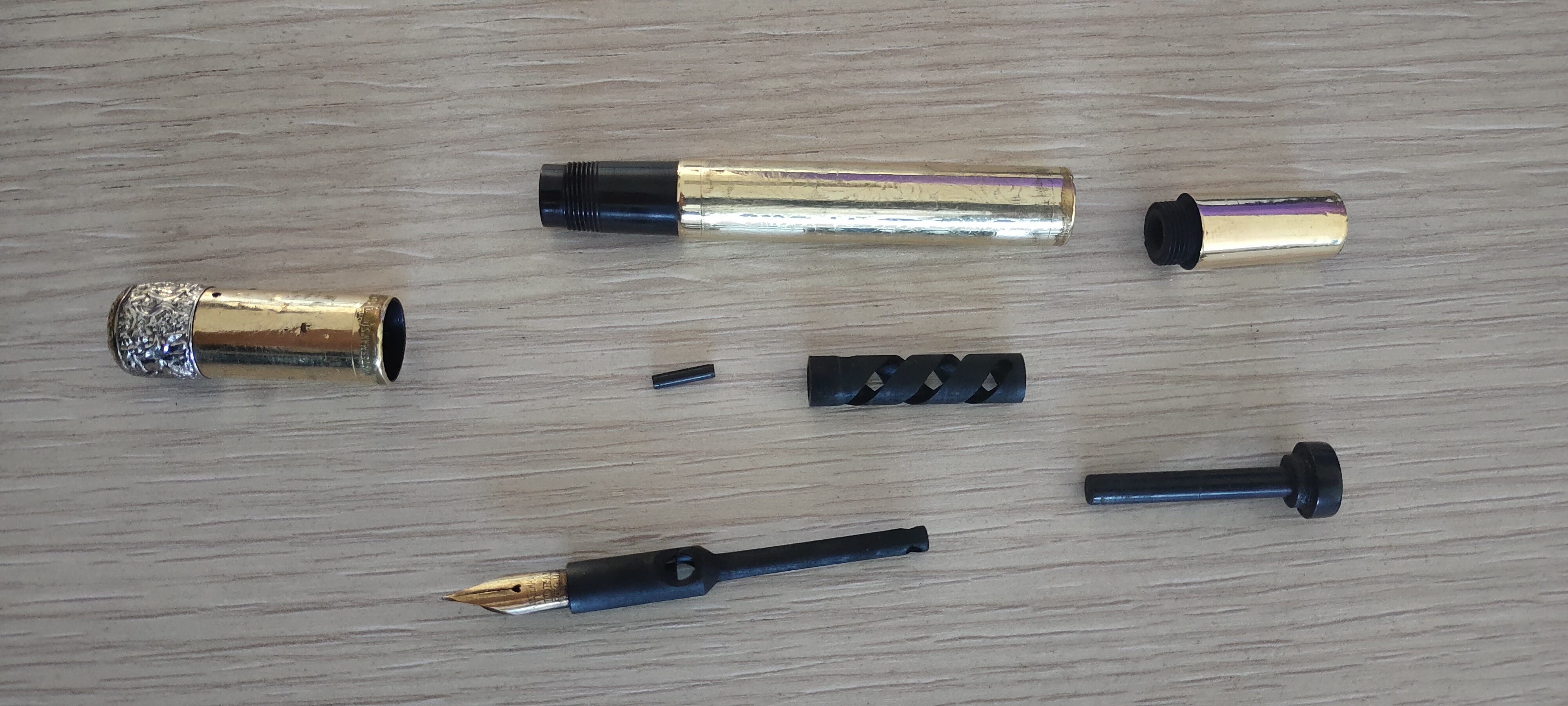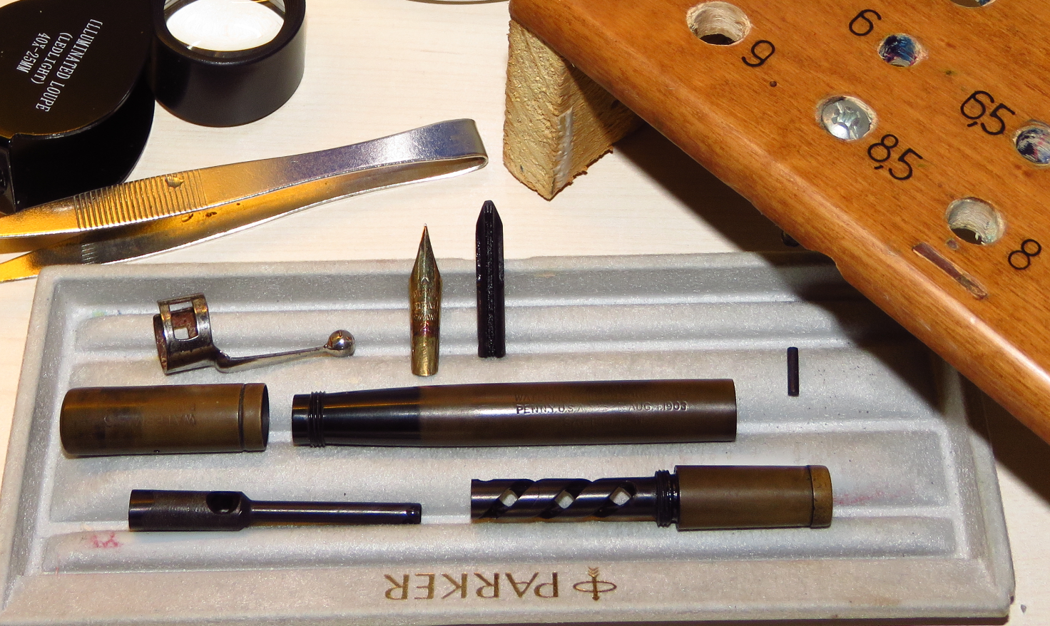 La manopola che si trova in fondo, dove si agisce ruotandola per estrarre il pennino, va ulteriormente smontata poggiandosi su un blocco di estrazione: bisogna battere piano sull'asse centrale con un martello e un bastoncino.