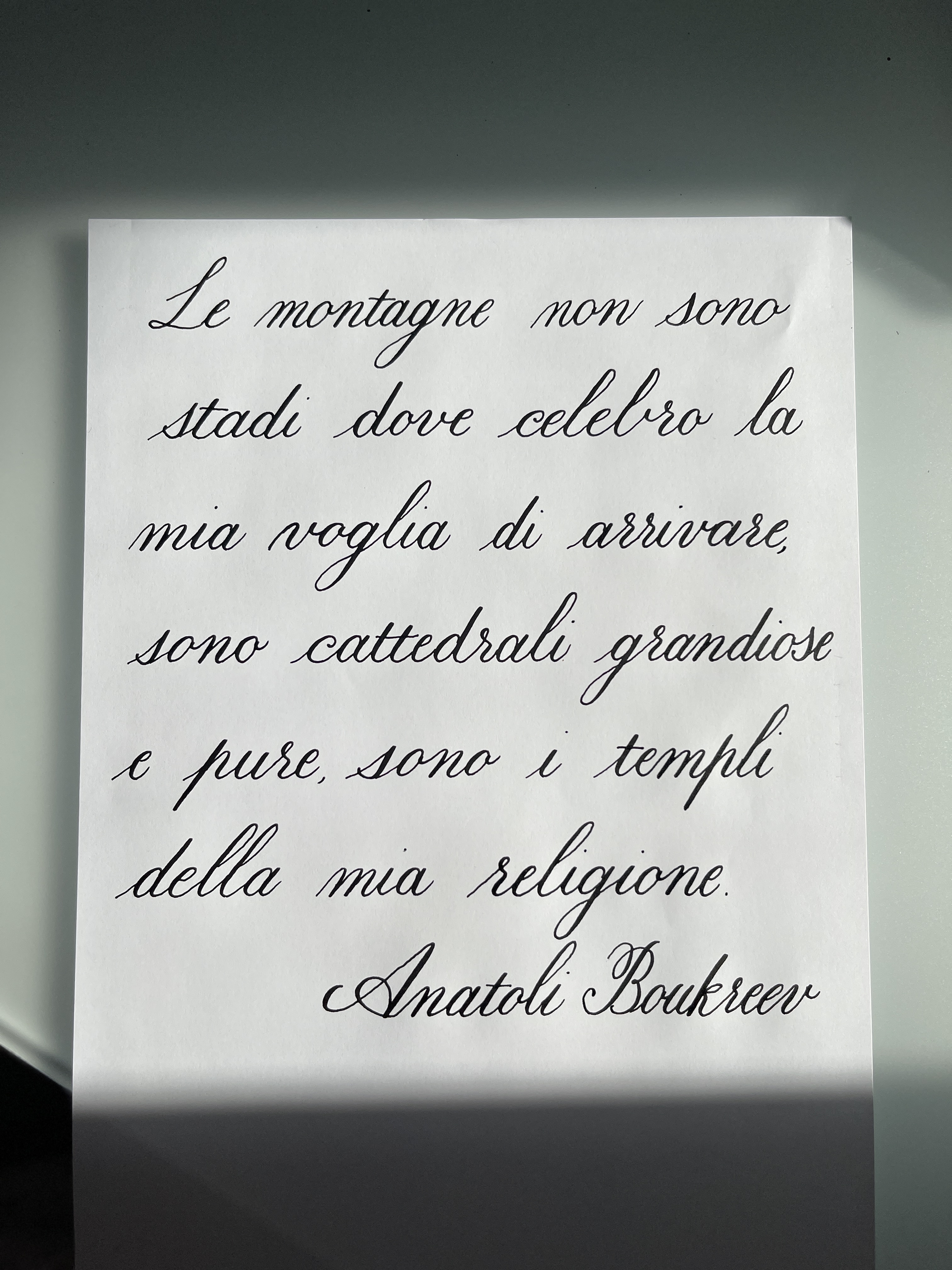 Per condizioni meteo avverse puntualissime dal venerdì alla domenica, manco dalle adorate montagne da ormai un mese. La voglia è matta e cerco di placarla leggendo e distraendomi con gli esercizi di calligrafia. Sono ufficialmente passato alla tavoletta luminosa e ne sono estremamente soddisfatto. Il Noodler’s Polar Black fa lavorare egregiamente il pennino Falcon della mia Pilot e, anche se siamo al limite dello spiumaggio, la carta regalatami dalla zia tipografa è ottima per fare esercizio e provare la formattazione della pagina per lavori un po’ più ampi.
