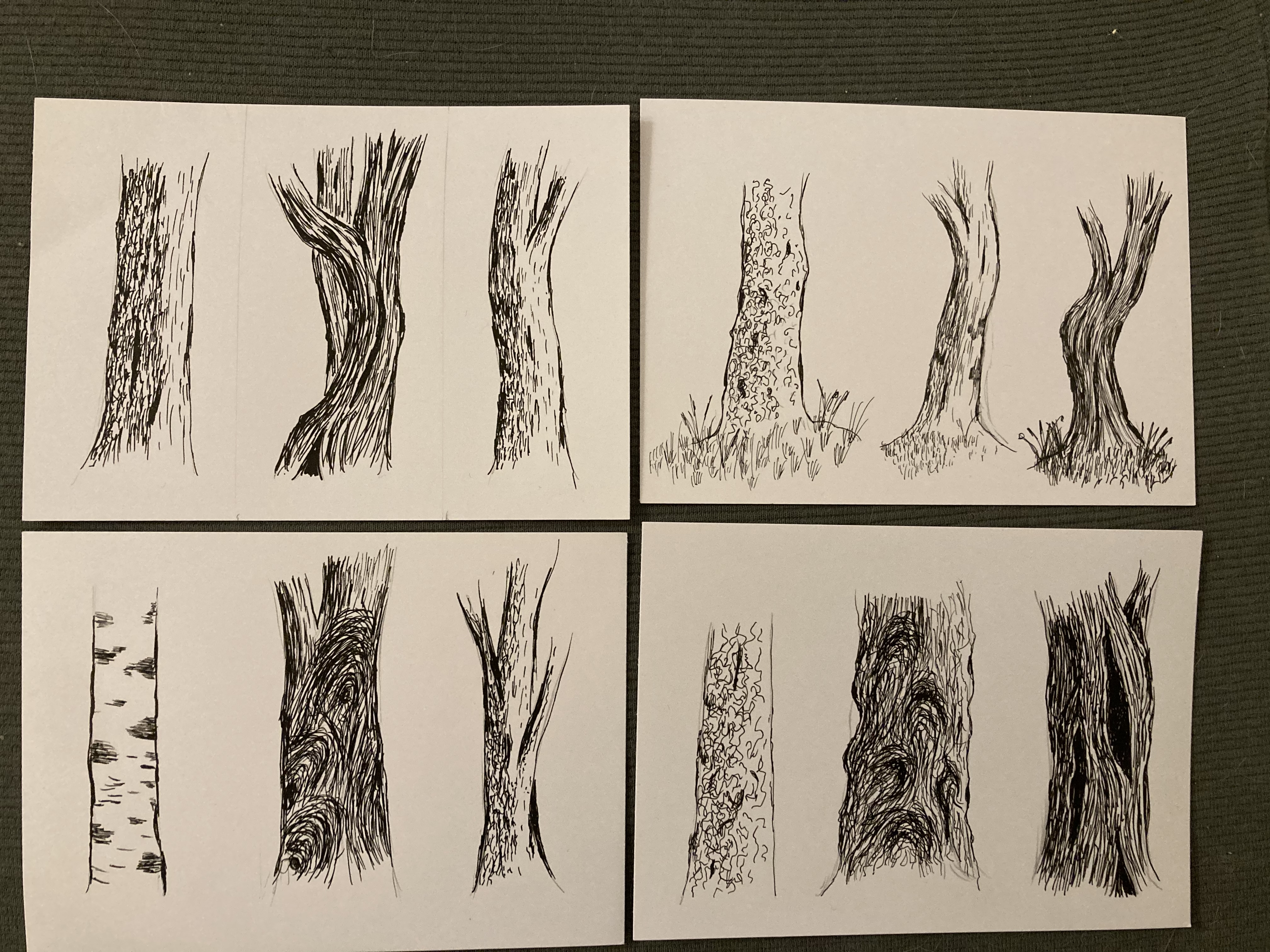 Se posso permettermi un suggerimento, dai miei ormai lontani insegnanti di disegno, gli oggetti non hanno contorni neri e definiti: bisognerebbe lavorarci di chiaro-scuro e contrasto con il fondo. Molto più complicato con la corteccia di betulla che è praticamente bianca, ma è il punto in cui si nota di più.