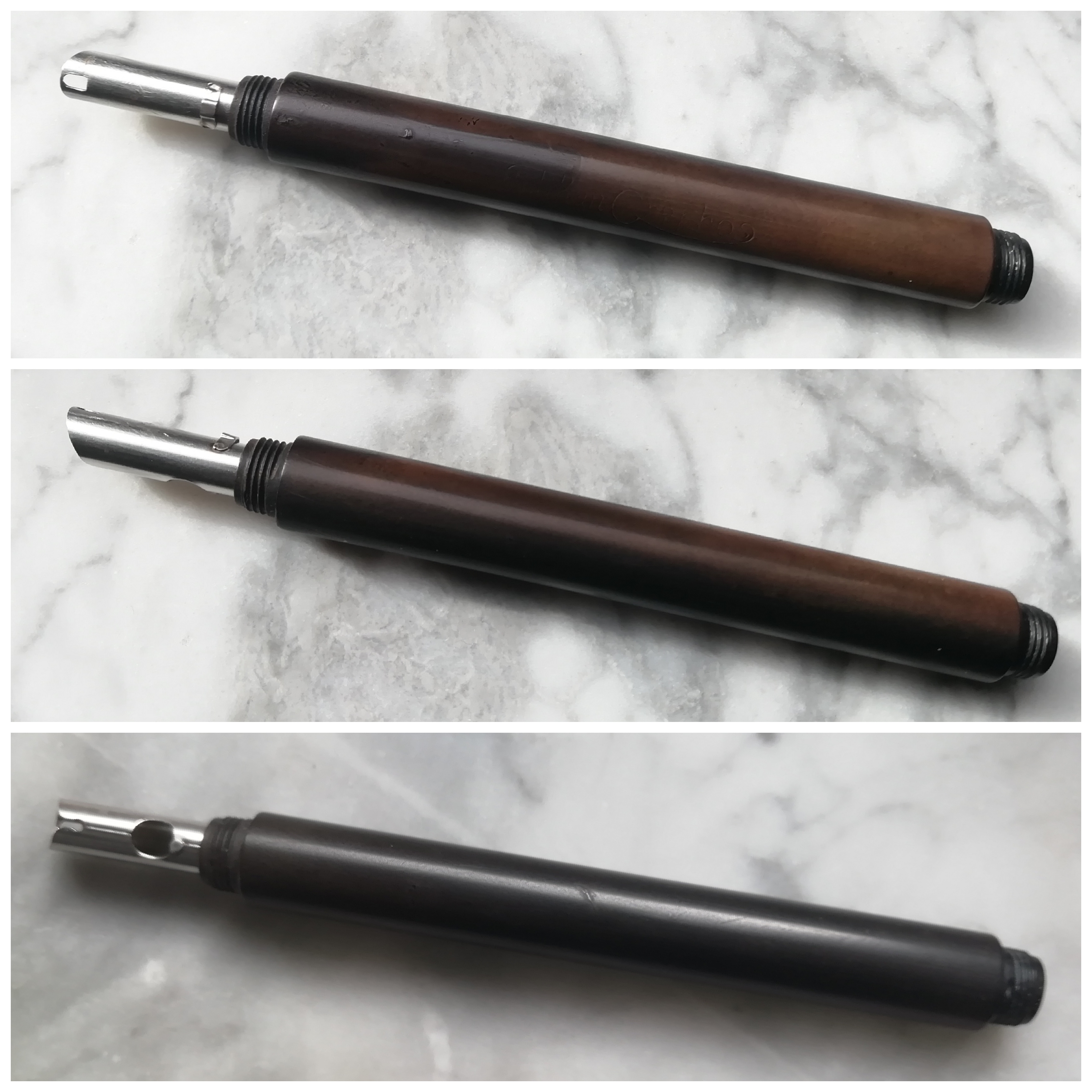 Ora, ESCLUSIVAMENTE a fini di scienza pratica applicata, e decisamente NON per distrazione, ho lasciata immersa anche una parte dell'ebanite del fusto per una quantità non meglio definita di ore notturne. È un'ebanite particolarmente invecchiata.