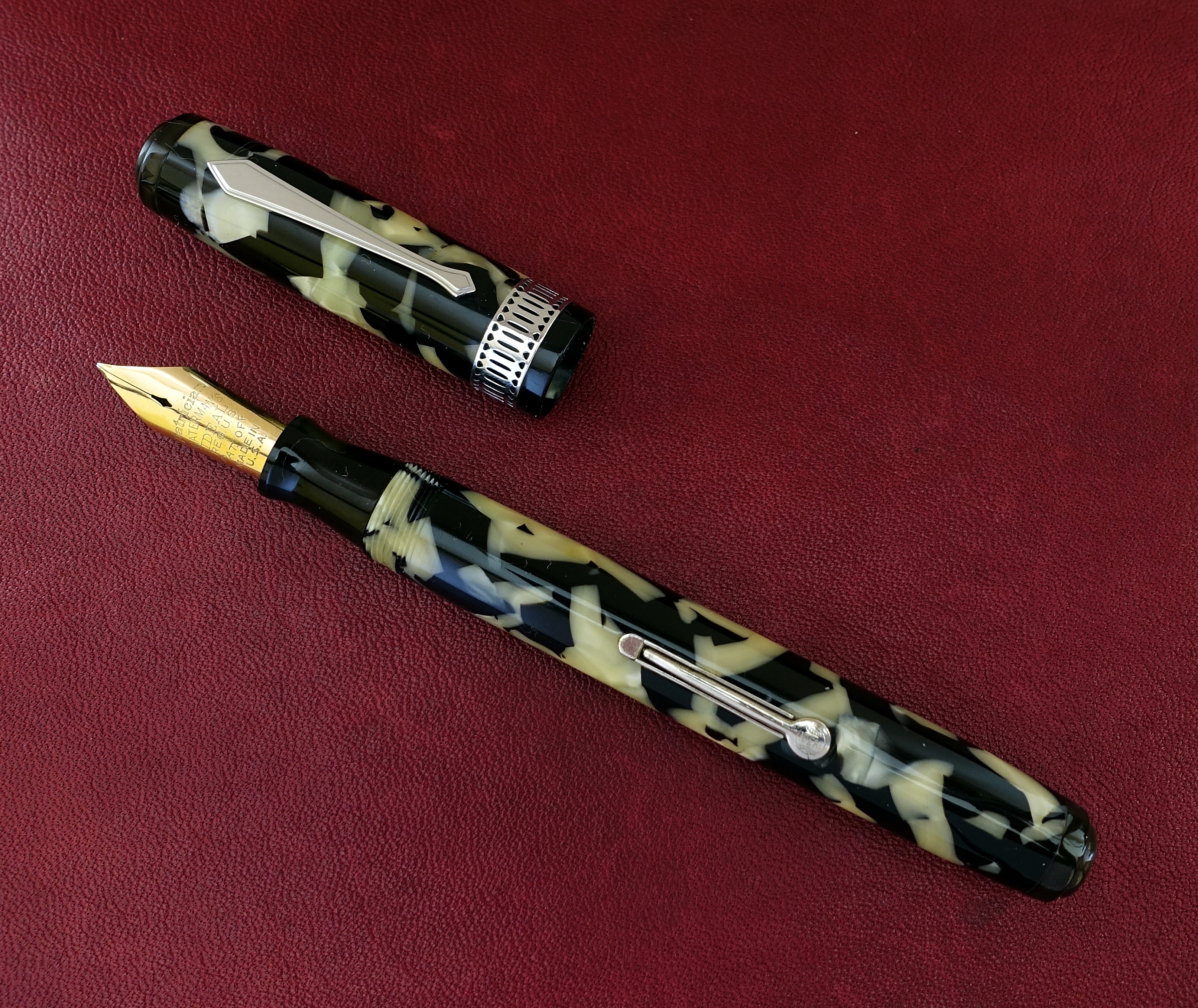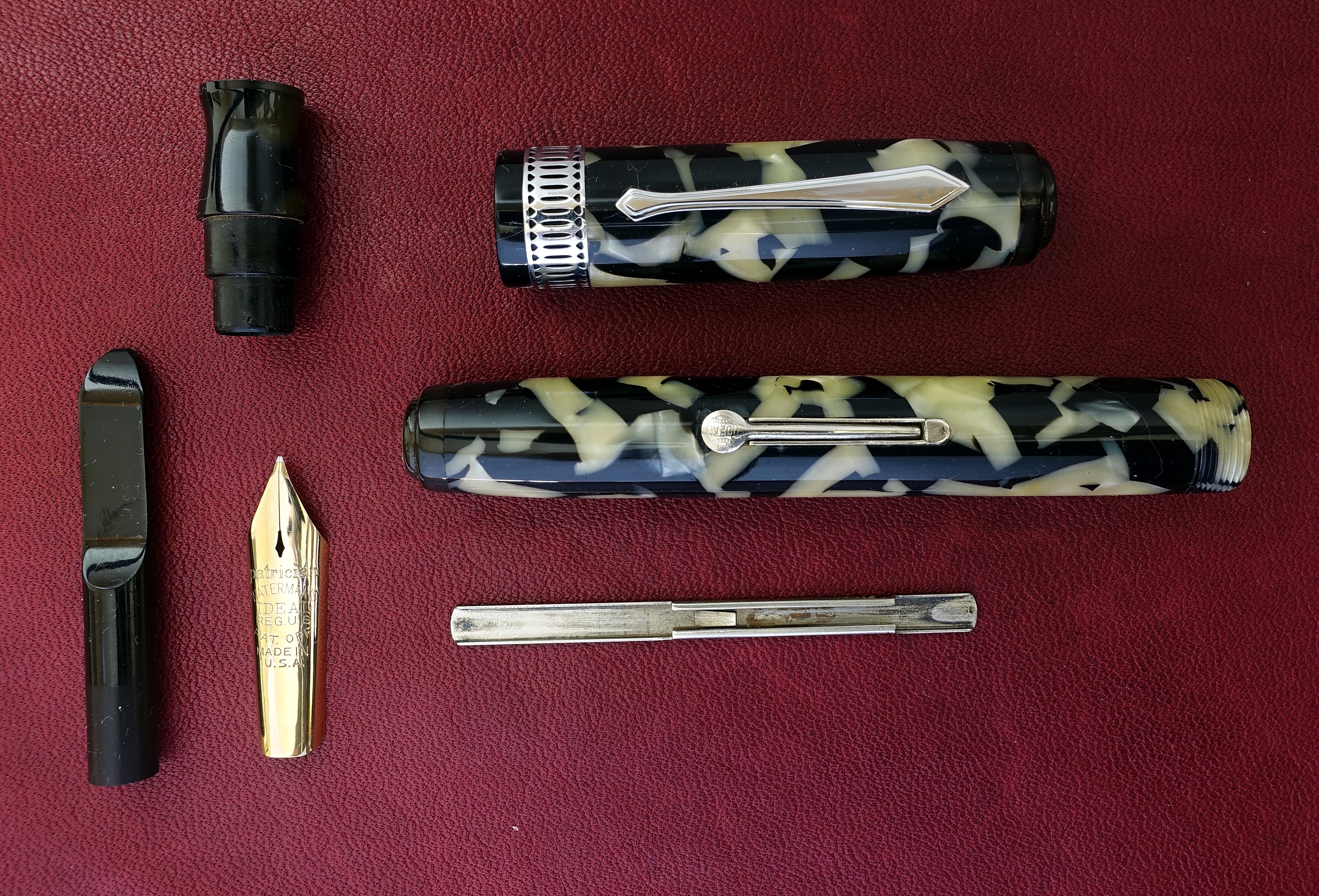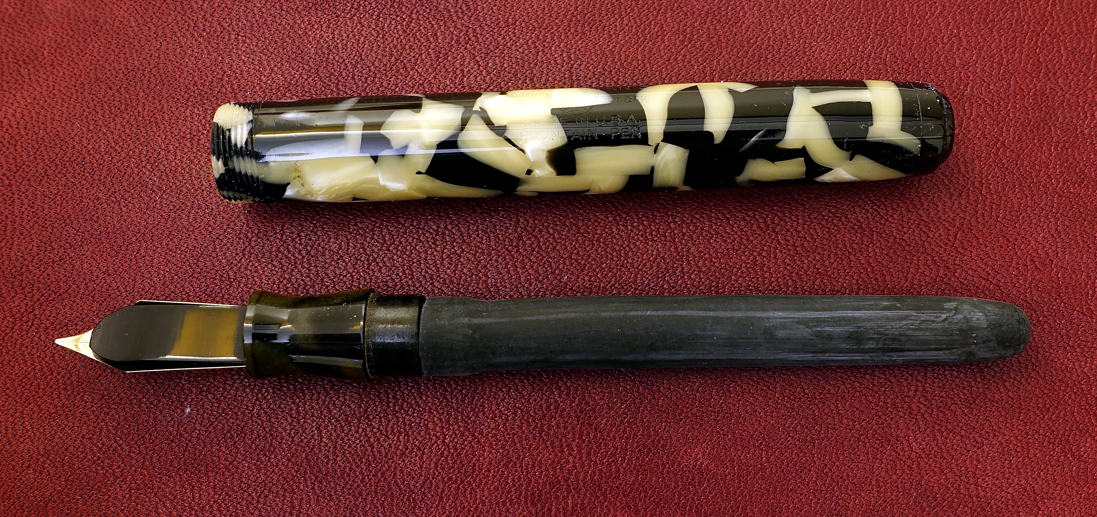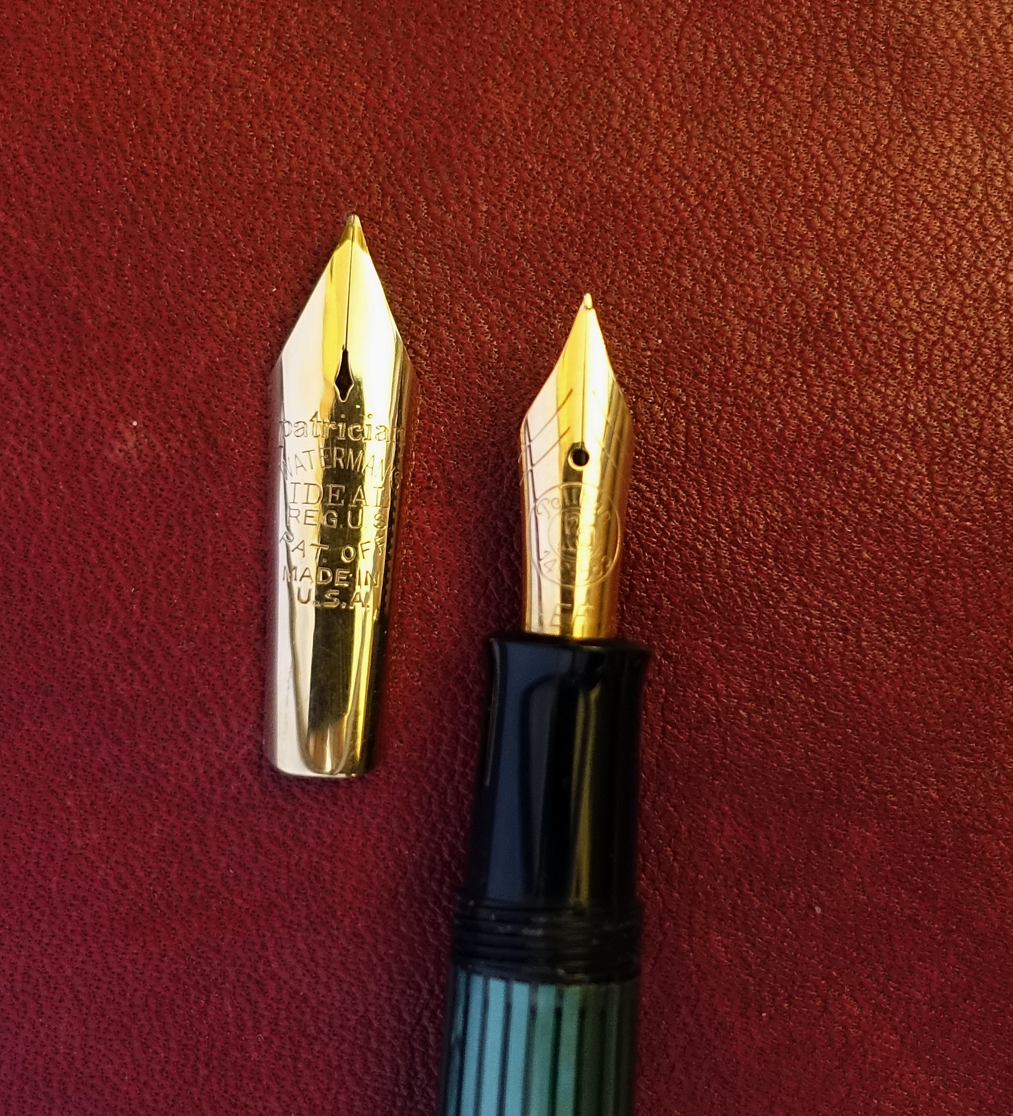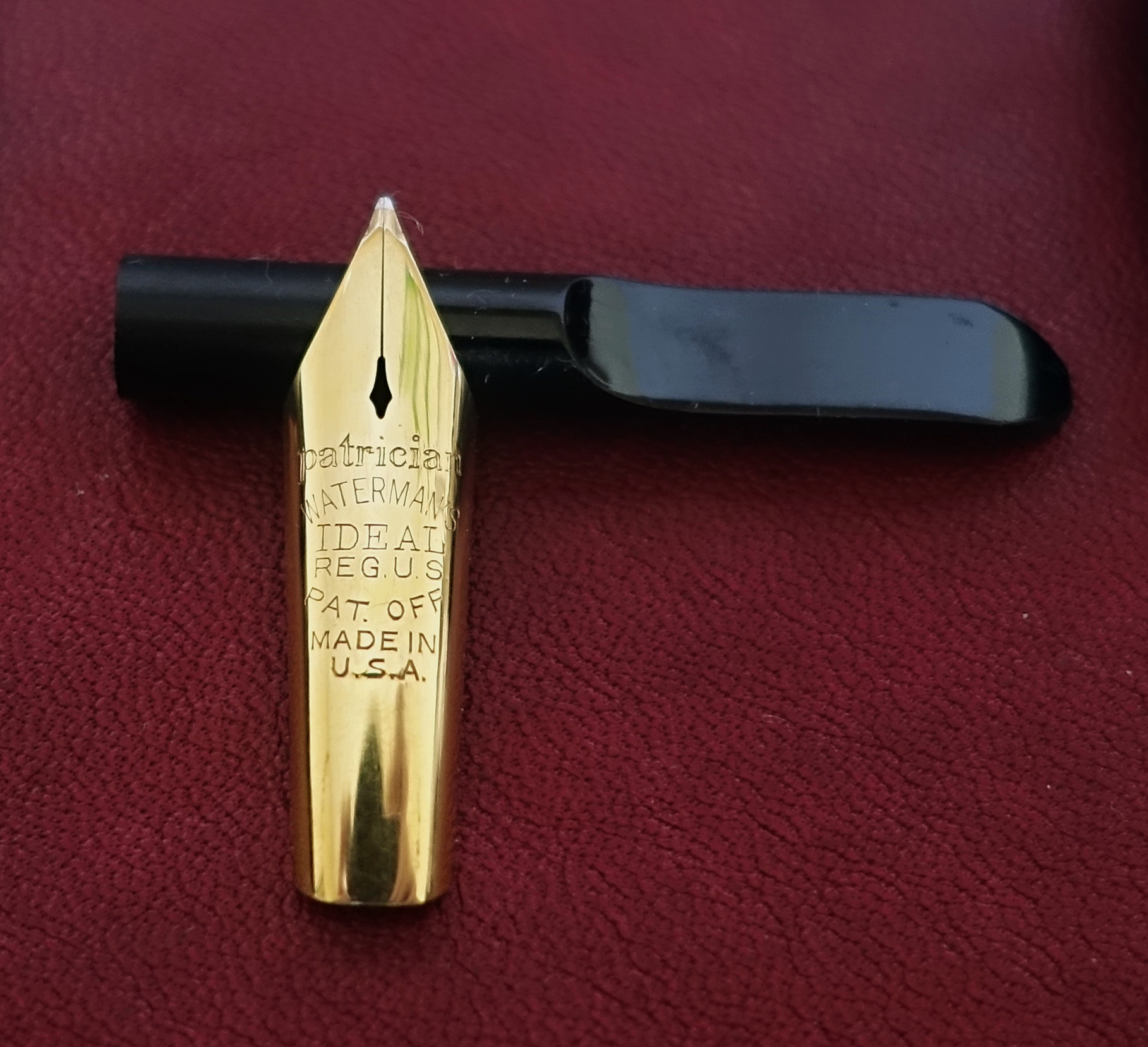 All'ultimo mercatino, ho trovato qesta stilografica, mancava della levetta di carica, estremita in ebanite fortemente ingiallite, un pennino molto grande in proporzione alla penna e, non conoscendola, ho pensato che fosse un accrocco con altri problemi nascosti, inoltre avrei dovuto revisionarla e cercare una levetta, ho lasciato stare. La fortuna ha voluto che ritornando su quella bancarella la penna fosse ancora li, con insistenza del venditore mi sono lasciato convincere a spendere i 40 euro richiesti, non accettava un solo euro di meno, mi è sembrato un'esagerazione. Arrivato a casa mi sono documentato, non conoscevo l'esistenza di una Waterman Patrician degli anni 30 .... in pratica che botta di c...
