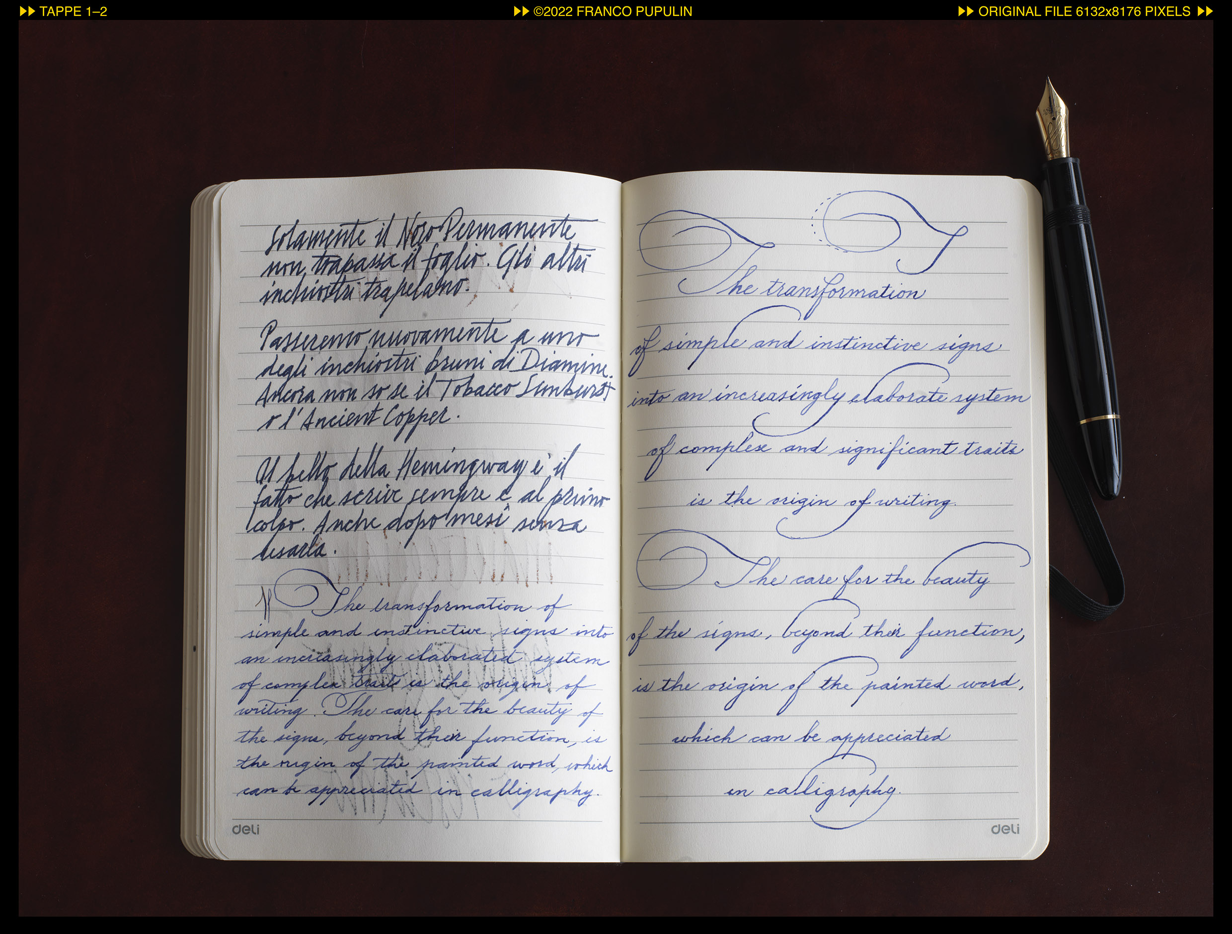 L'ho caricata con quello che considero l'inchiostro migliore per questa penna, il Montblanc Blue Permanent. Un blu saturo, che non allarga il tratto ma é scorrevole, non spiuma e, cosa per me molto importante, non trapassa su nessun tipo di carta, lasciandomi perciò molto scelta quanto ai supporti.