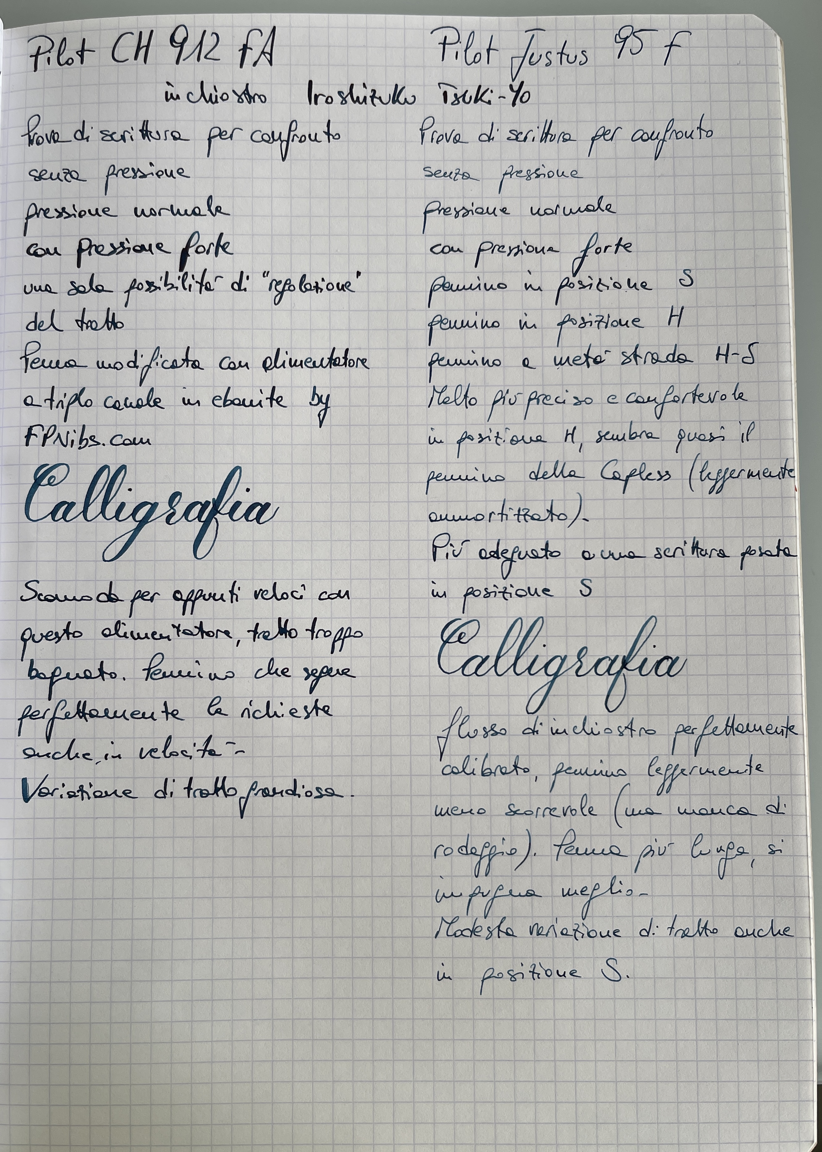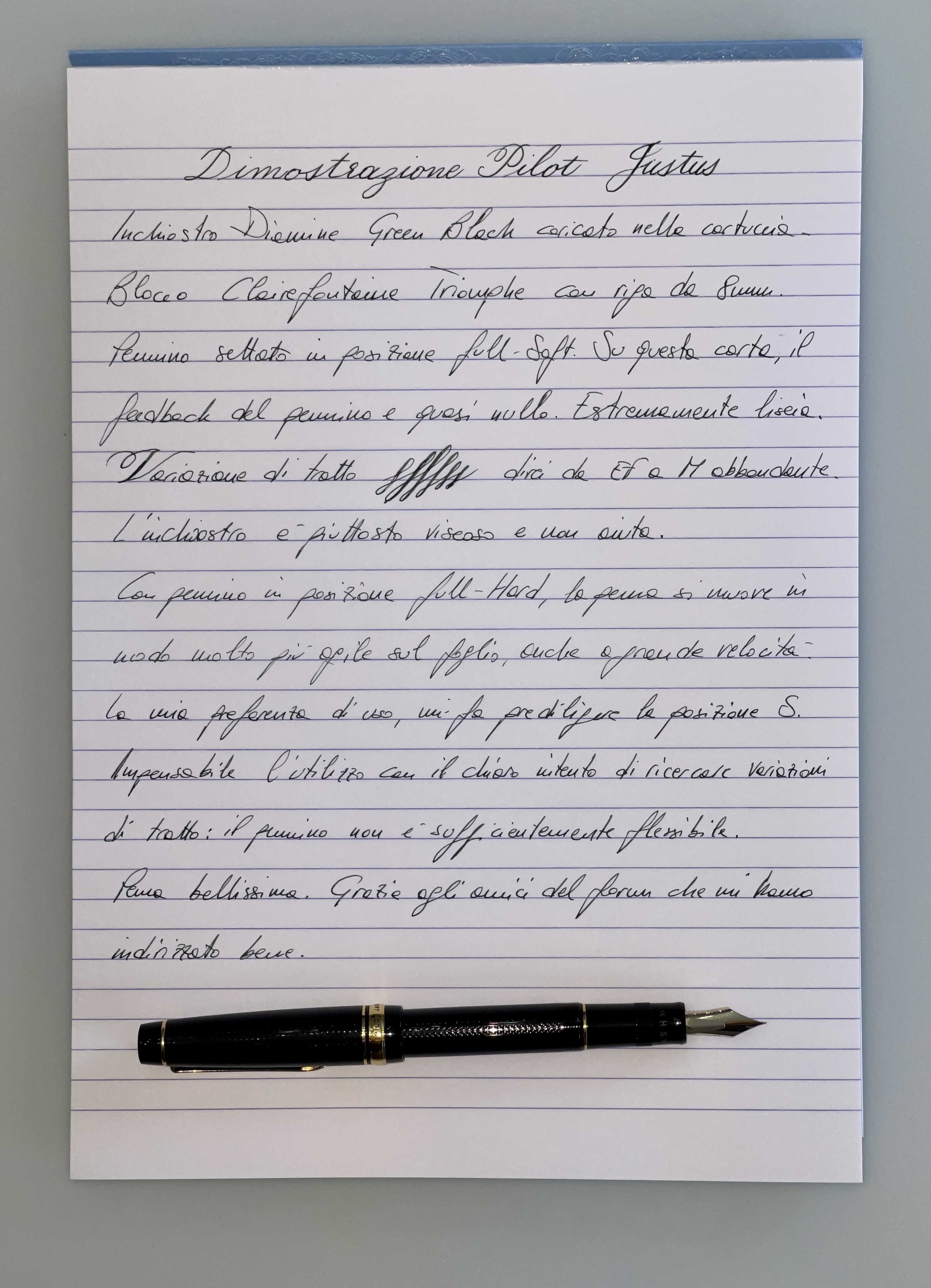Nonostante il pennino sia un Pilot F come la mia Capless, mi dà l’impressione di essere più affilato sia per il feedback (la Capless scivola senza restituire nessuna vibrazione/rumore fino al cambio di direzione, mentre la Justus ha un leggero fruscio “graffiante”), sia per il tratto (per continuare con la Capless, posso usare sulla Justus qualsiasi inchiostro e avere un tratto come quello della Capless con l’inchiostro X-Feather che stringe di quasi una taglia).