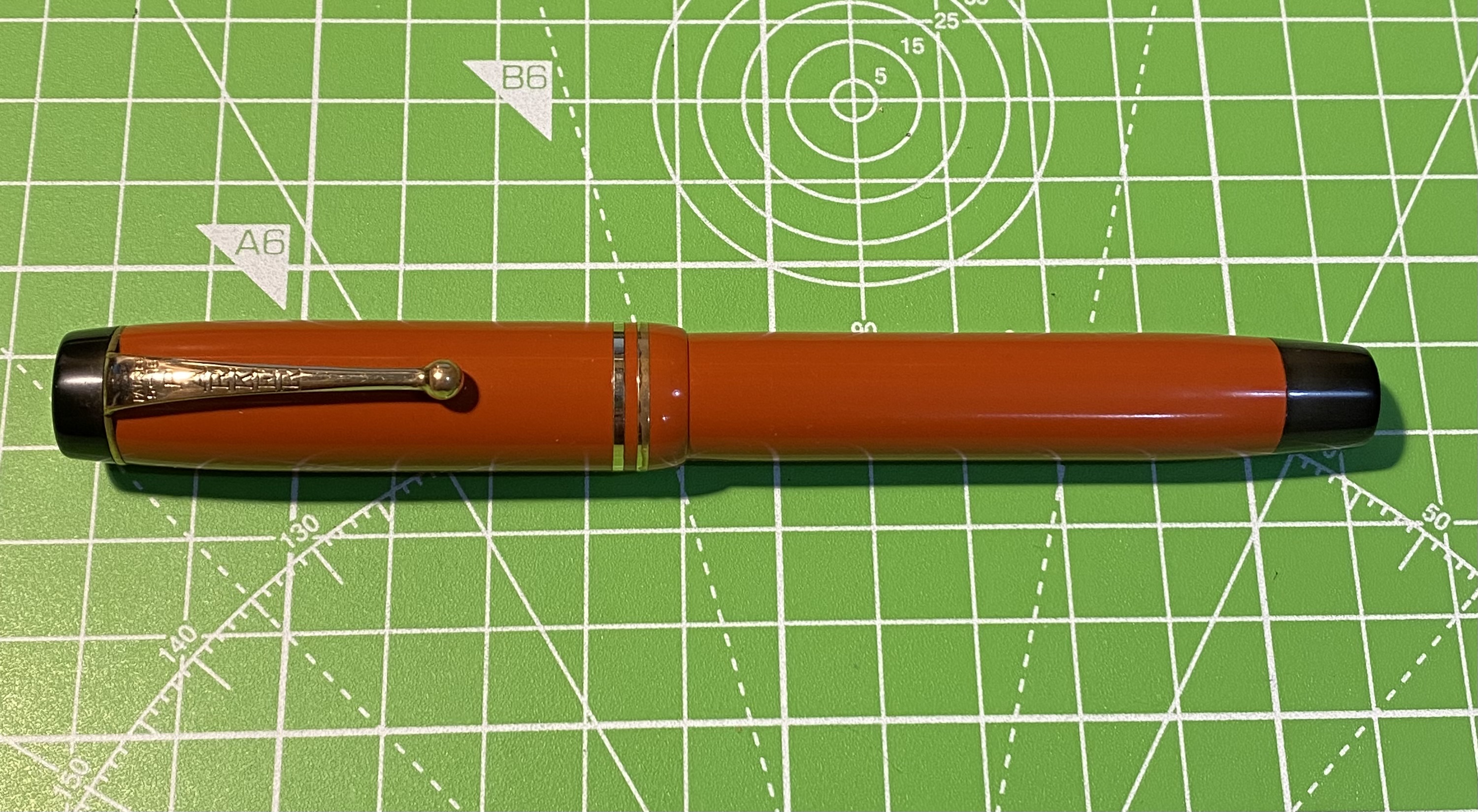 Ma veniamo al mio modello di Big Red. Come mia prima impressione, se mi fosse messo un foglio di carta davanti e mi fosse richiesto di disegnare a memoria una penna stilografica, disegnerei proprio questa silhouette: un cilindro per il cappuccio ed uno per il fusto. Proprio l’essenza stessa della stilografica
