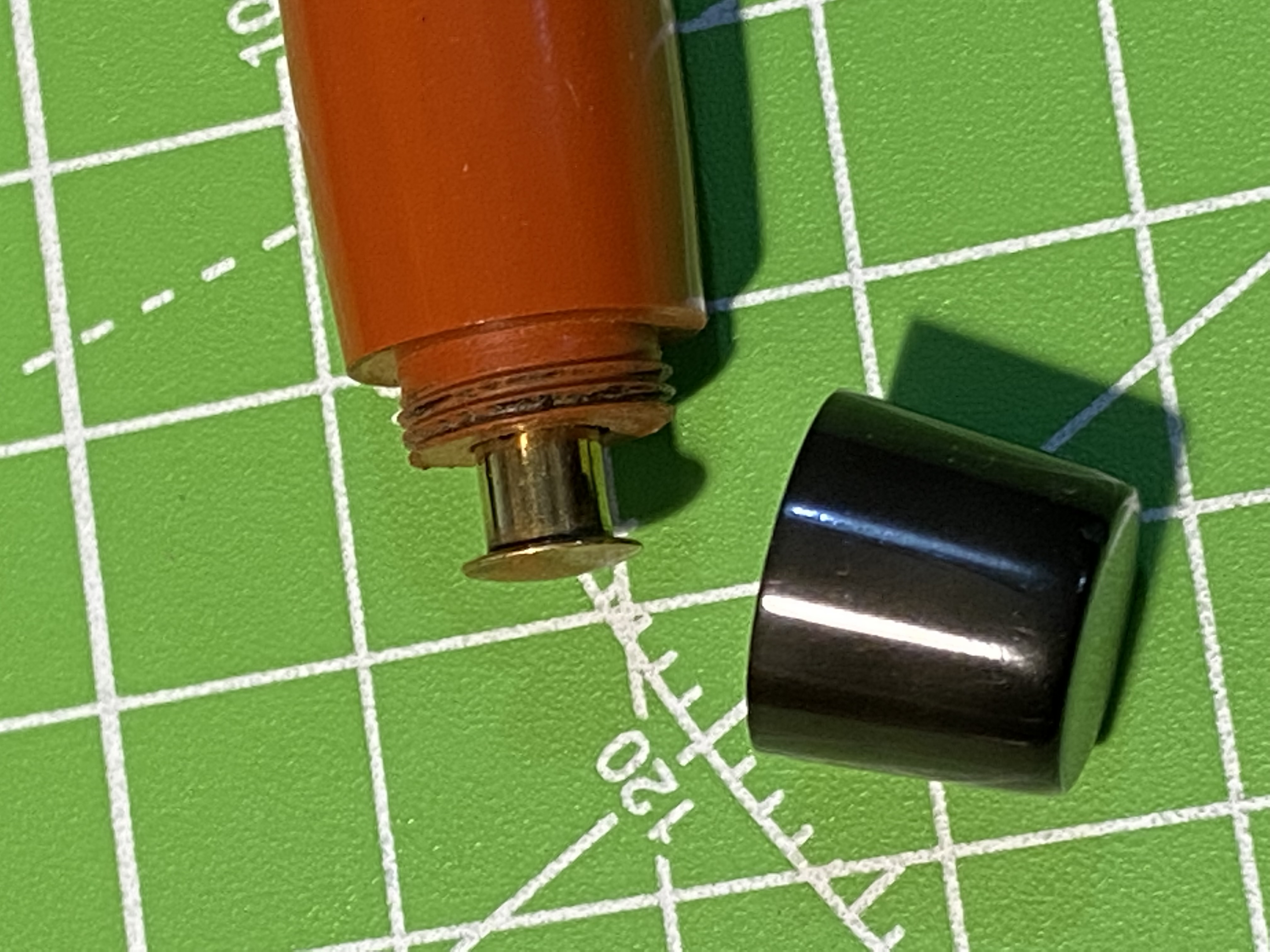 Il fondello cieco si può svitare rilevando il meccanismo di carica a pulsante premendo il quale si flette internamente una barretta metallica che a sua volta schiaccia un serbatoietto di gomma. Rilasciando il pulsante il serbatoietto si ridistende aspirando l’inchiostro. Questo meccanismo fu una grande innovazione tecnica per la sicurezza della penna, perché tutte le altre penne di allora avevano un’apertura sul fusto per azionare il meccanismo per premere il serbatoio di inchiostro, una levetta laterale o la mezzaluna del crescent filler. Nella Parker invece il fusto era intero ed il fondello avvitato faceva da tappo quindi.. qualunque perdita interna di inchiostro dal sacchetto restava nella penna