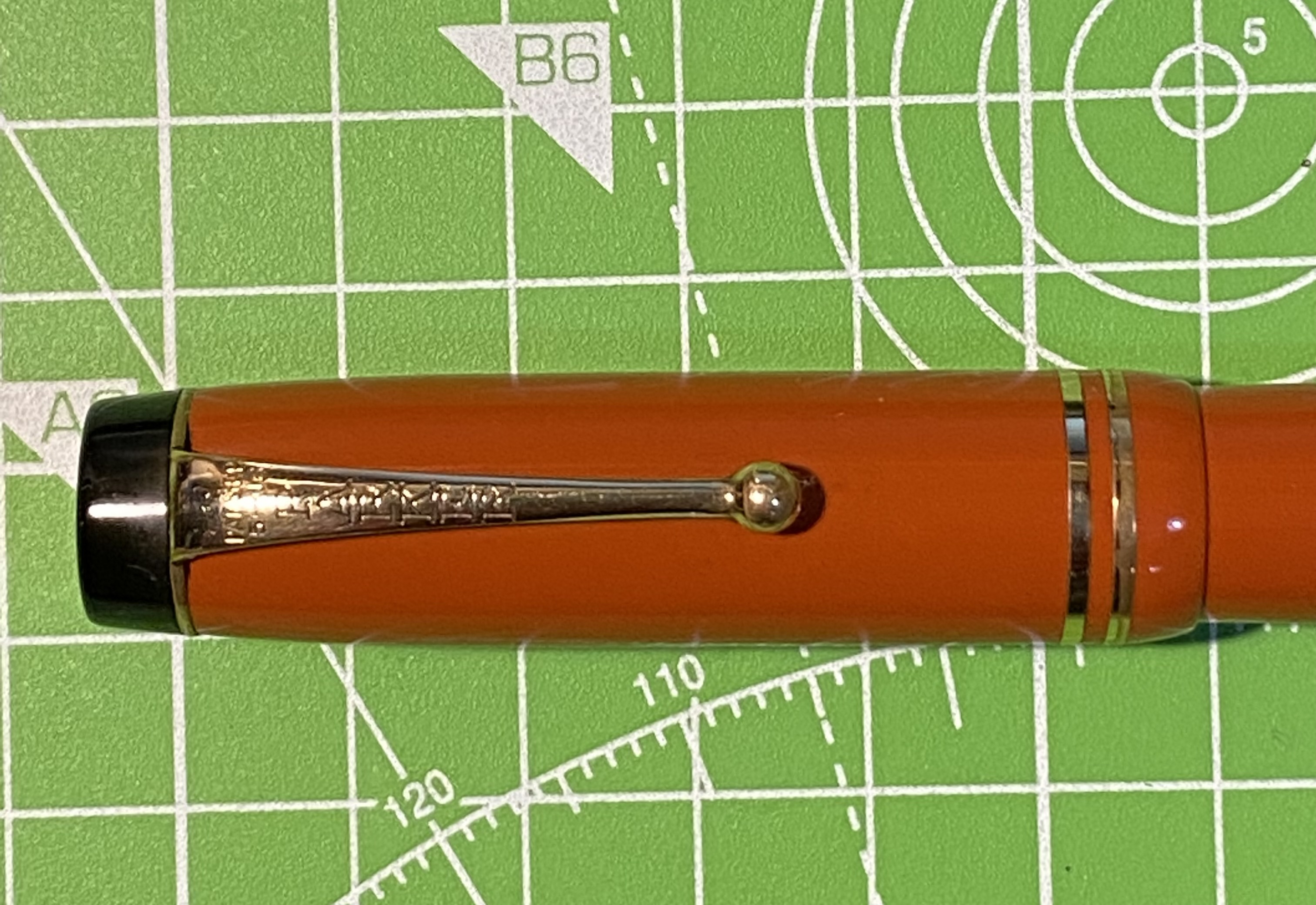 Sul cappuccio notiamo le due fascette di rinforzo e molto vicino alla sommità troviamo la clip con terminale a pallina. La clip a freccia verrà introdotta solo successivamente col conosciutissimo modello di penna che sostituirà la Duofold come best seller e della quale non faccio qui il nome, (tanto tutti voi lo conoscete anche meglio di me)..