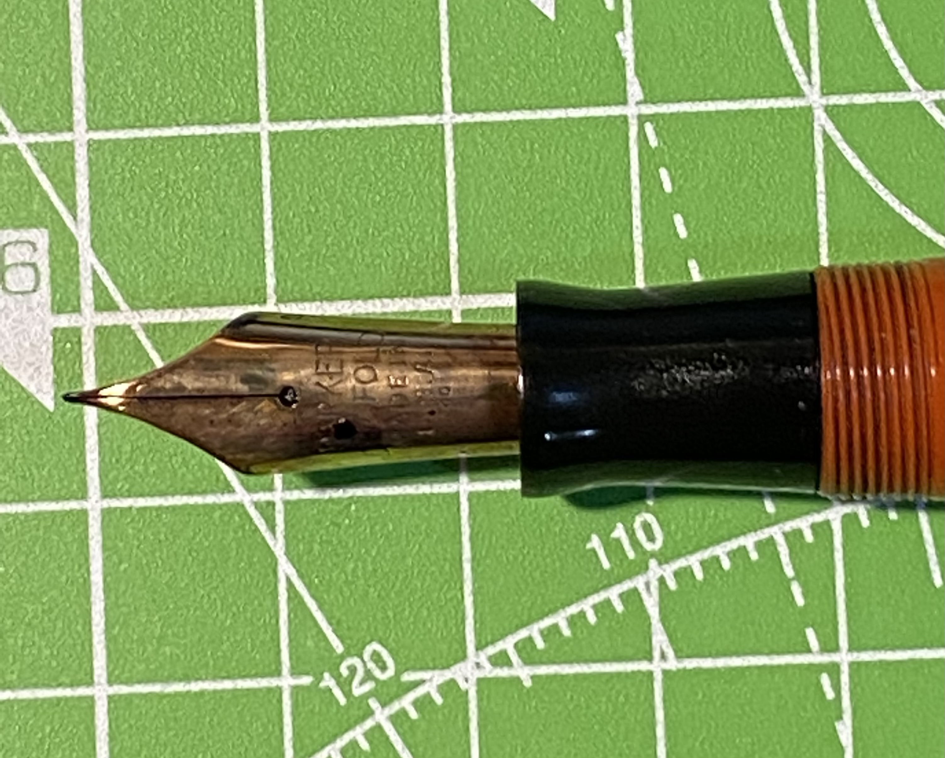 Probabilmente mi viene da pensare che il vecchio proprietario fosse un poco maldestro e frettoloso.. oggi per noi collezionisti queste penne sono preziose, ma allora erano dei mezzi di scrittura (seppure prestigiosi come questo) e riempiendo la penna dal calamaio spingendo il pulsante di carica il proprietario puntellava sul fondo della bottiglia il pennino causandone il piegamento.. chissà..