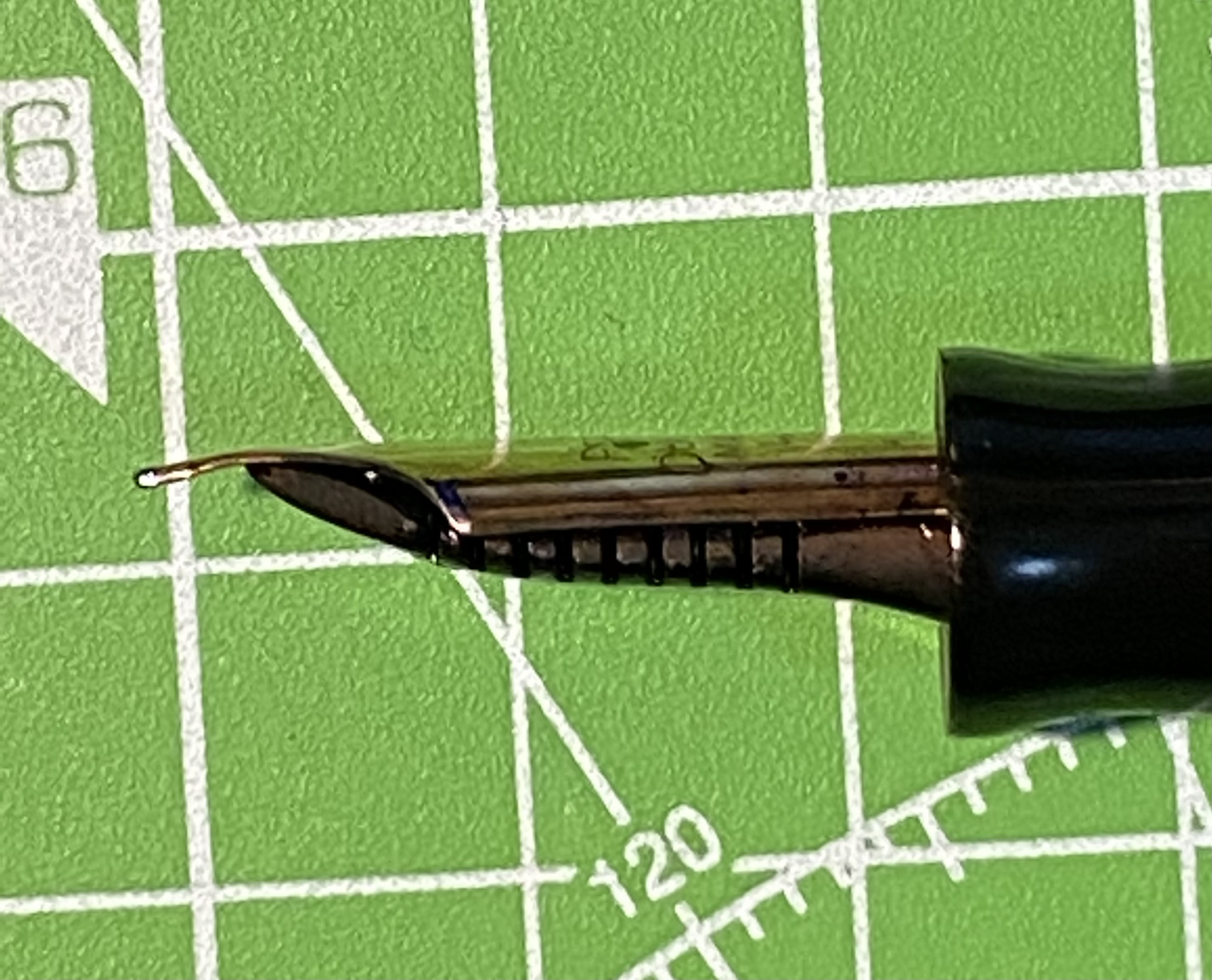 Il pennino di questa signora si presenta piegato verso il basso, facendolo quasi rassomigliare ad un pennino di tipo posting. Forse un trauma da impatto … ma non credo, sembra più flessione da sforzo.