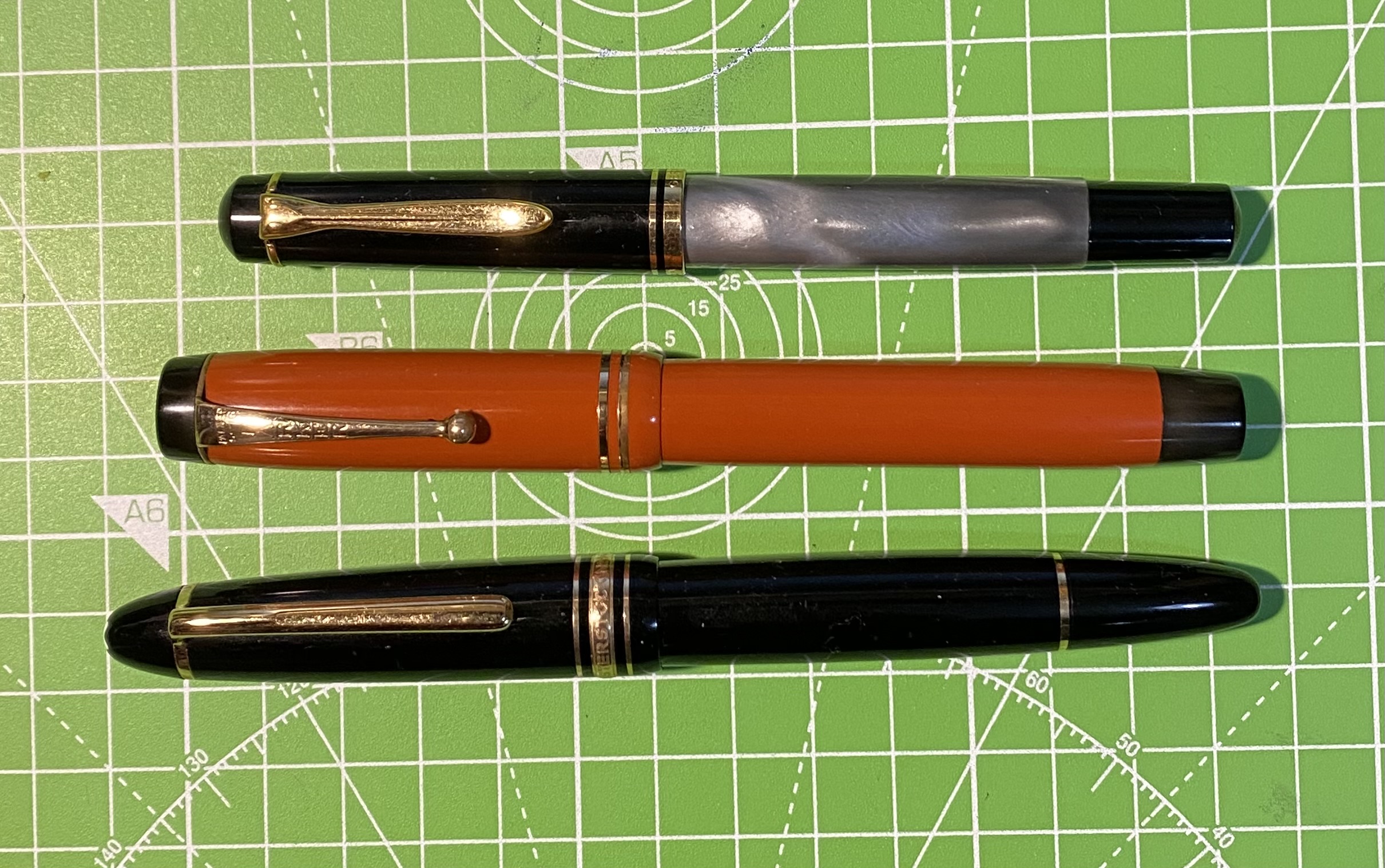 Vediamola ora a confronto con una penna di dimensioni importanti come la Montblanc 146 le Grand ed una abbastanza piccola come una Pelikan M200. Vediamo che si posiziona nel mezzo, risultando dunque una penna che in teoria ancora si potrebbe portare appresso nella tasca e che comunque ha una certa dimensione per farsi notare